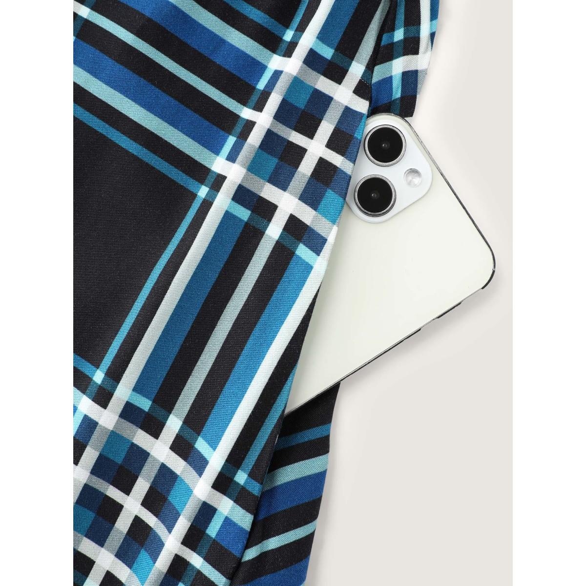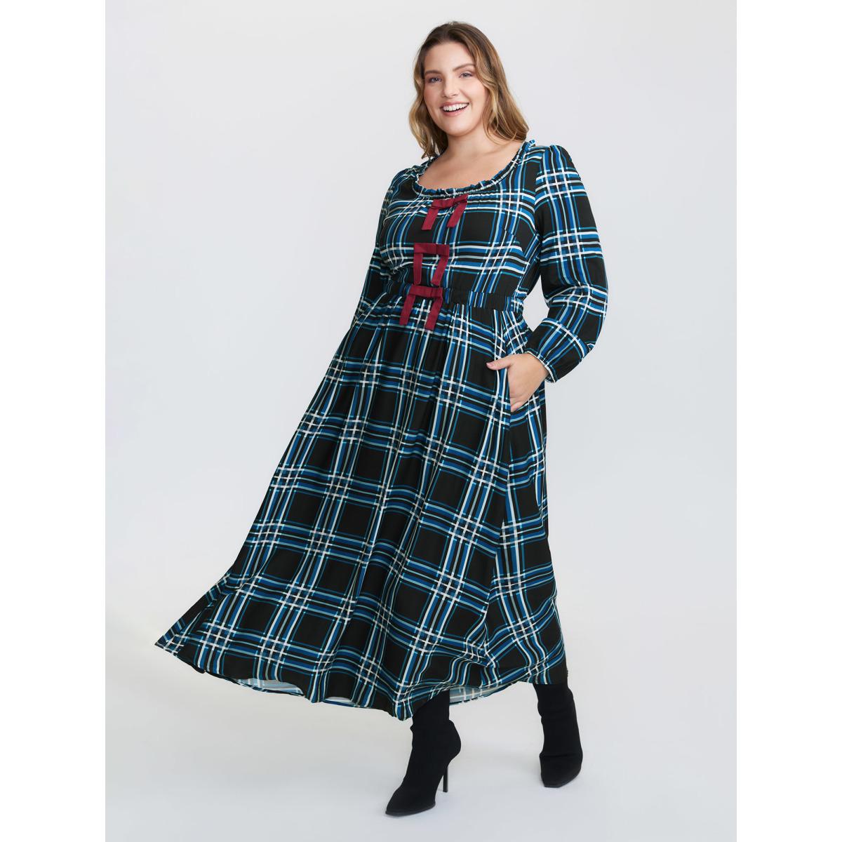 Plus Size Plaid Pattern Bowknot Pockets Maxi Dress DarkGreen Women Leisure Tie knot U-neck Long Sleeve Curvy BloomChic 10/M