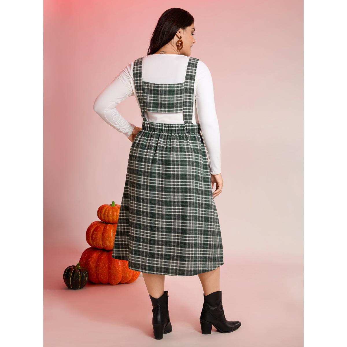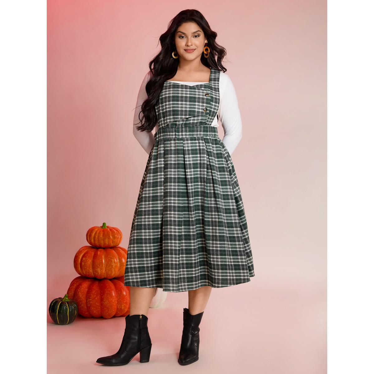 Plus Size Plaid Pleated Suspender Skirt Adjustable Midi Dress DarkGreen Women Timeless Pleated Non Sleeveless Curvy BloomChic 10/M