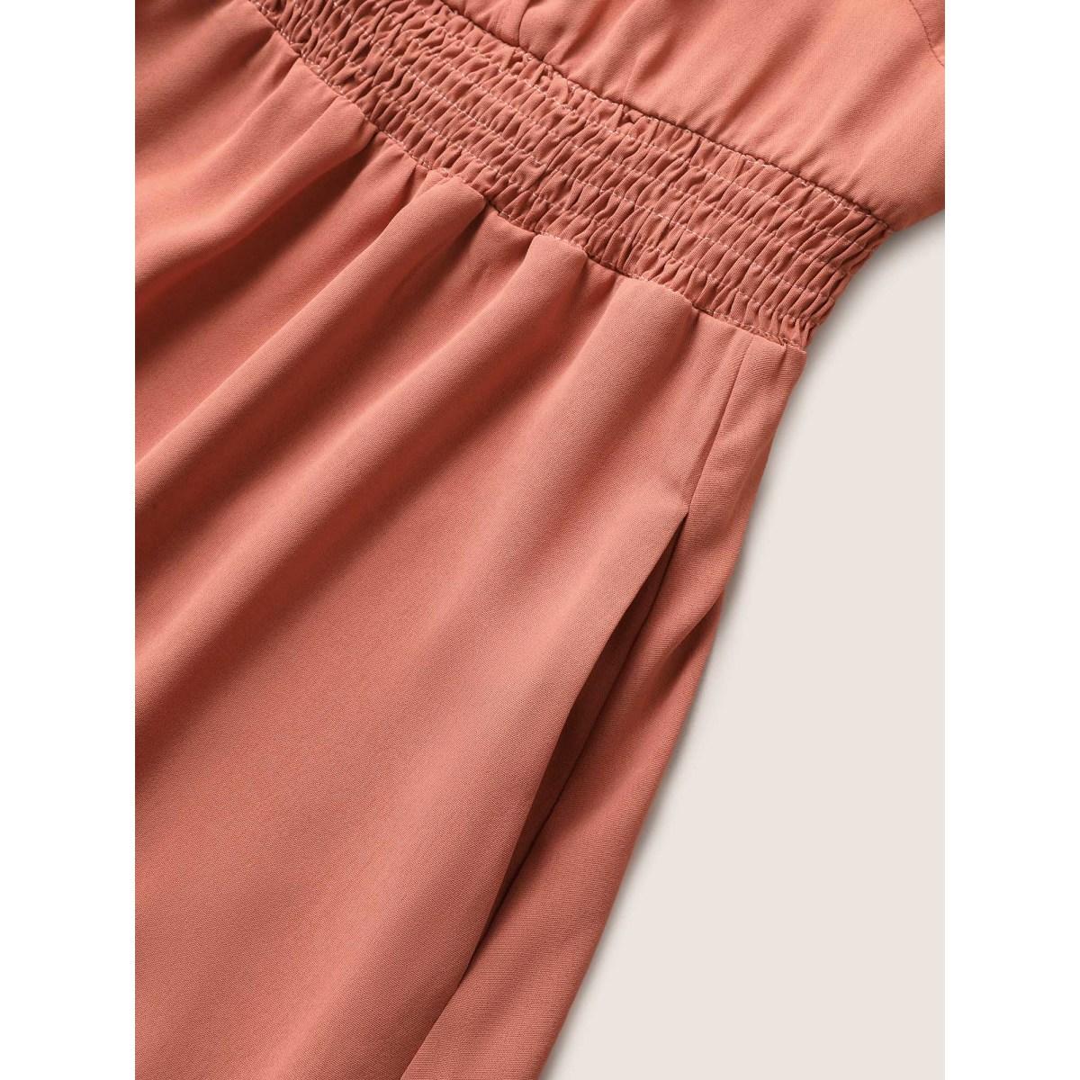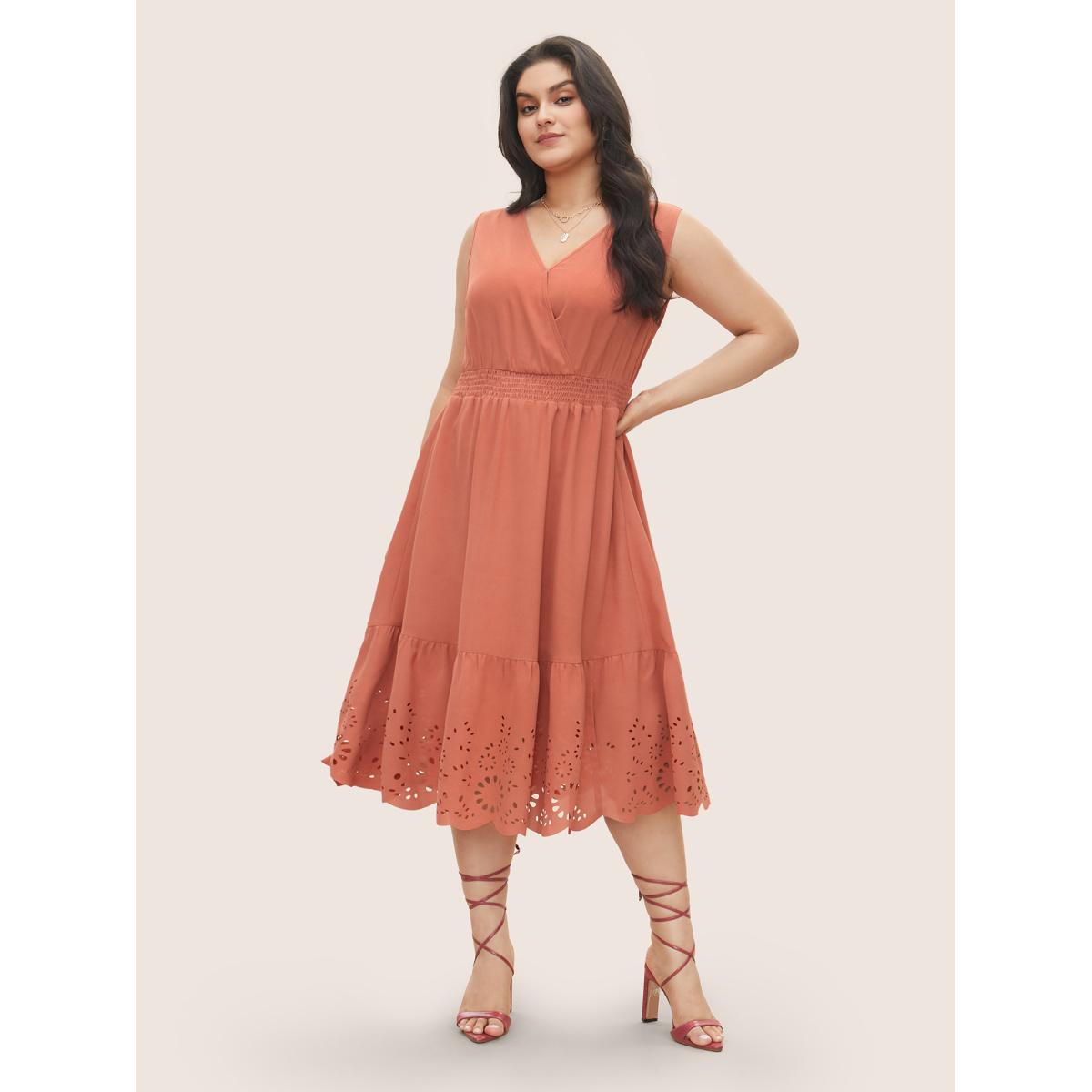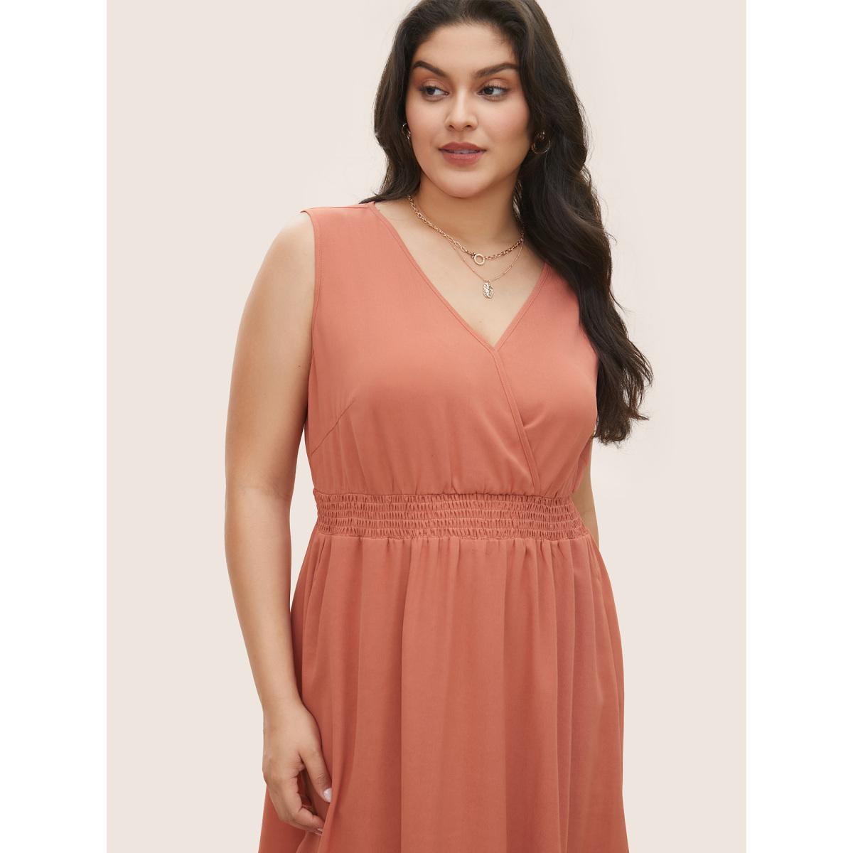 Plus Size Plain Laser Cut Shirred Wrap Tank Dress Coral Women Elegant Overlapping Overlap Collar Sleeveless Curvy Midi Dress BloomChic 22-24/3X