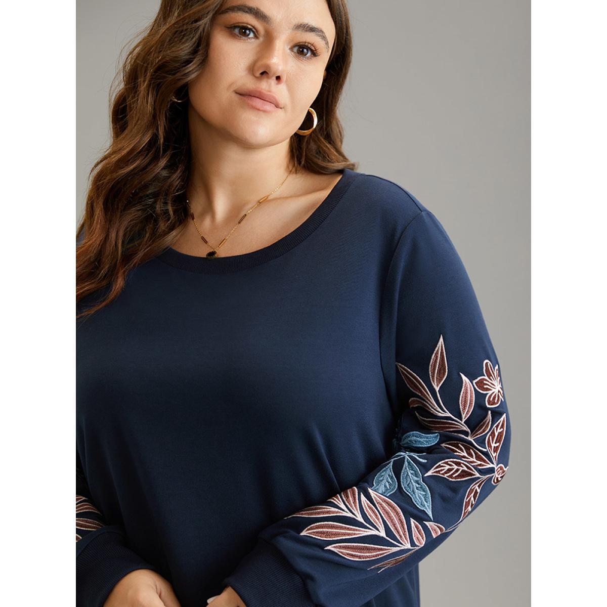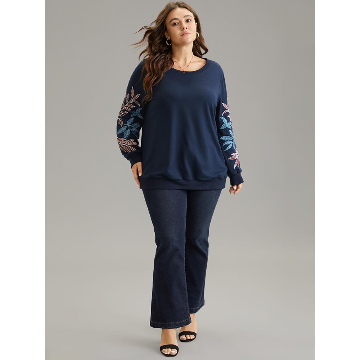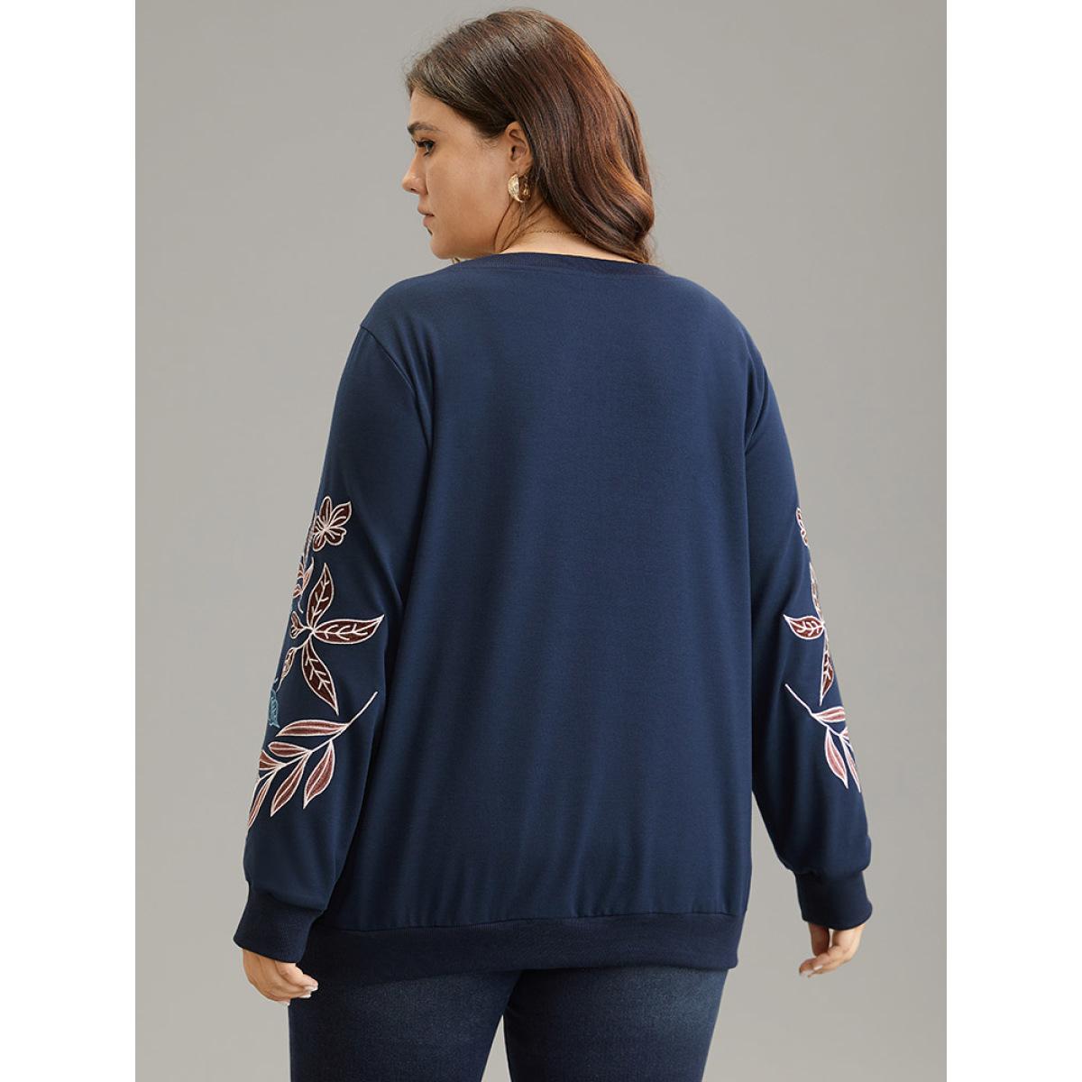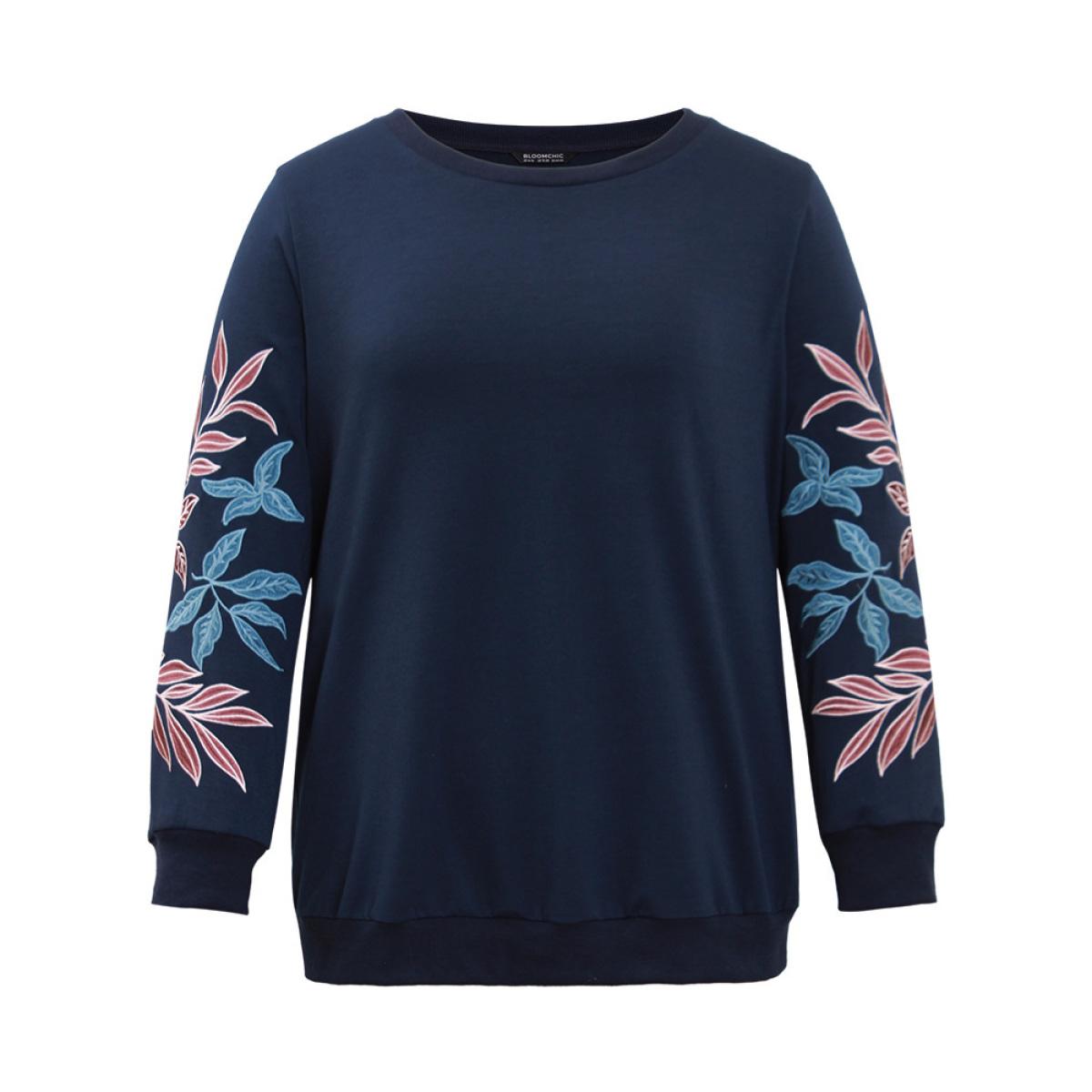 Plus Size Plants Embroidered Rib Knit Crew Neck Sweatshirt Women Navy Elegant Rib Knit Round Neck Dailywear Sweatshirts BloomChic 28/5X