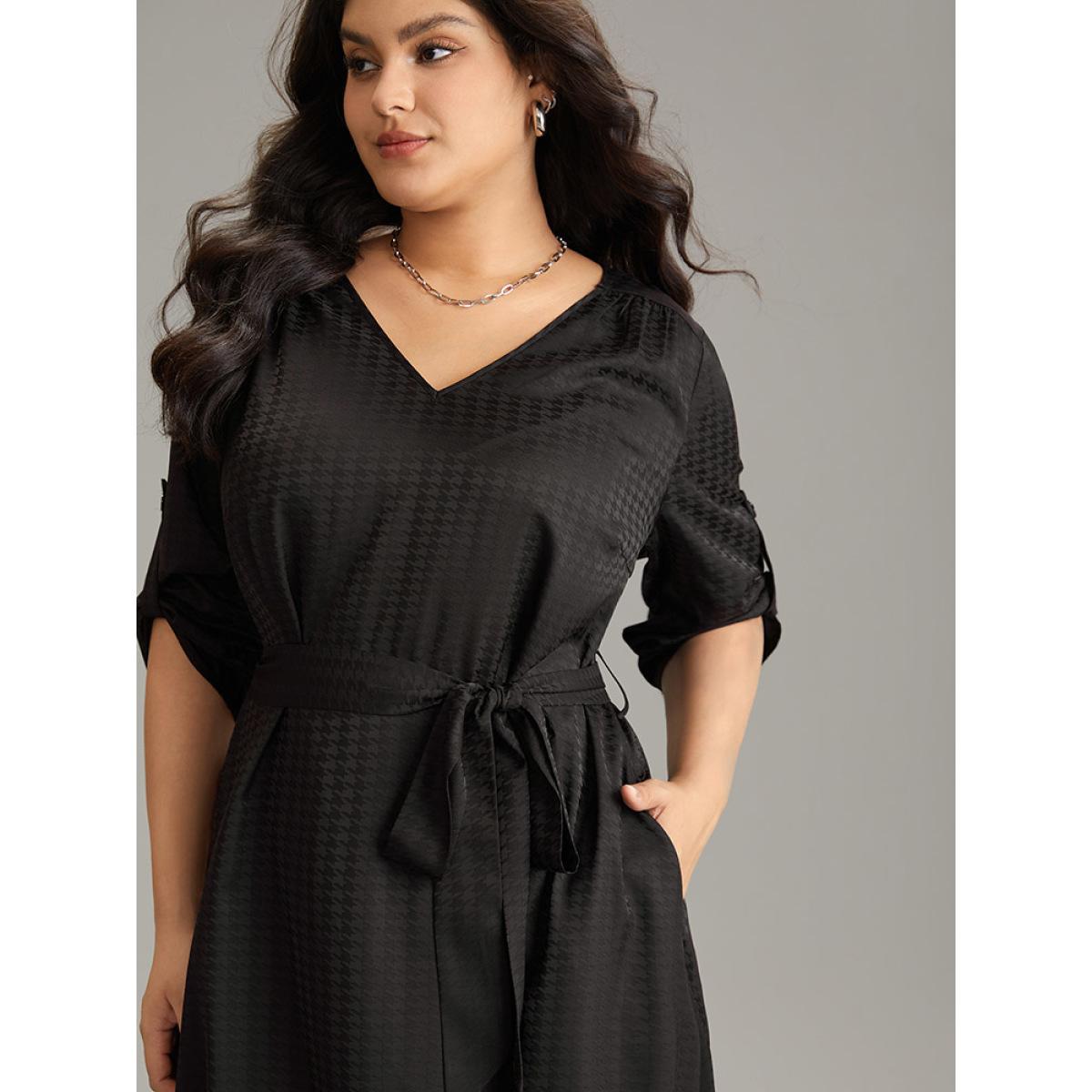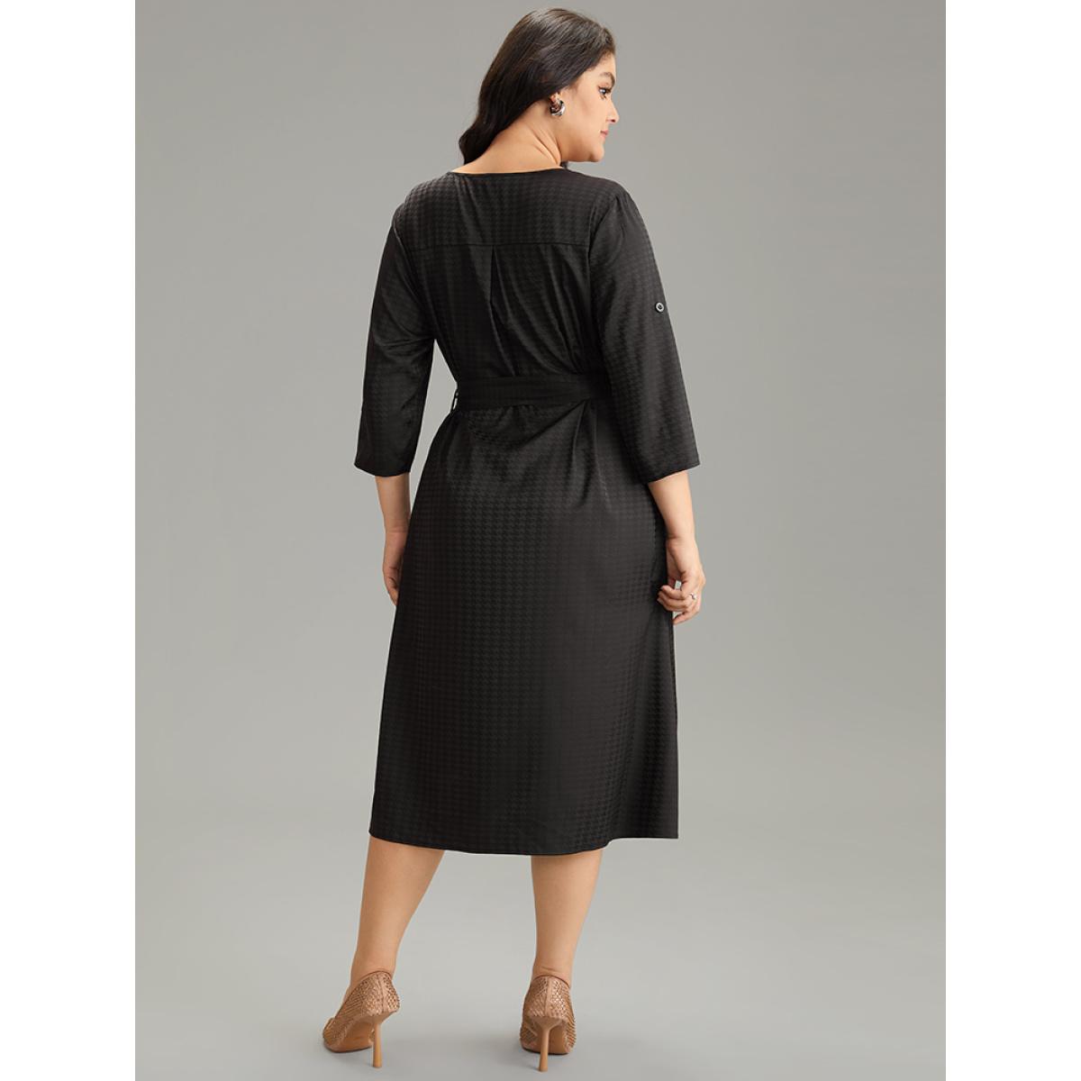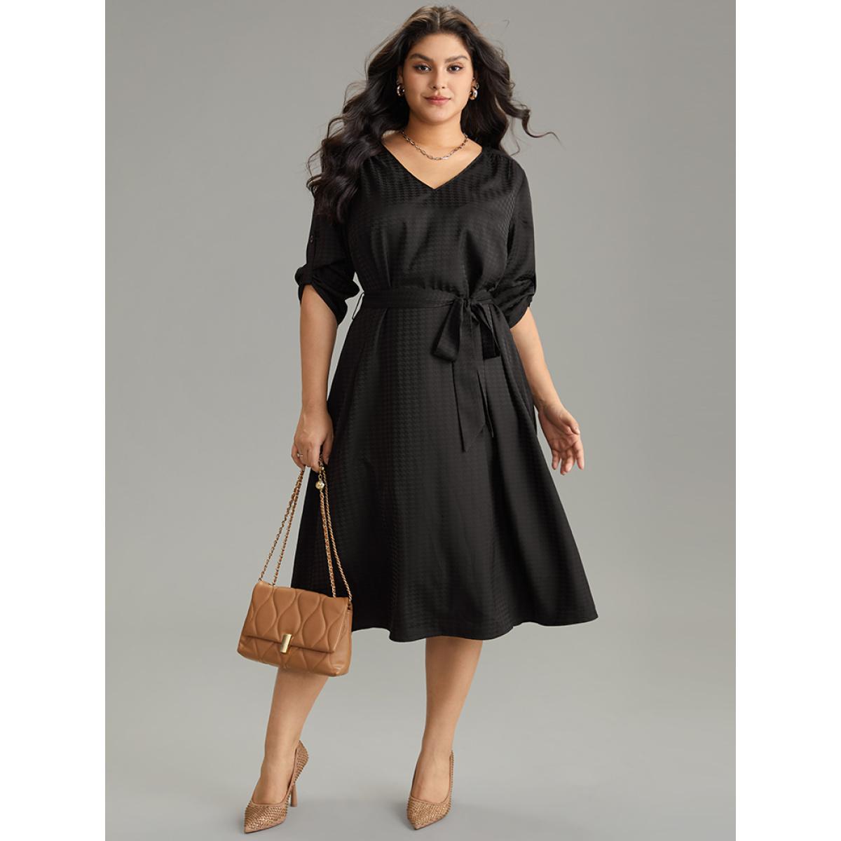 Plus Size Plisse Roll Tab Sleeve Jacquard Pocket Belted Dress Black Women Office Texture V-neck Elbow-length sleeve Curvy Midi Dress BloomChic 30/6X