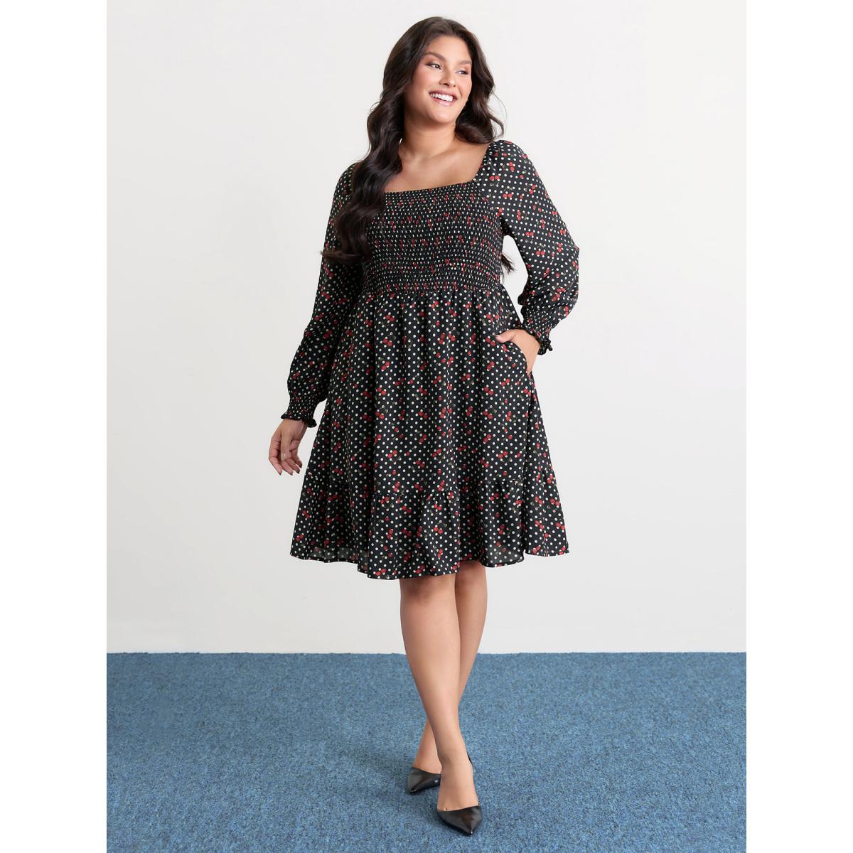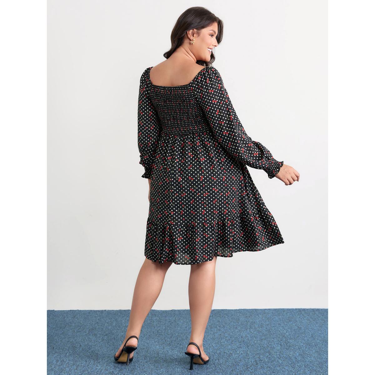 Plus Size Polka Dots Cherry Shirred Bodice Knee Dress Black Women Romantic Square Neck Extra Long Sleeve Curvy BloomChic 12/L
