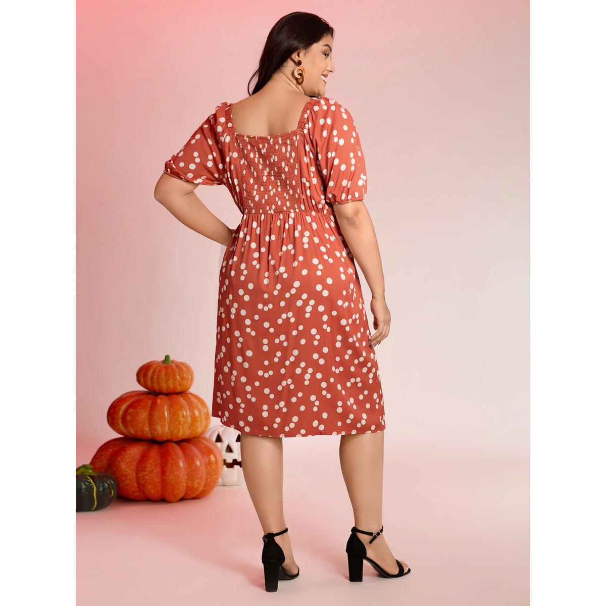 Plus Size Polka Dots Gathered Bust Pockets Midi Dress Amber Women Timeless Heart neckline Short sleeve Curvy BloomChic 26/4X