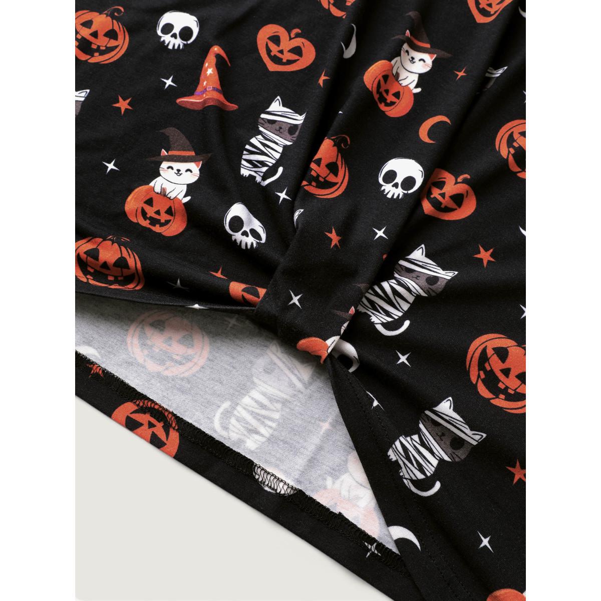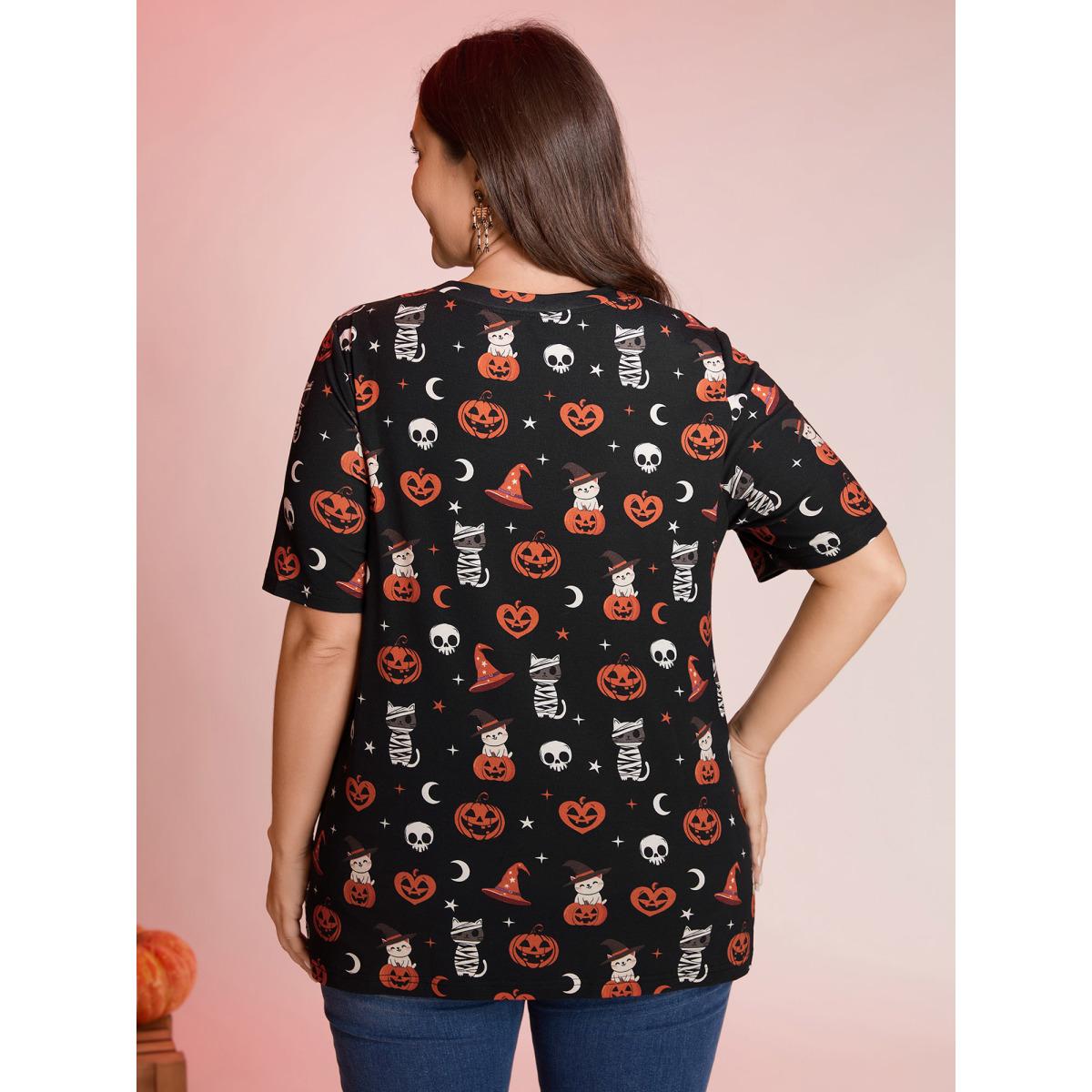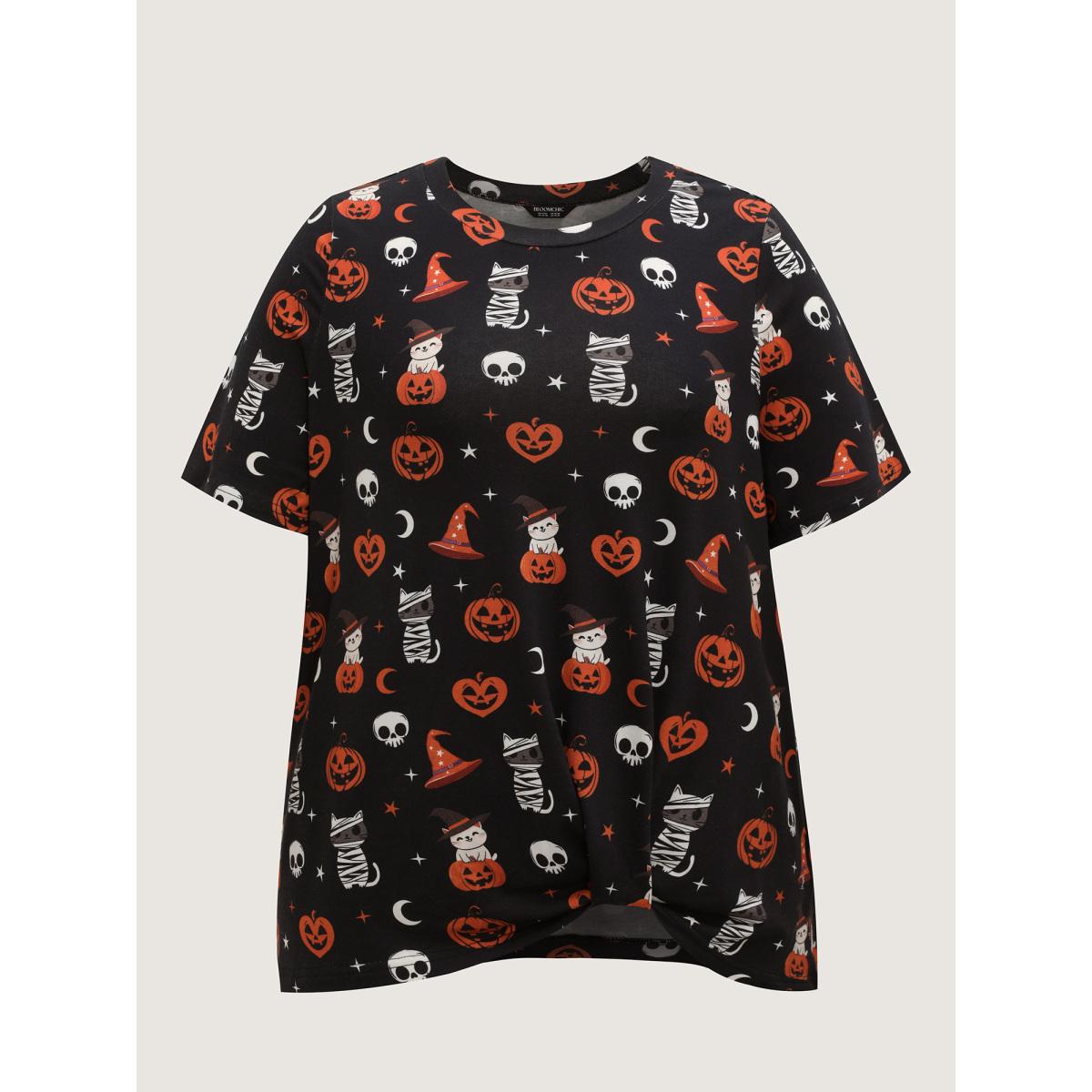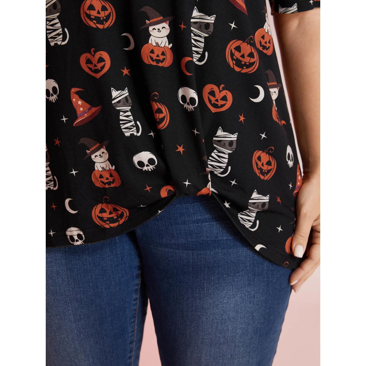 Plus Size Pumpkin Everywhere Print Overlap Hem T-Shirt Black Women Leisure Non Graphic-Halloween Round Neck Casual T-shirts BloomChic 26/4X