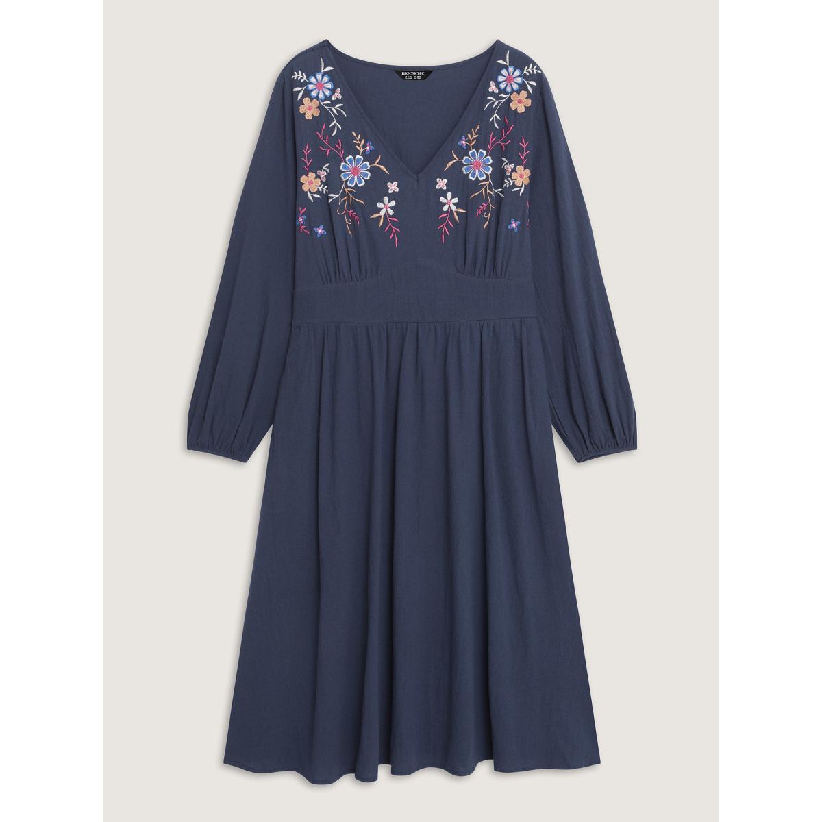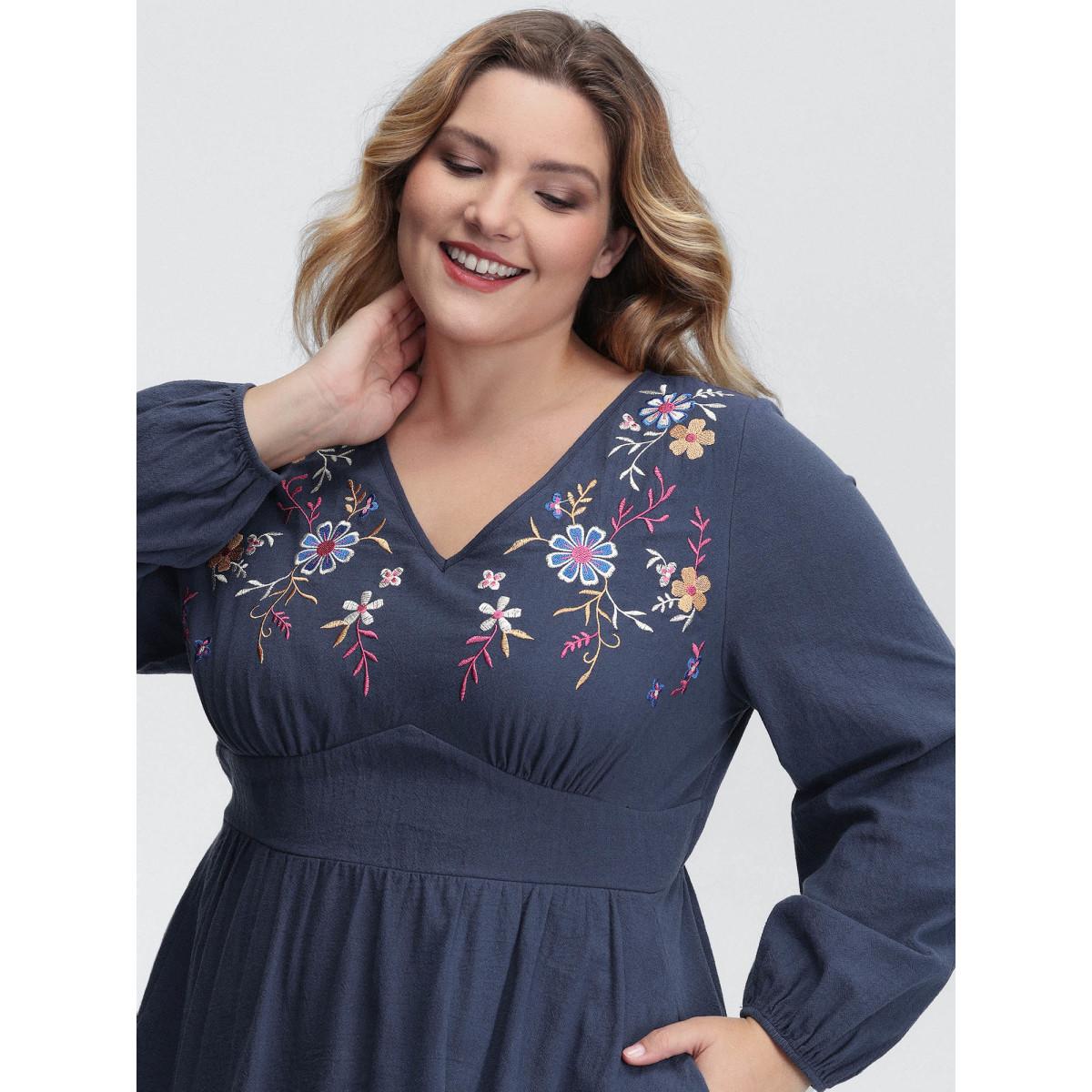 Plus Size Pure Cotton Embroidered Neckline Midi Dress Indigo Women Leisure Gathered V-neck Extra Long Sleeve Curvy BloomChic 30/6X