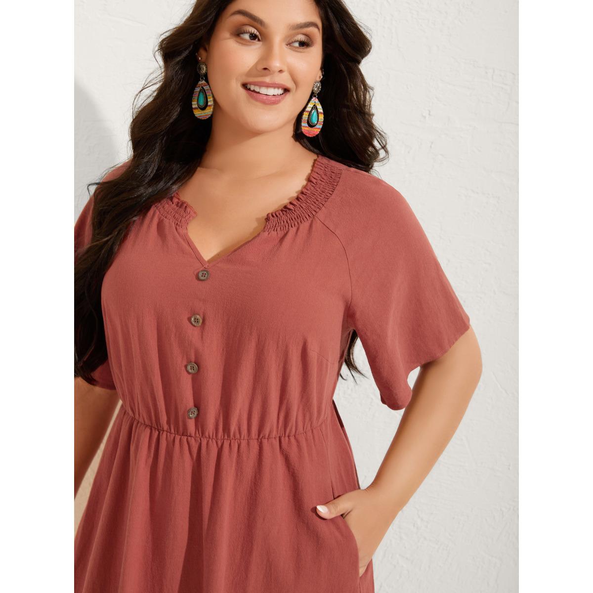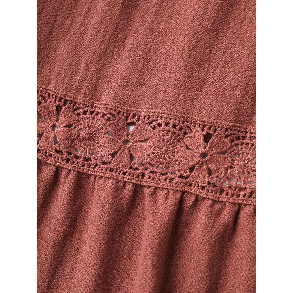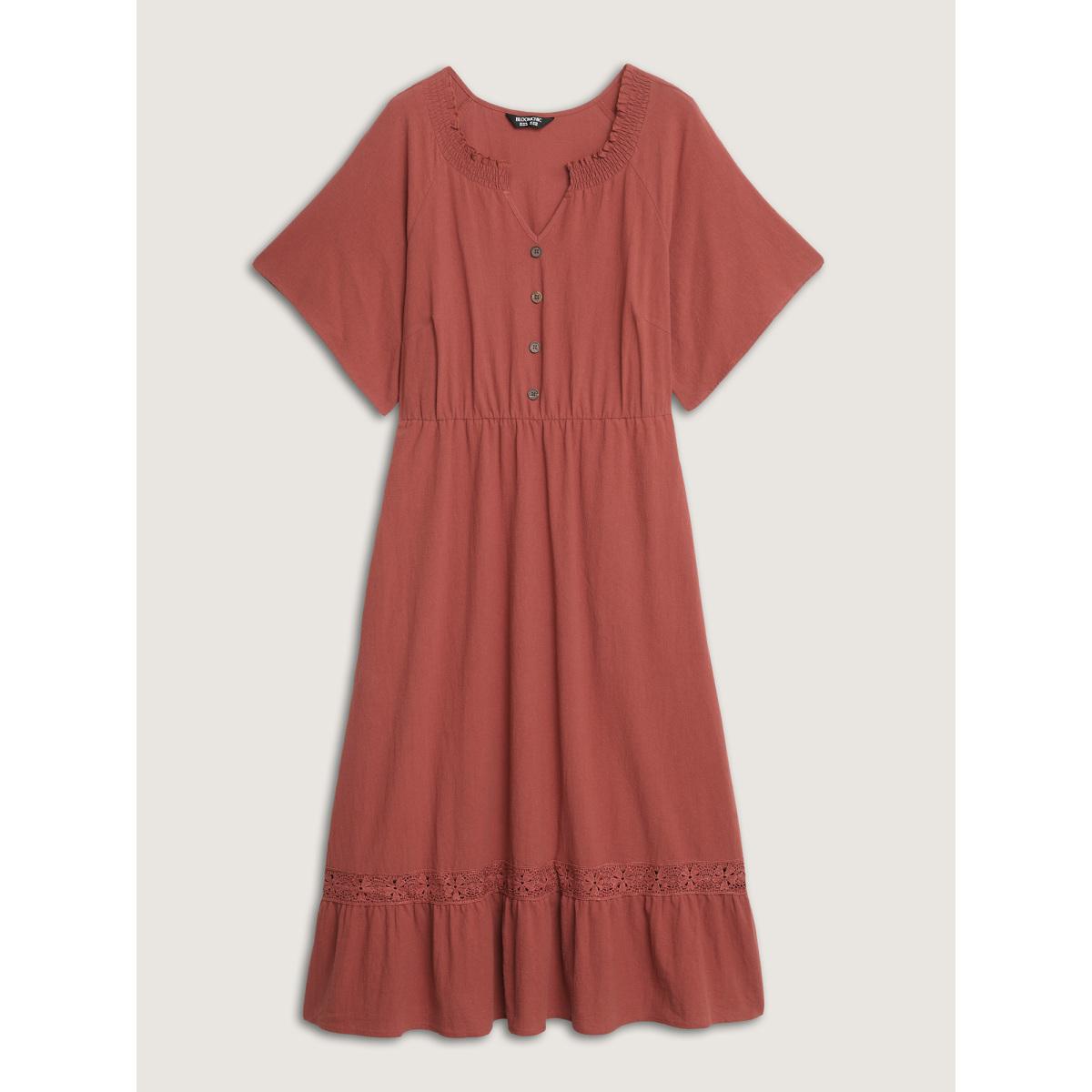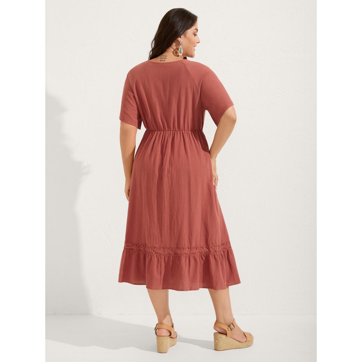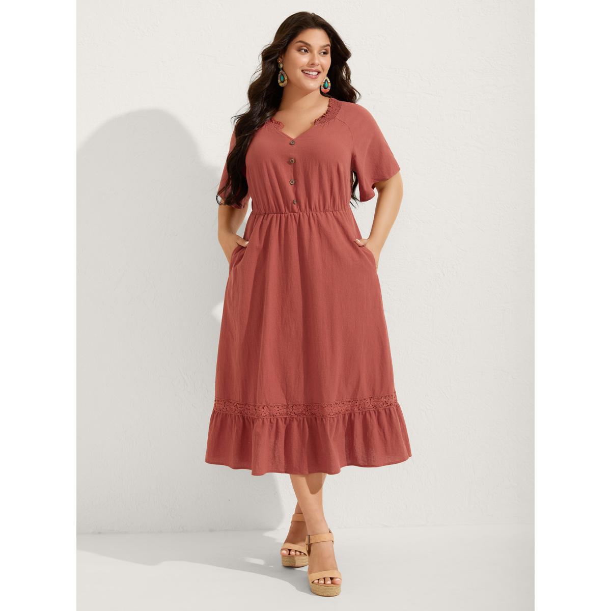 Plus Size Pure Cotton Lace Trim Pockets Midi Dress Rust Women Boho Woven ribbon&lace trim Notched collar Half Sleeve Curvy BloomChic 22-24/3X