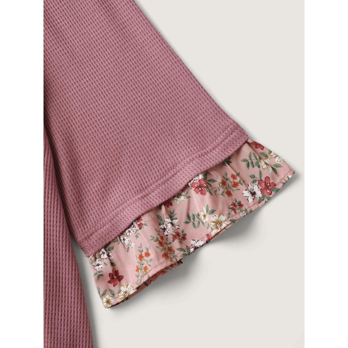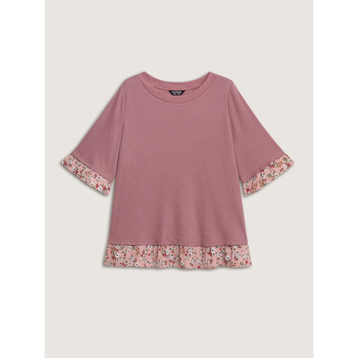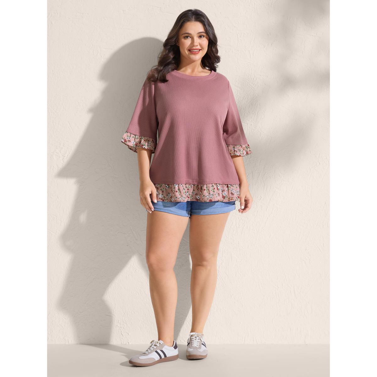 Plus Size Ribbed Floral Patchwork Ruffled Sleeve T-Shirt Rouge Women Leisure Patchwork Ditsy Floral Round Neck Casual T-shirts BloomChic 22-24/3X