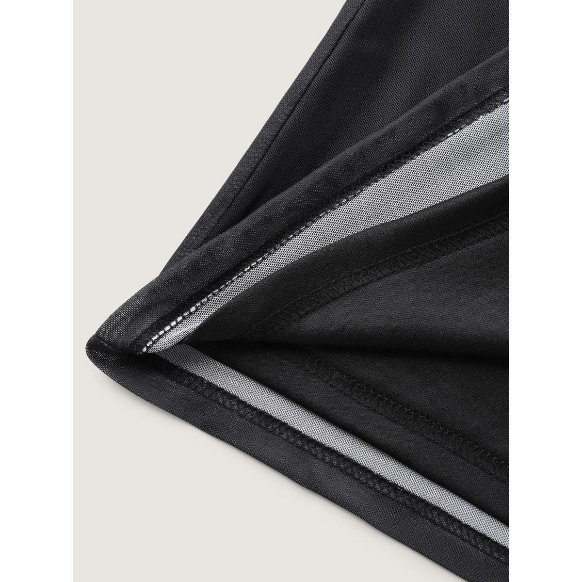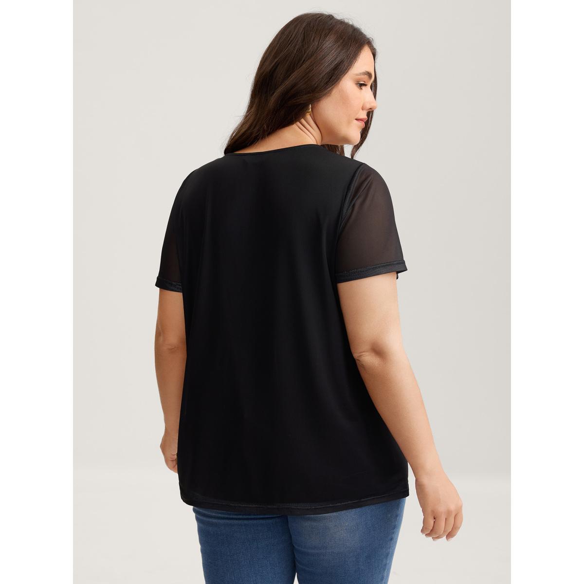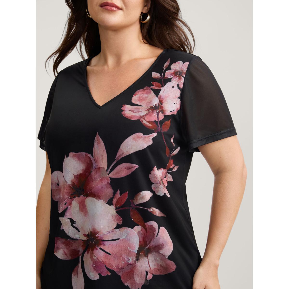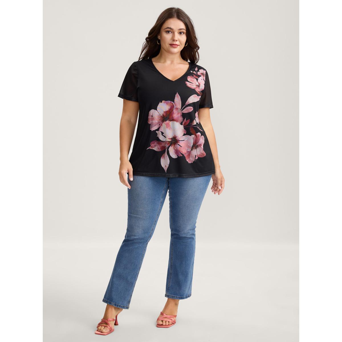 Plus Size Romantic Floral Motif Sheer Knit T-Shirt Black Women Timeless Contrast Natural Flowers V-neck Elegant T-shirts BloomChic 22-24/3X