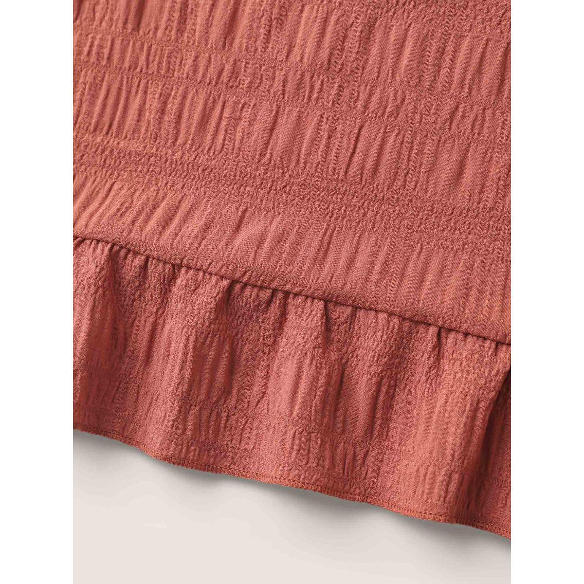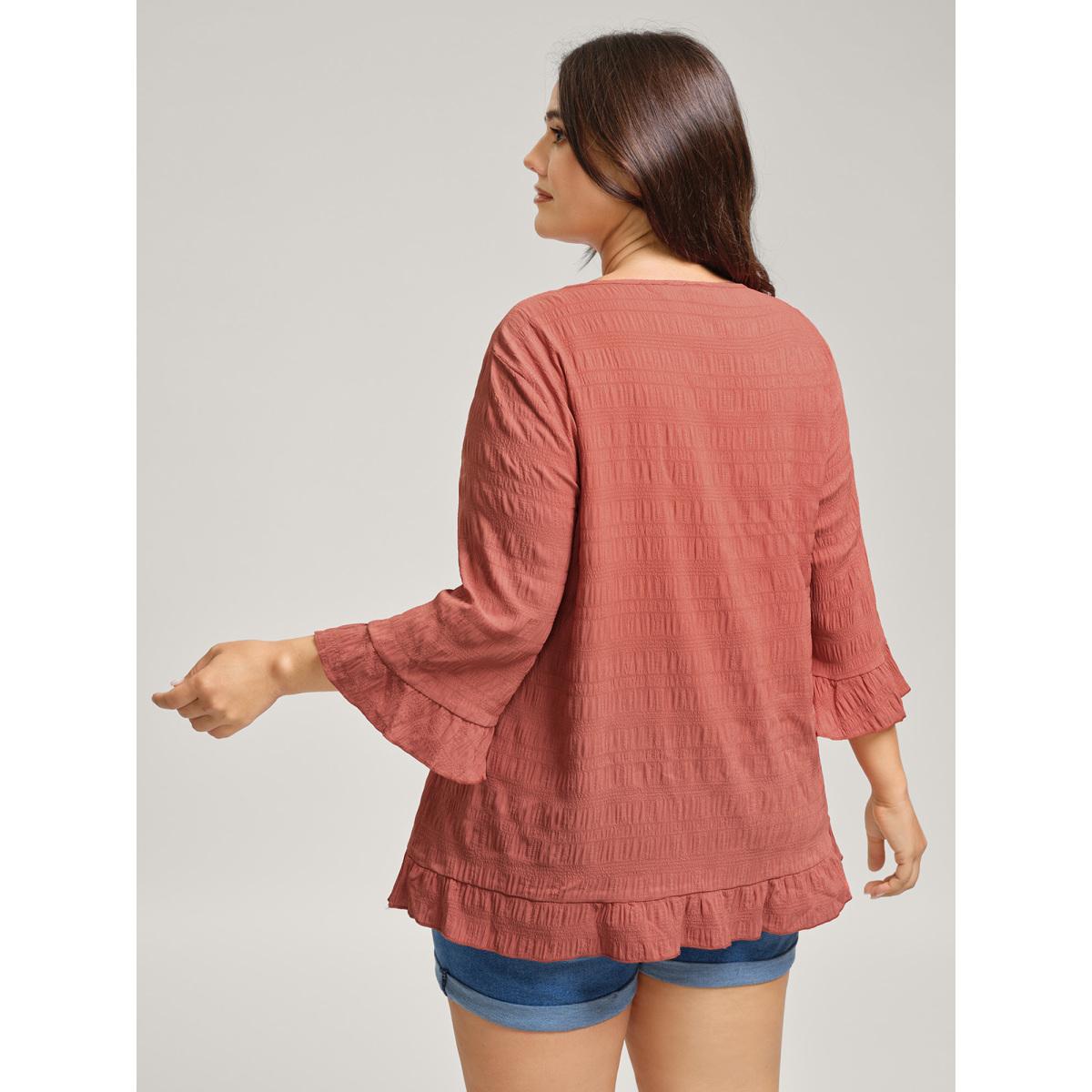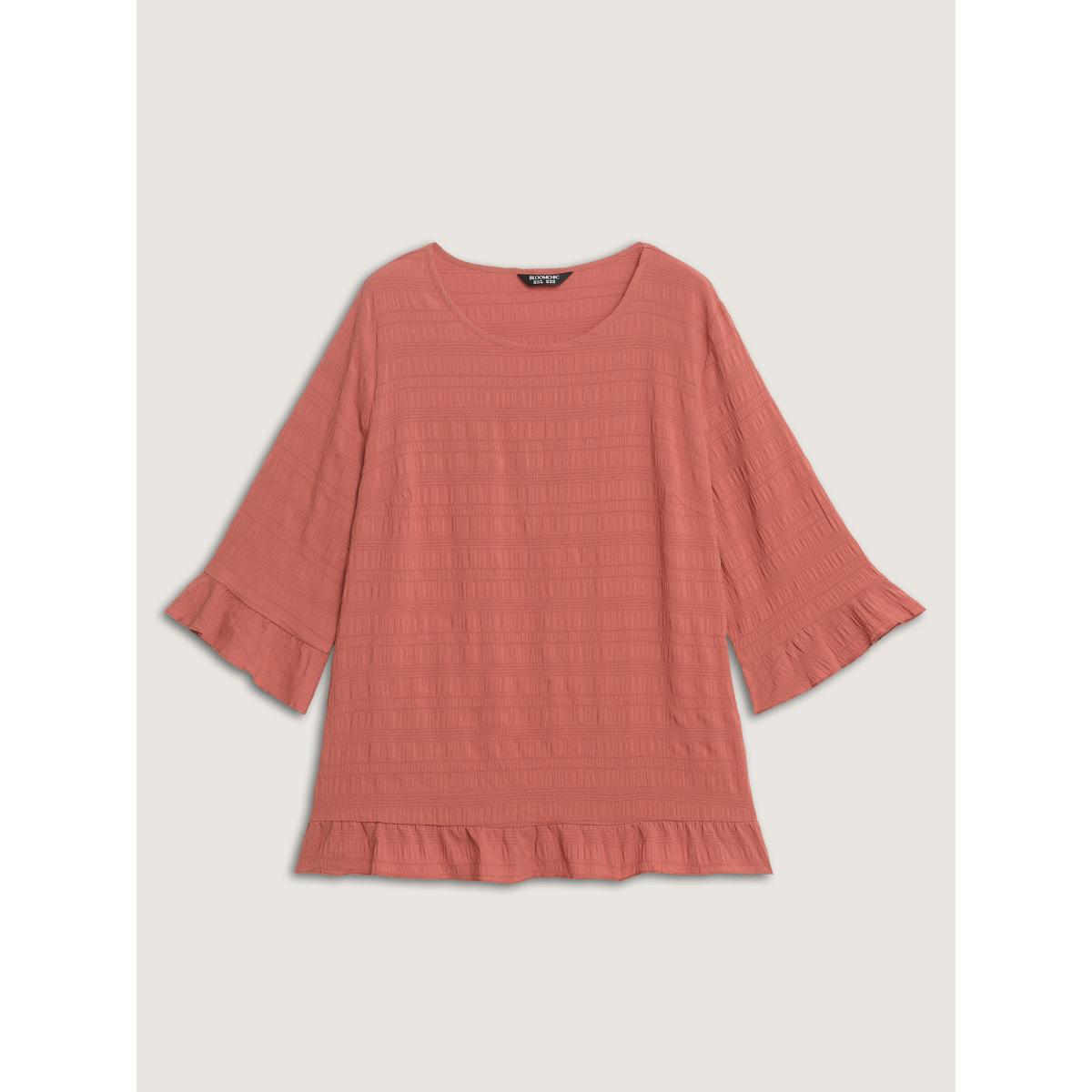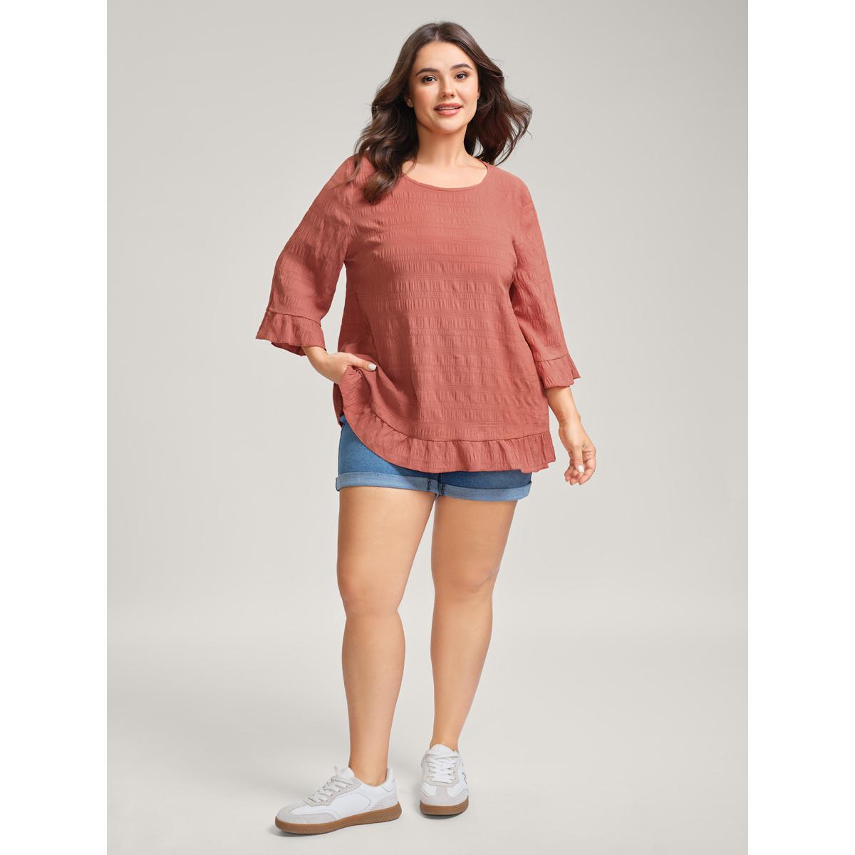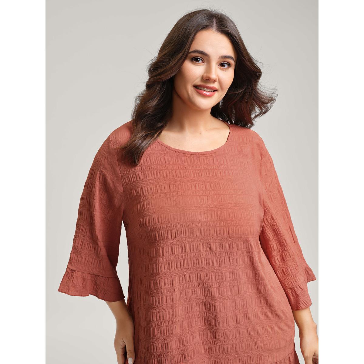 Plus Size Rust Textured Ruffled Edges Solid Blouse Women Leisure Elbow-length sleeve Round Neck Casual Blouses BloomChic 26/4X