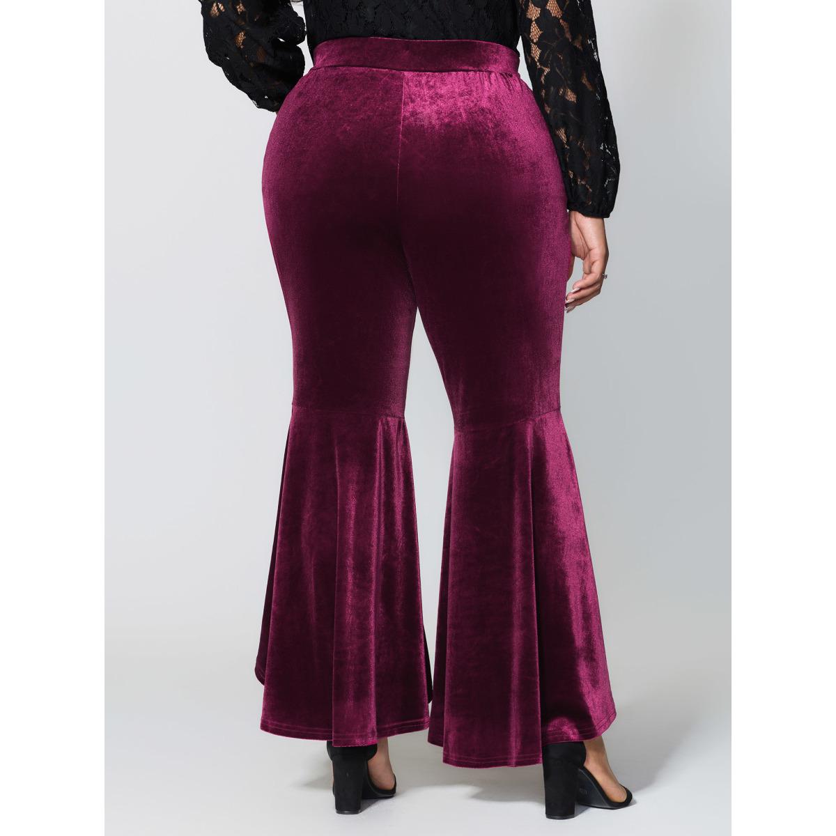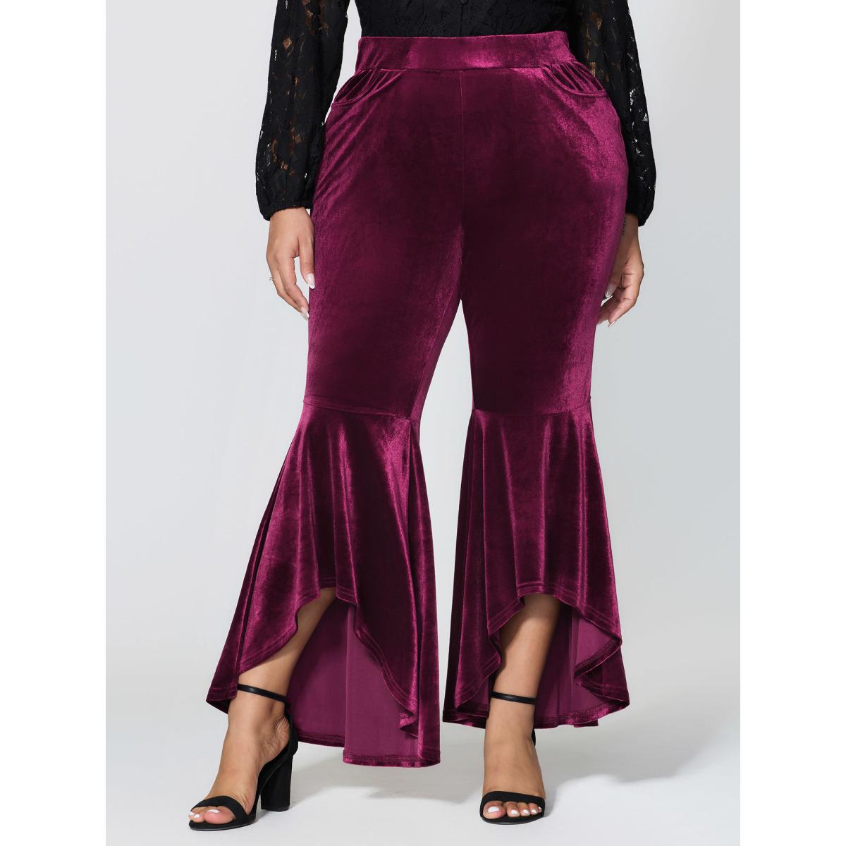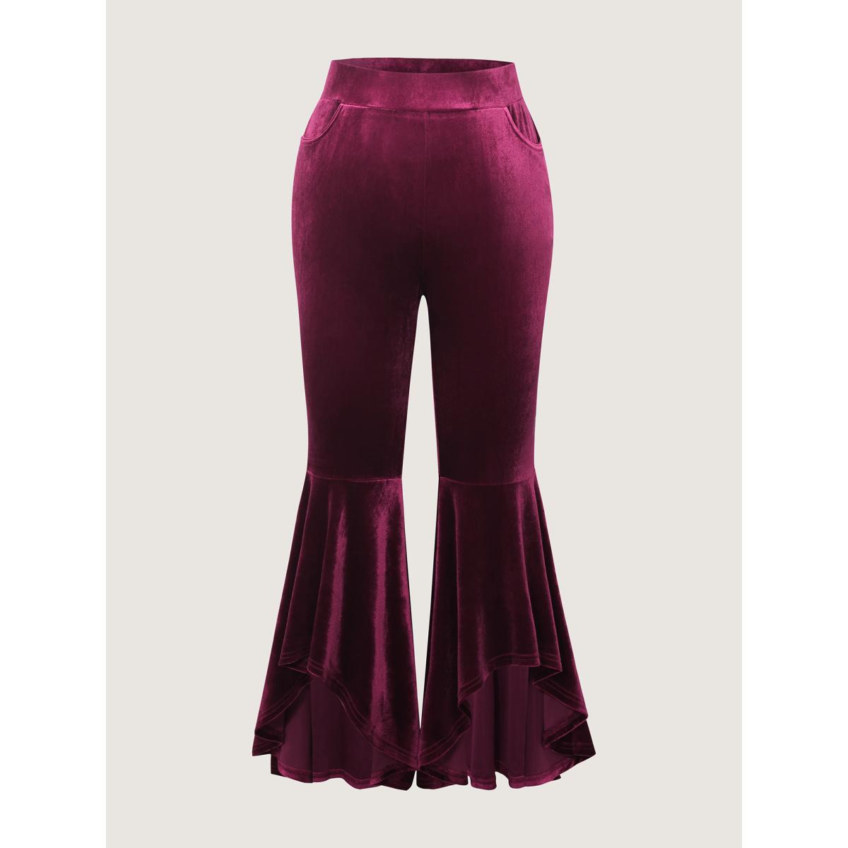 Plus Size Satin Button Detail Ruffled Pants Women Burgundy Party&Cocktail Bodycon Mid Rise Party Pants BloomChic 18-20/2X