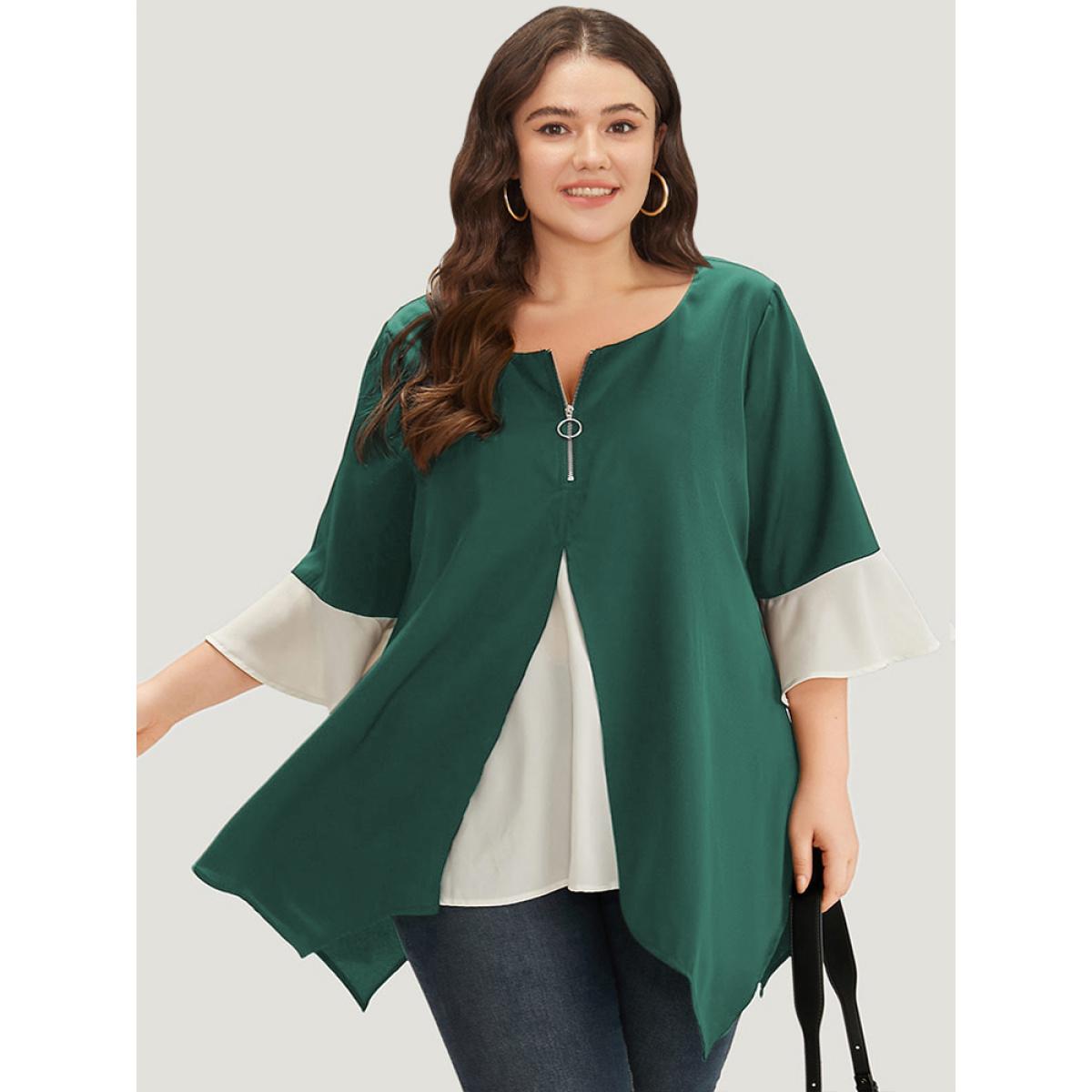 Plus Size Scarlet Anti-Wrinkle Contrast Zip Up Flutter Sleeve Hanky Hem Blouse Women Office Half Sleeve Round Neck Office Blouses BloomChic 28/5X