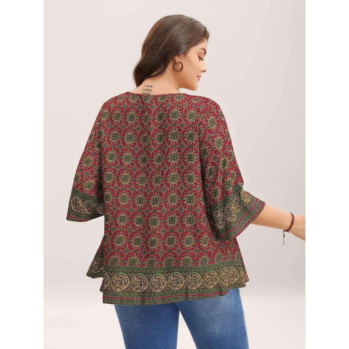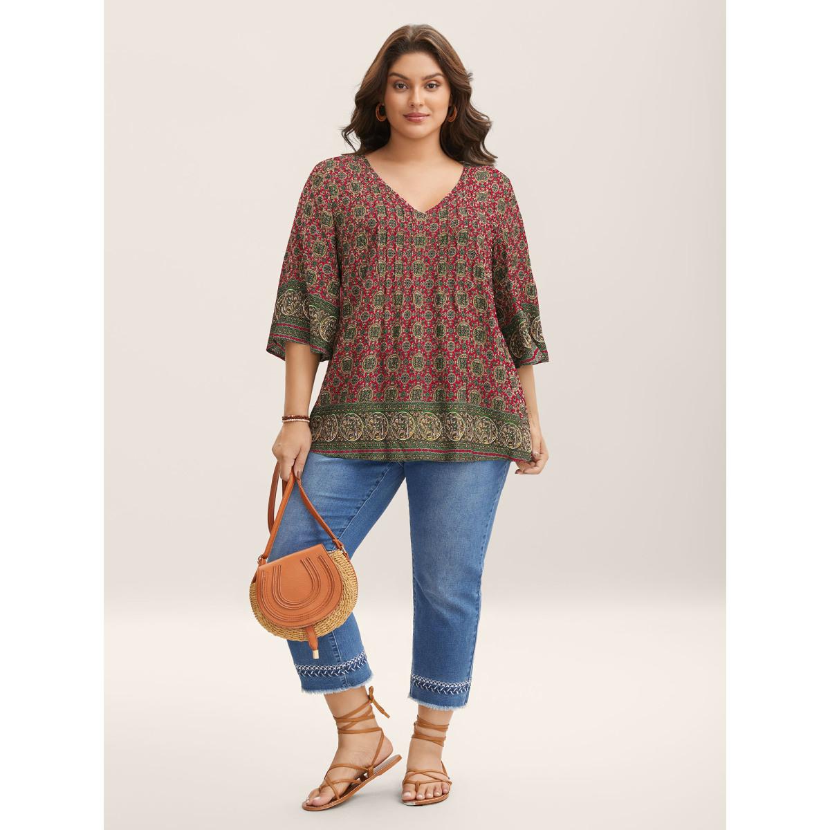 Plus Size Scarlet Pin-Tuck Pleat Ornate Print Relaxed Fit Shirt Women Resort Elbow-length sleeve V-neck Vacation Blouses BloomChic 10/M