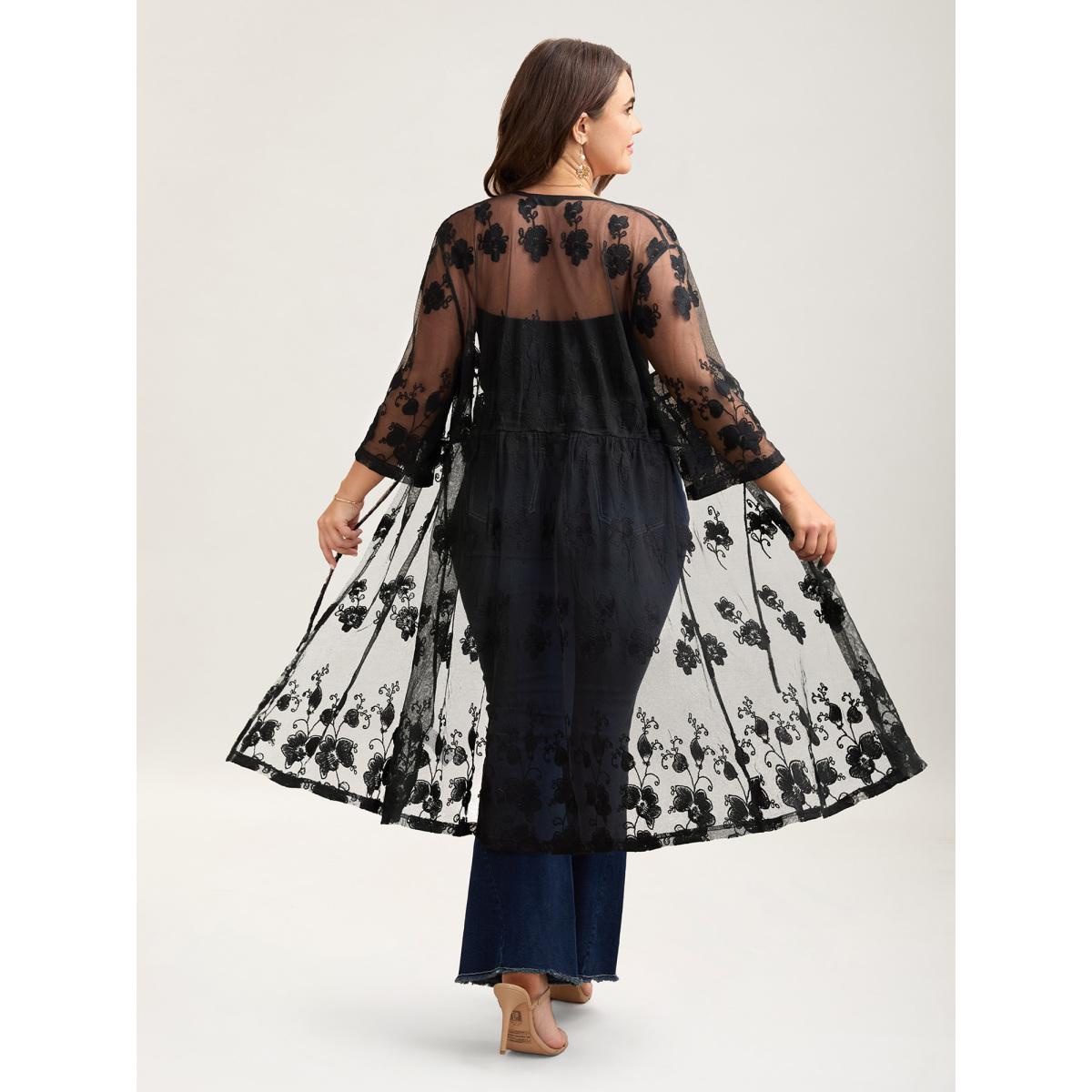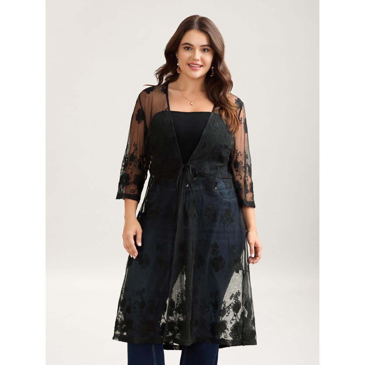 Plus Size Sheer Lace Waist-Tie Kimono Cardigan Women Black Elegant Tie knot Bodycon Everyday Kimonos BloomChic 14-16/1X Product Image