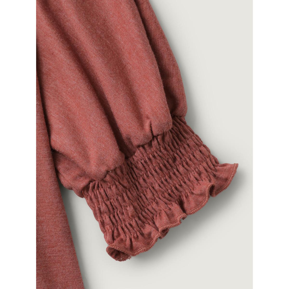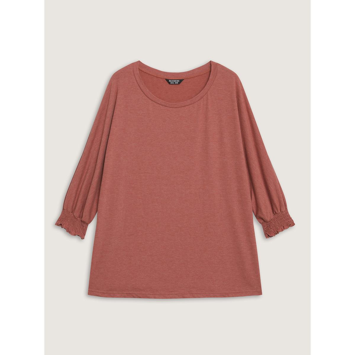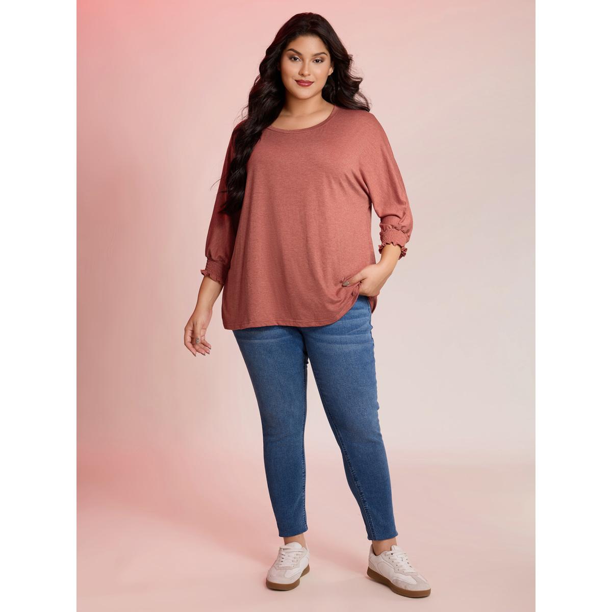 Plus Size Shirred Cuff Sleeve Round Neck T-Shirt Coral Women Leisure Non Round Neck Casual T-shirts BloomChic 28/5X Product Image