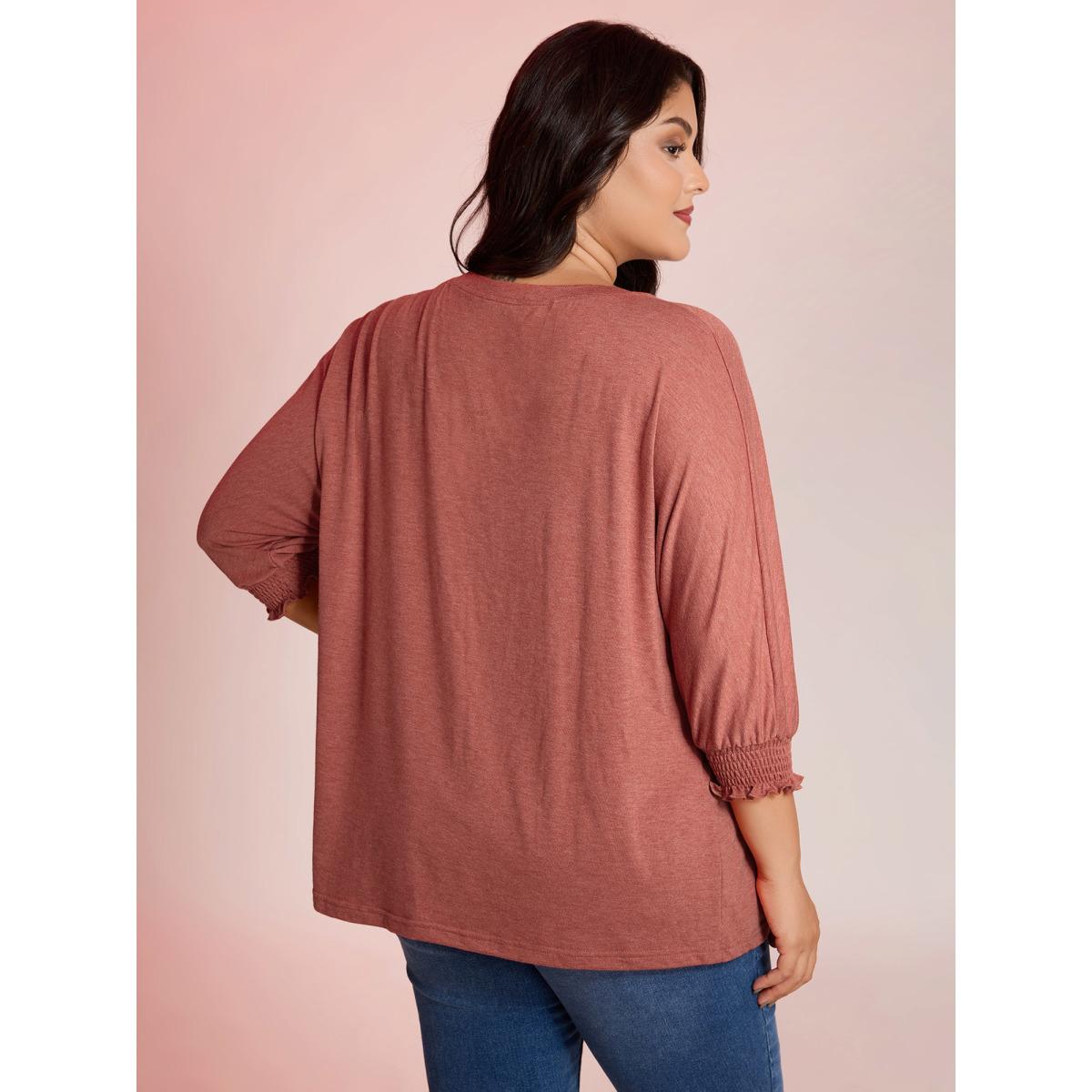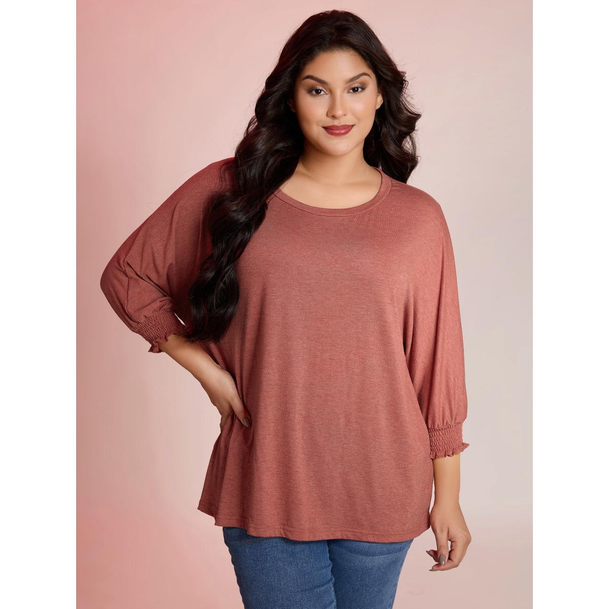 Plus Size Shirred Cuff Sleeve Round Neck T-Shirt Coral Women Leisure Non Round Neck Casual T-shirts BloomChic 28/5X