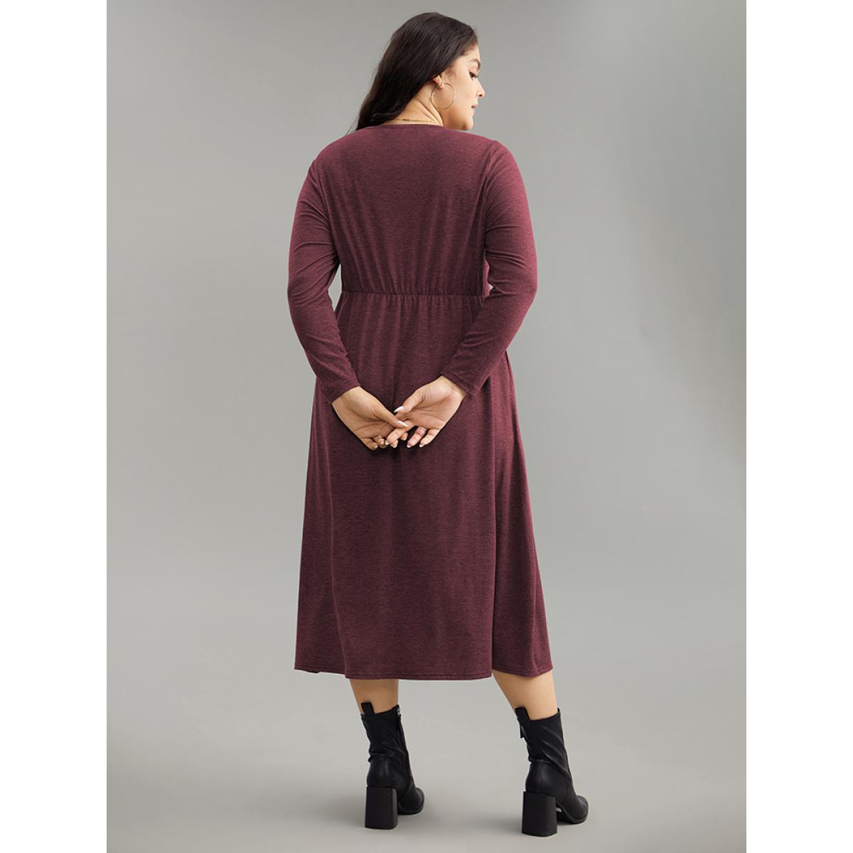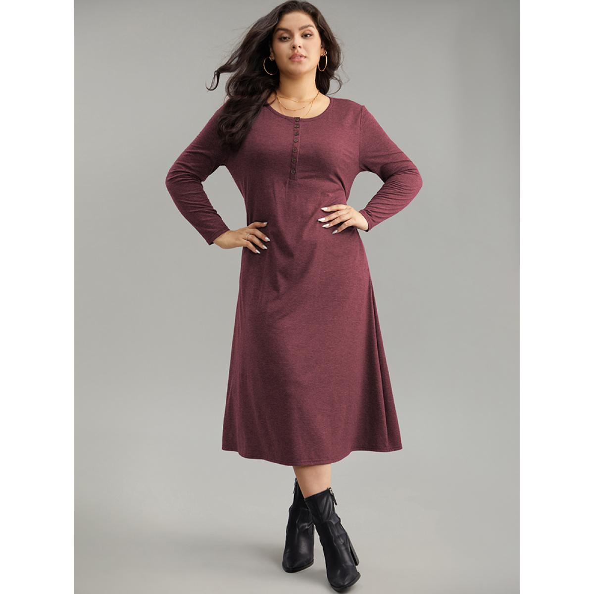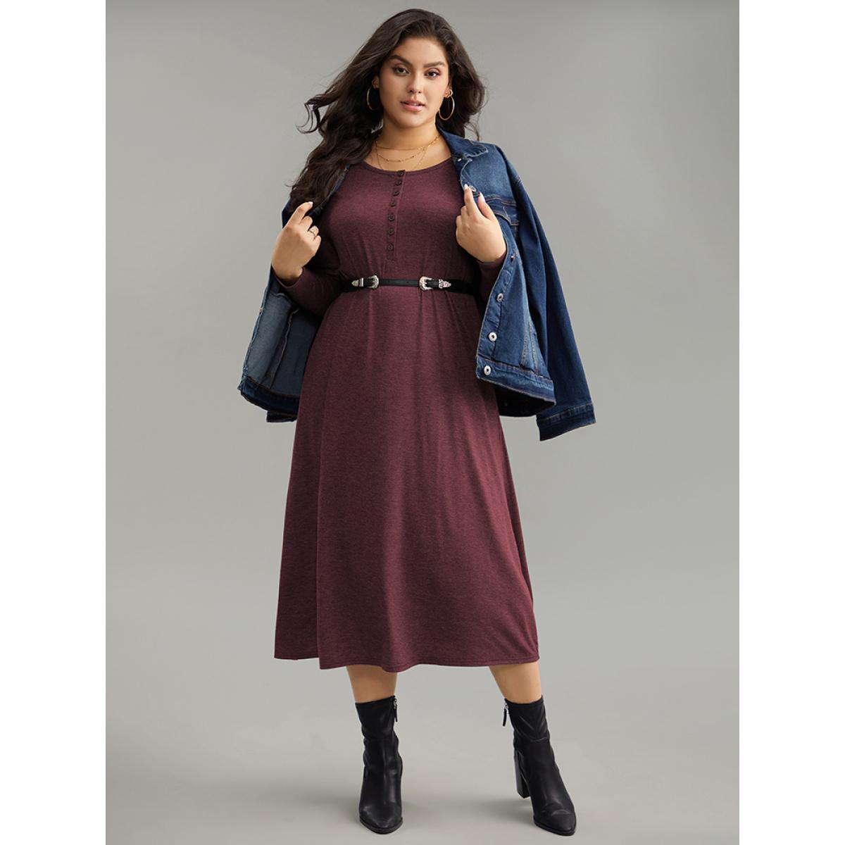 Plus Size Solid Button Up Pocket Dress Maroon Women Basics Non Round Neck Long Sleeve Curvy Midi Dress BloomChic 28/5X