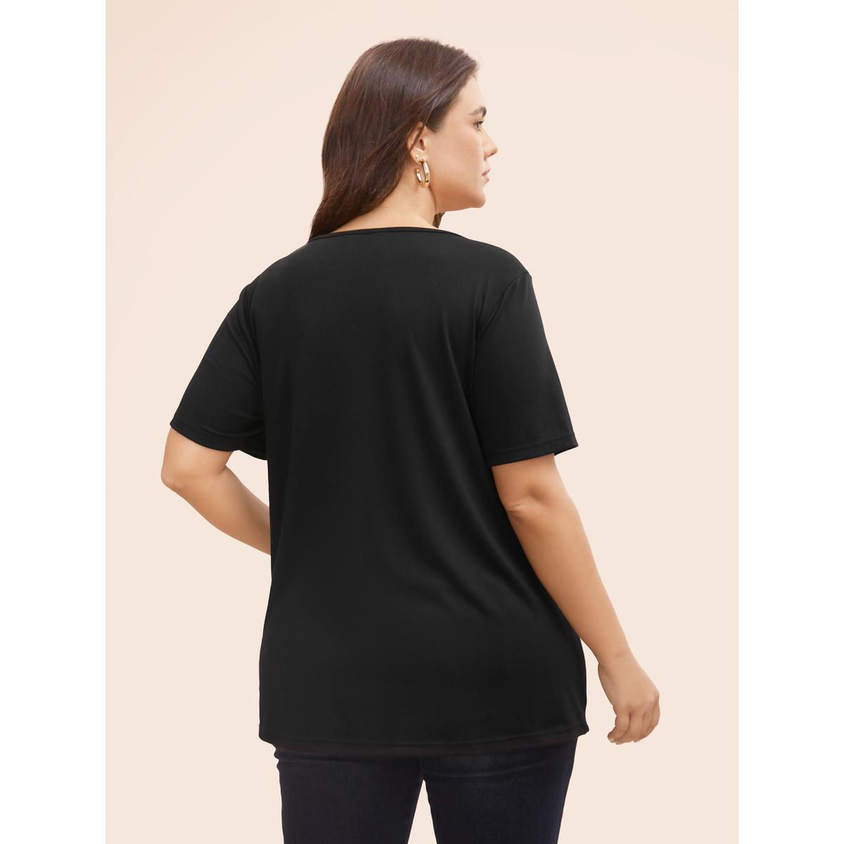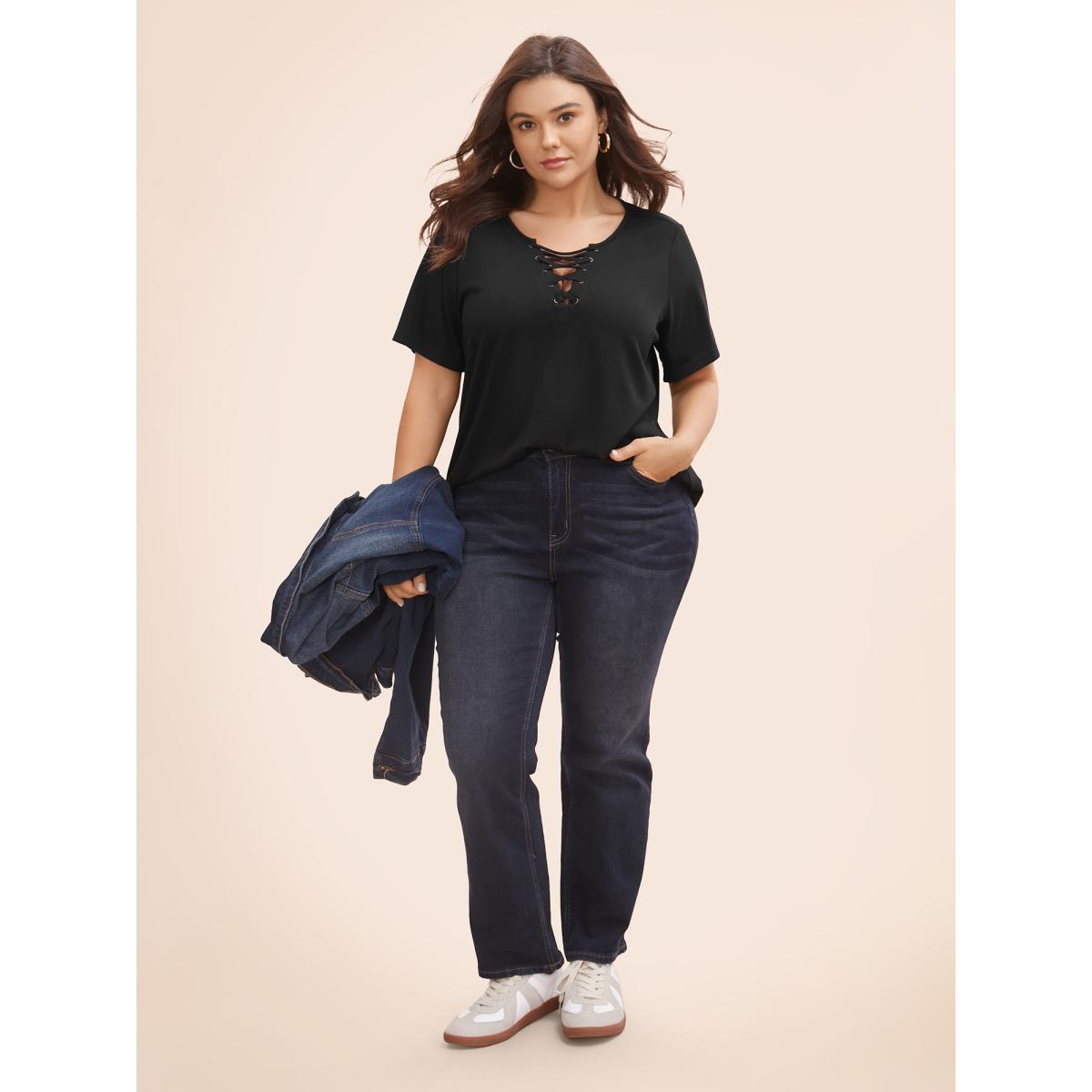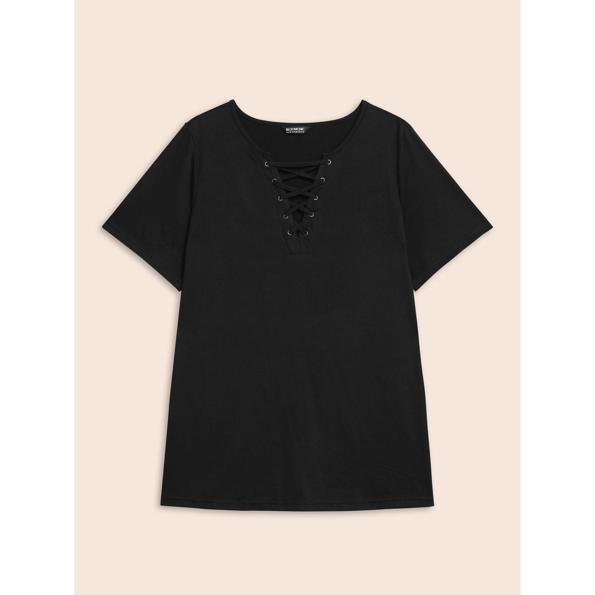 Plus Size Solid Cross Straps Eyelet T-shirt Black Women Casual Eyelet V-neck Everyday T-shirts BloomChic 28/5X