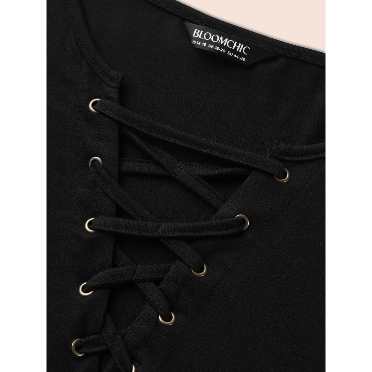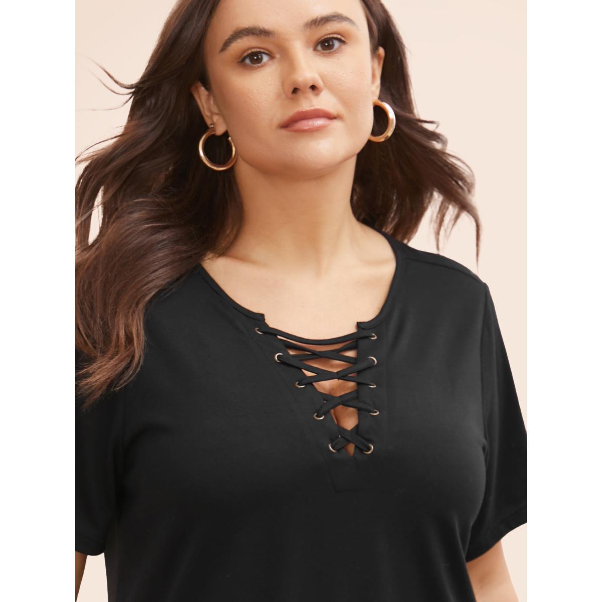 Plus Size Solid Cross Straps Eyelet T-shirt Black Women Casual Eyelet V-neck Everyday T-shirts BloomChic 28/5X Product Image