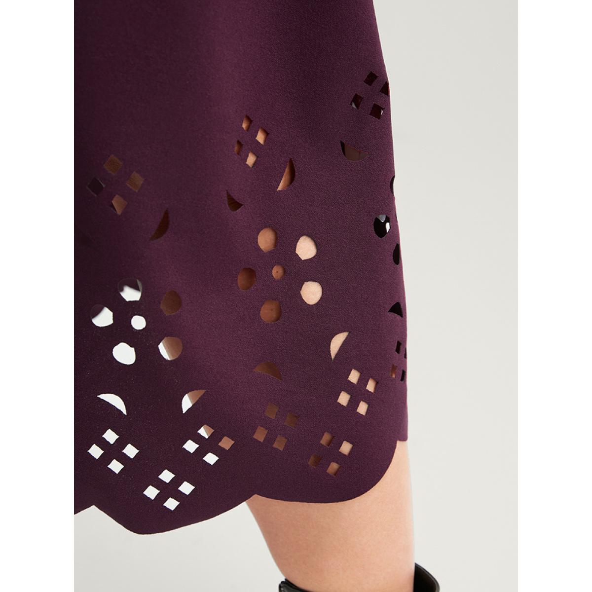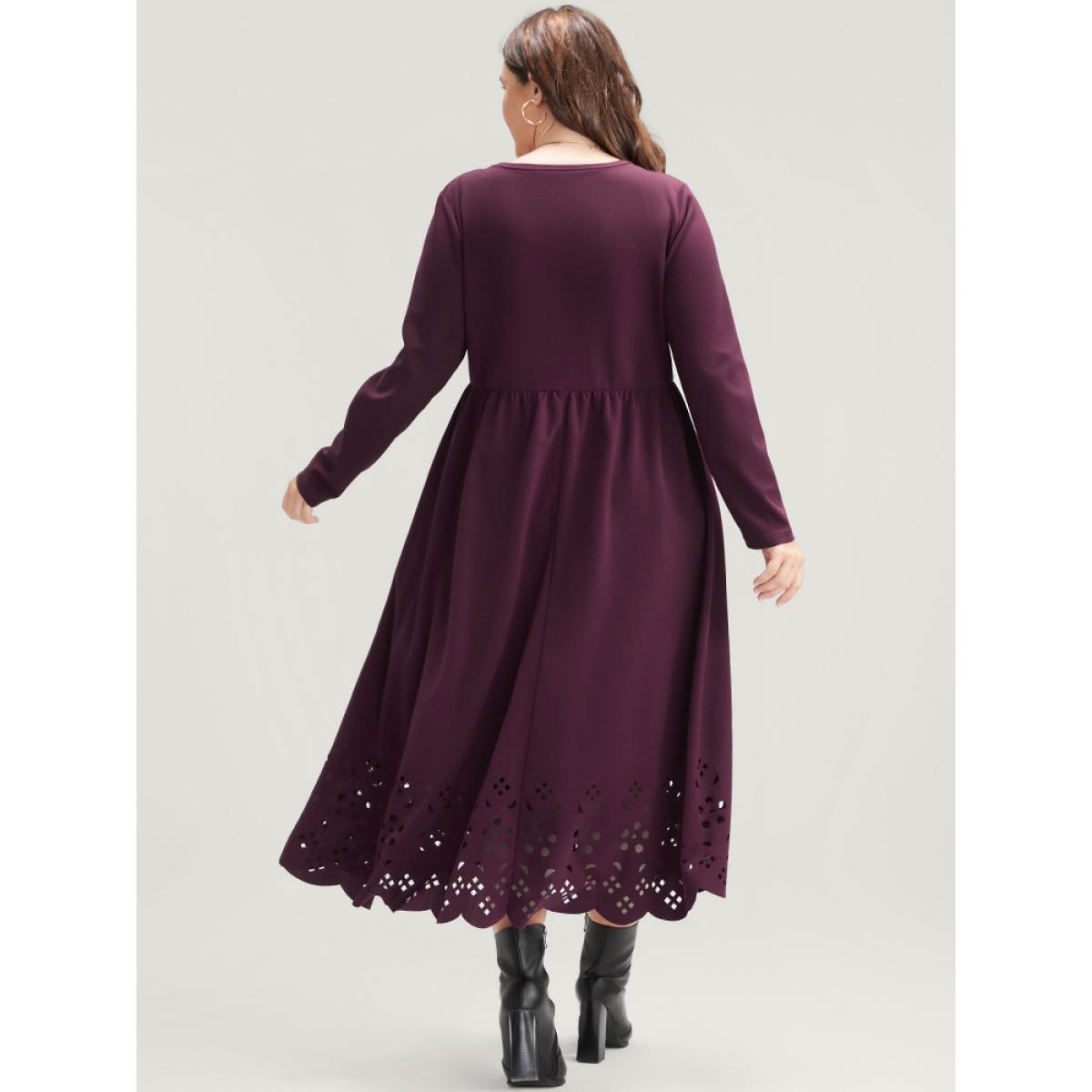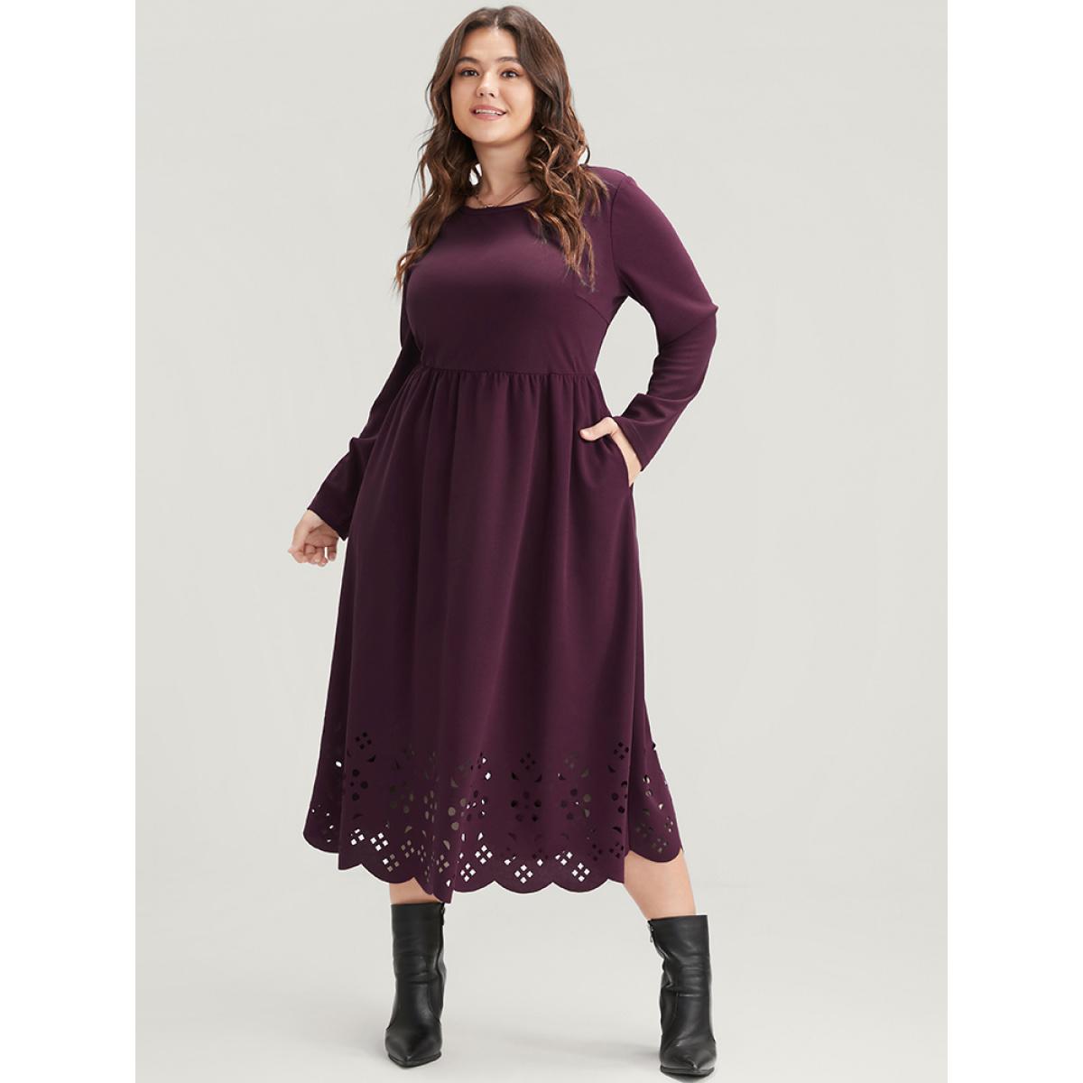 Plus Size Solid Round Neck Laser Cut Pocket Midi Dress Eggplant Women Elegant Elastic Waist Round Neck Long Sleeve Curvy Midi Dress BloomChic 22-24/3X