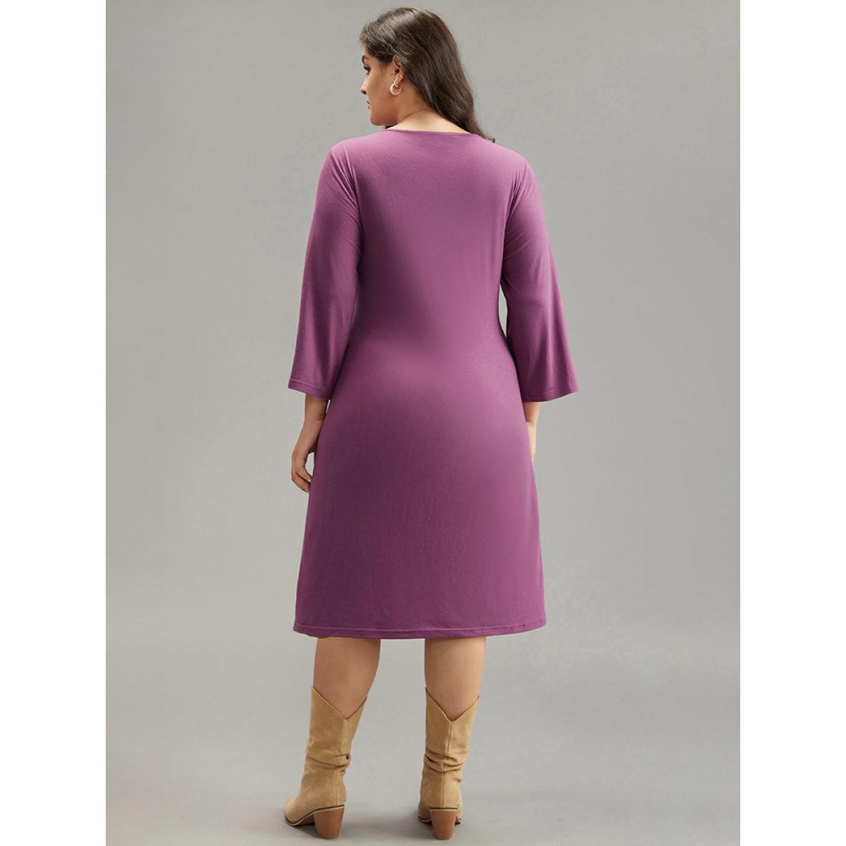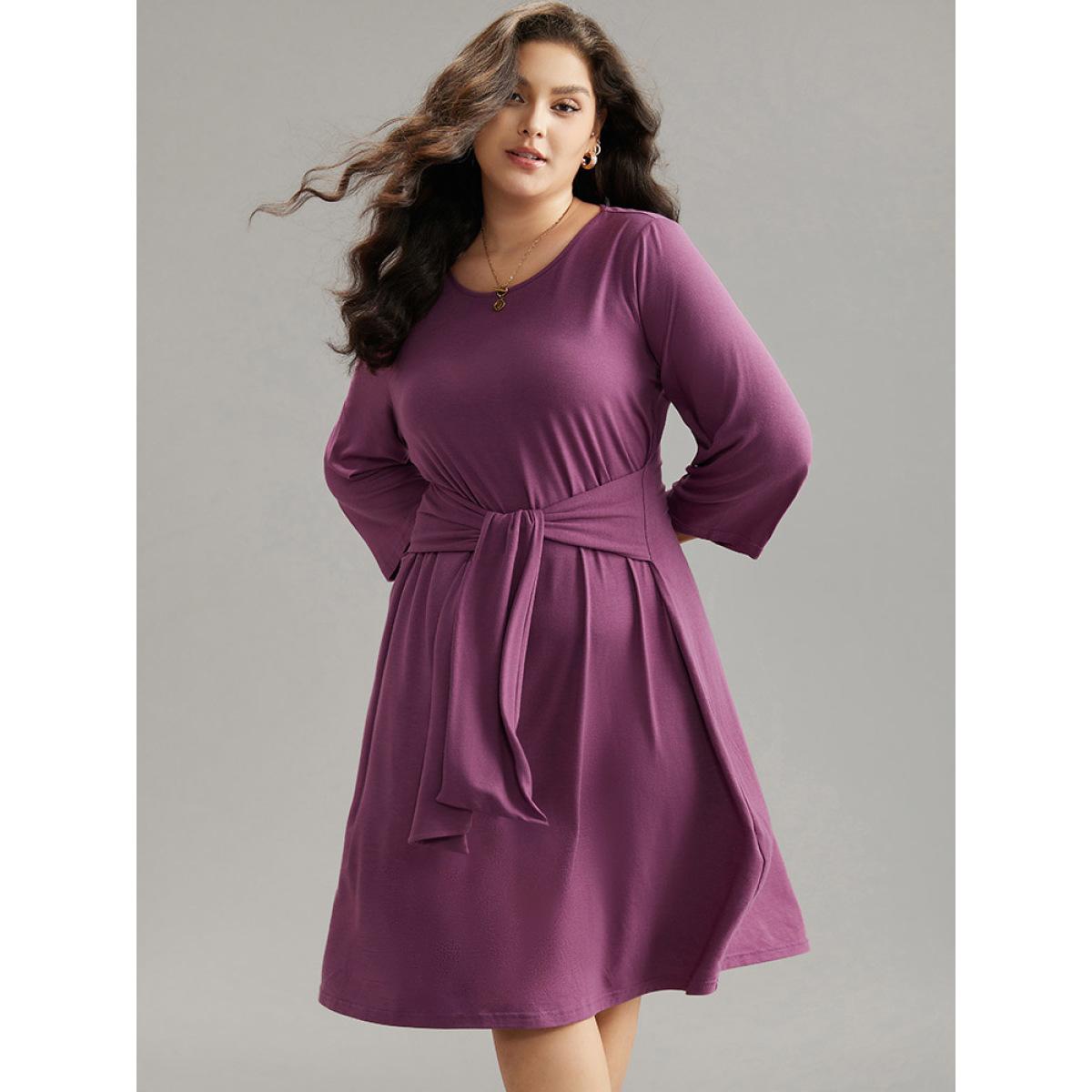 Plus Size Solid Ties Knot Round Neck Dress Mauve Women Basics Plain Round Neck Long Sleeve Curvy Midi Dress BloomChic 28/5X