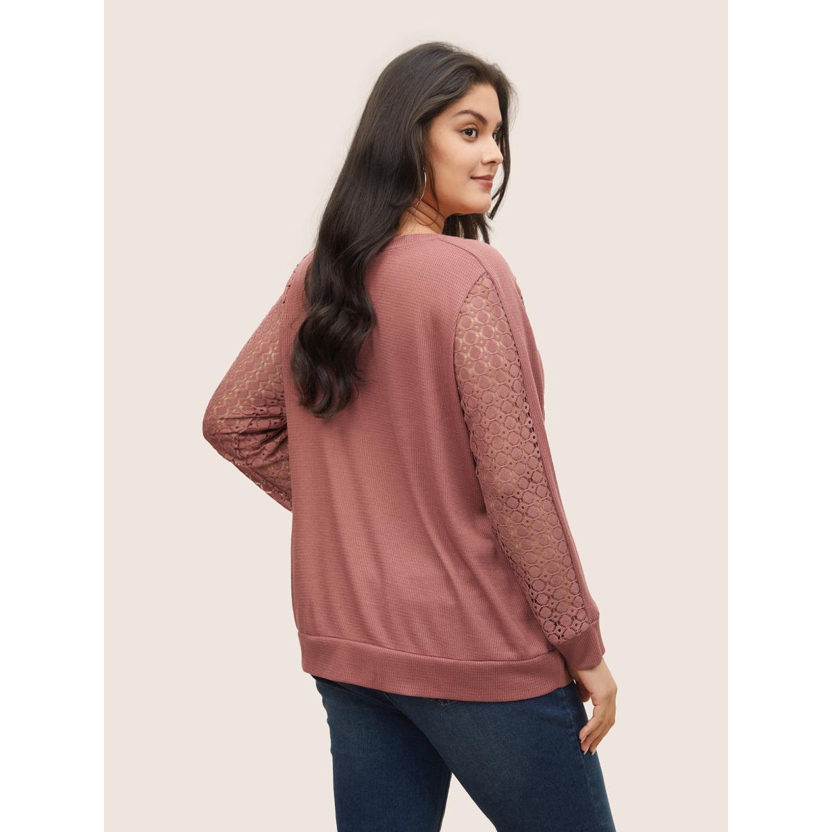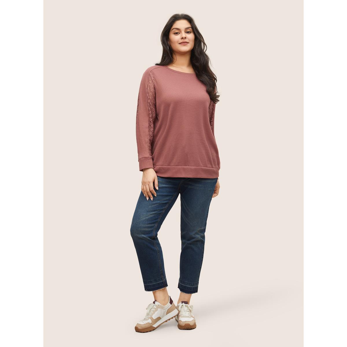 Plus Size Solid Waffle Knit Lace Panel Sweatshirt Women Rouge Casual Texture Round Neck Everyday Sweatshirts BloomChic 12/L