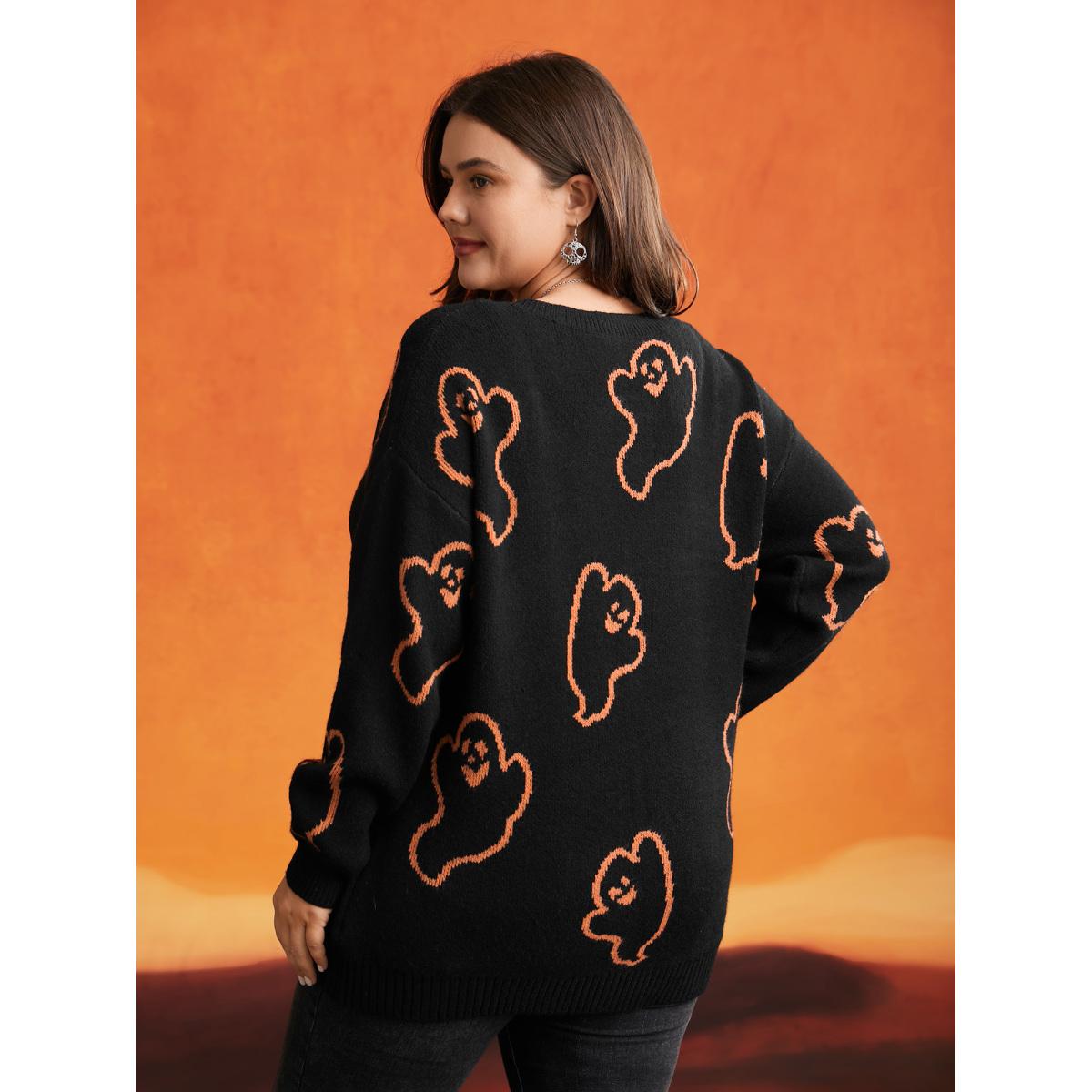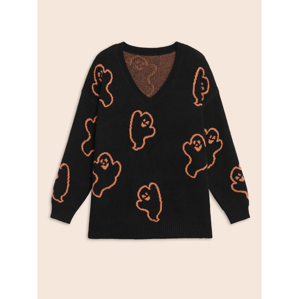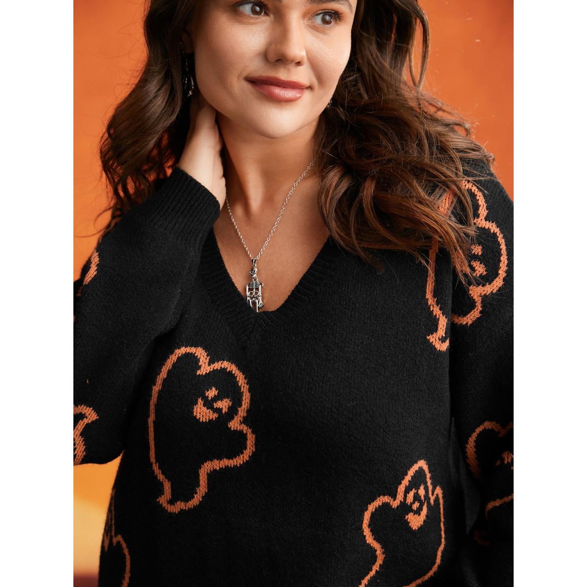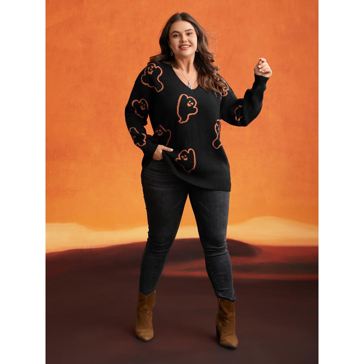 Plus Size Spooky Ghost Pattern V-Neck Pullover Black Women Casual Loose Long Sleeve V-neck Everyday Pullovers BloomChic 10/M