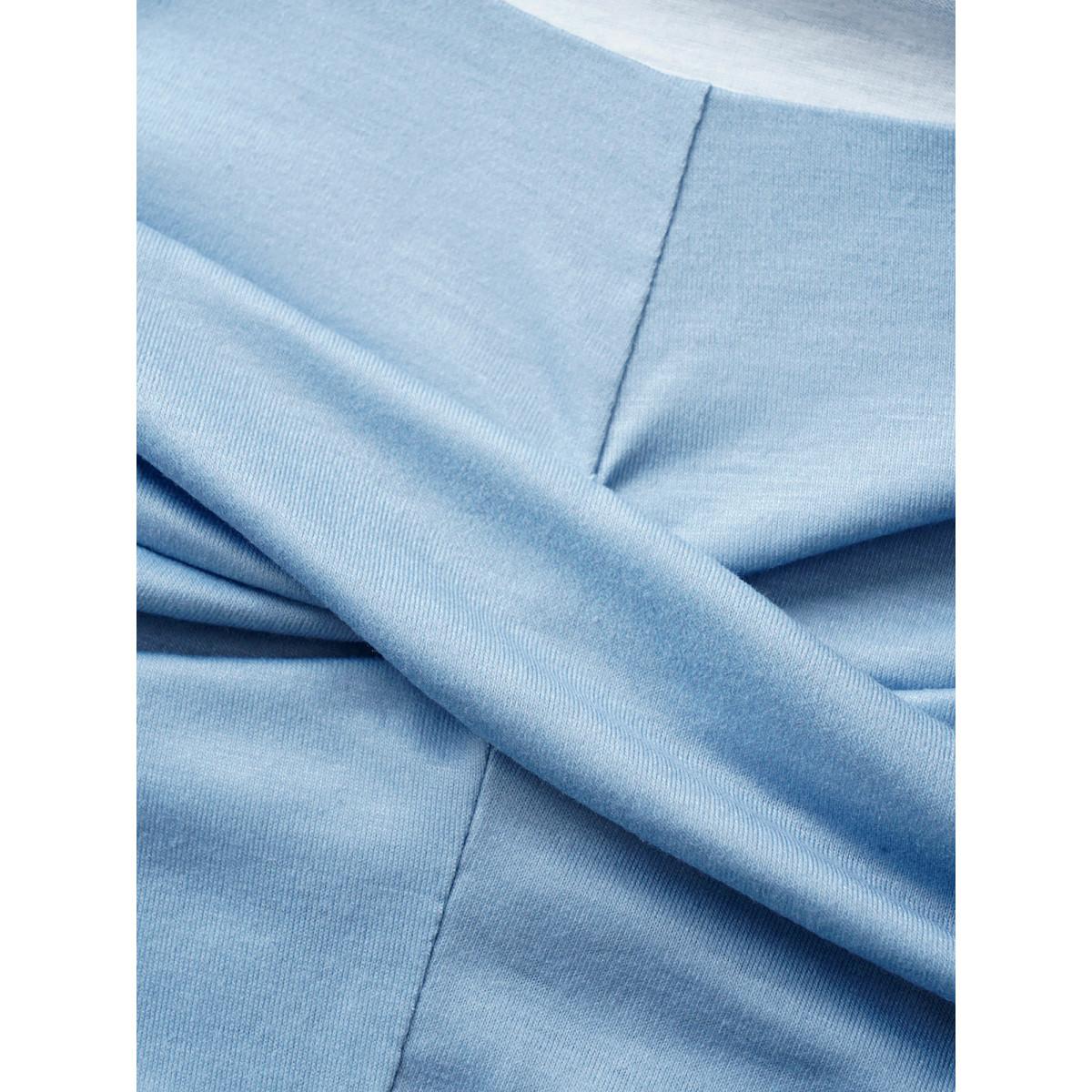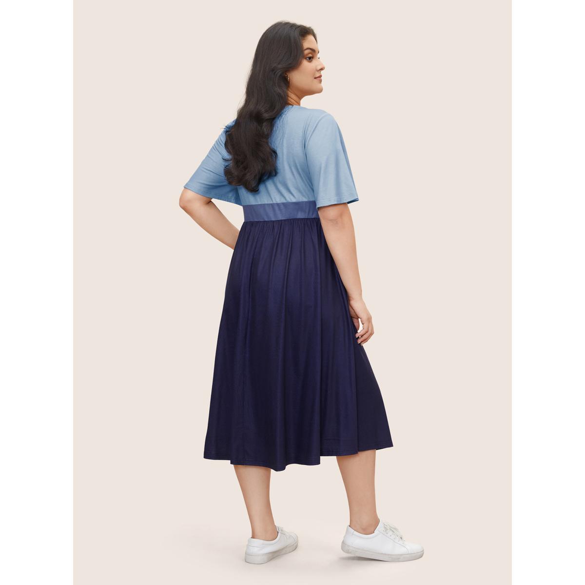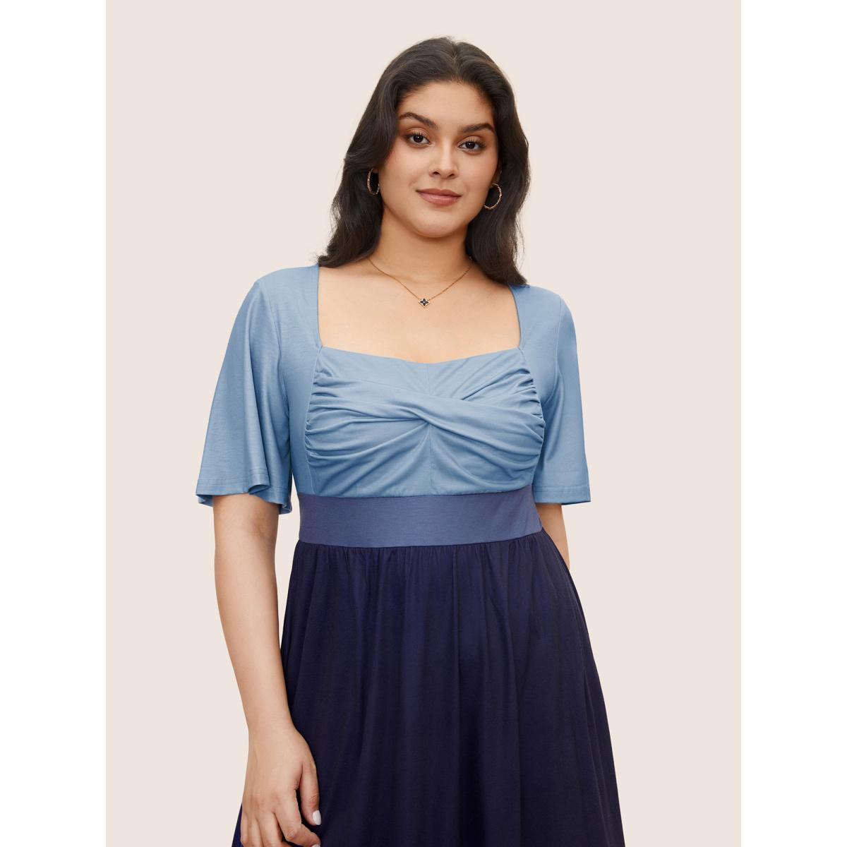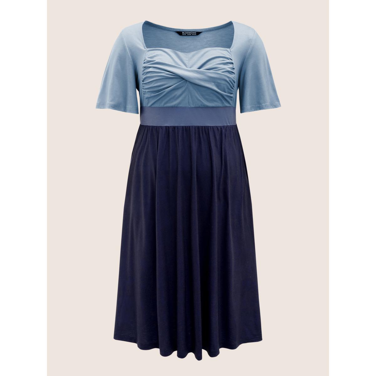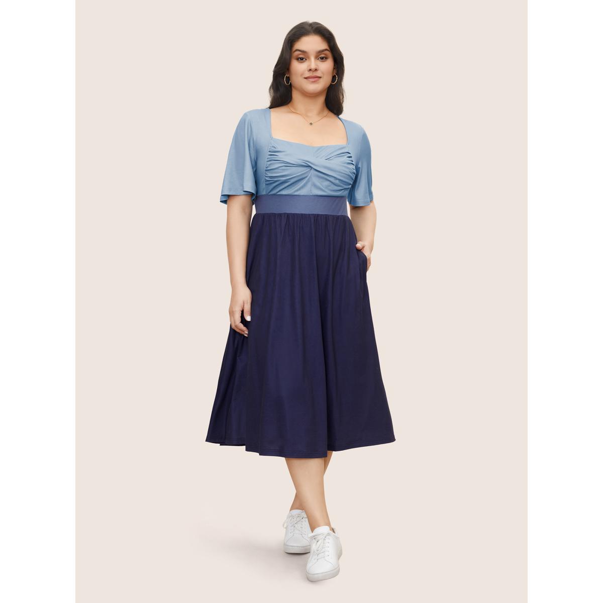 Plus Size Square Neck Colorblock Contrast Twist Front Dress Navy Women Casual Twist Square Neck Short sleeve Curvy Midi Dress BloomChic 22-24/3X