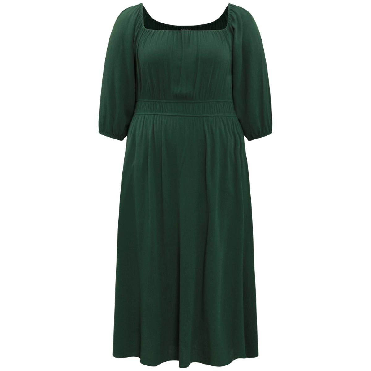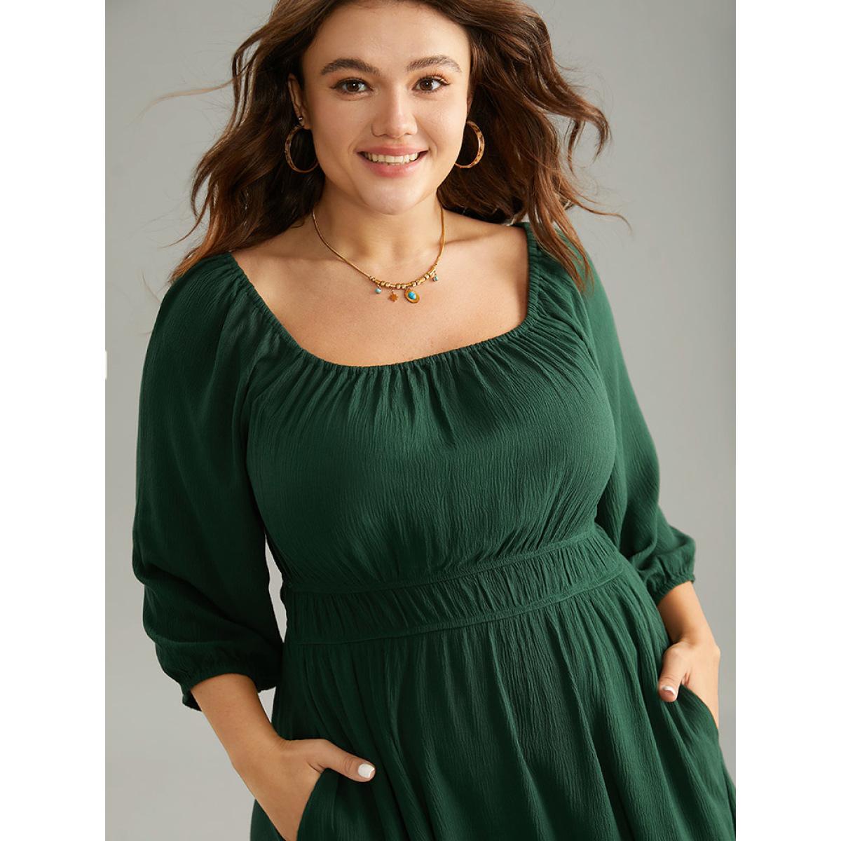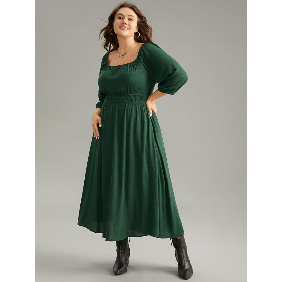Plus Size Square Neck Gathered Elastic Waist Rayon Dress DarkGreen Women Casual Elastic cuffs Square Neck Elbow-length sleeve Curvy Midi Dress BloomChic 30/6X