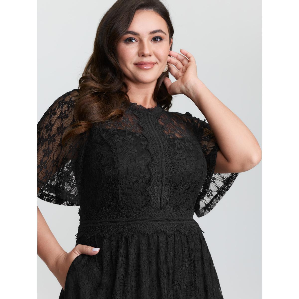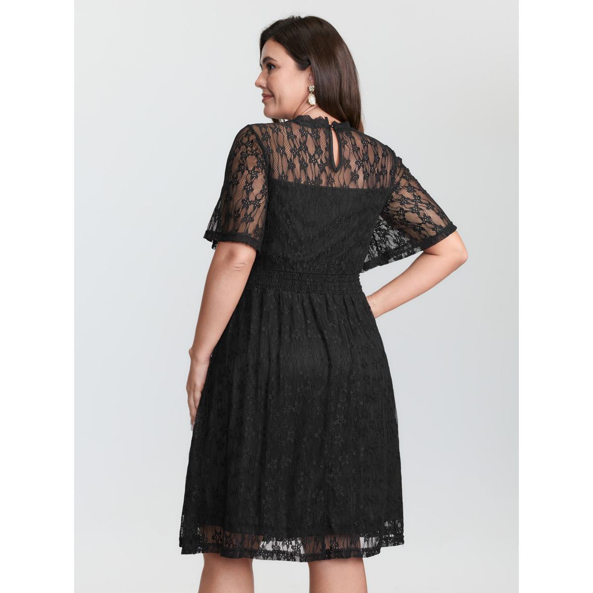 Plus Size Star Lace Trim Shirred Waist Mini Dress Black Women Romantic Texture Round Neck Half Sleeve Curvy BloomChic 26/4X