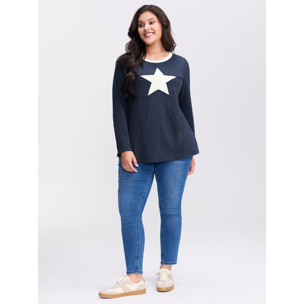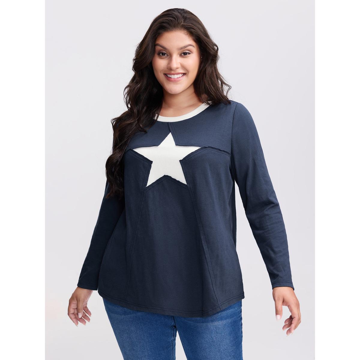 Plus Size Star Pattern Textured Stretchy T-Shirt Midnight Women Leisure Contrast Round Neck Casual T-shirts BloomChic 10/M Product Image