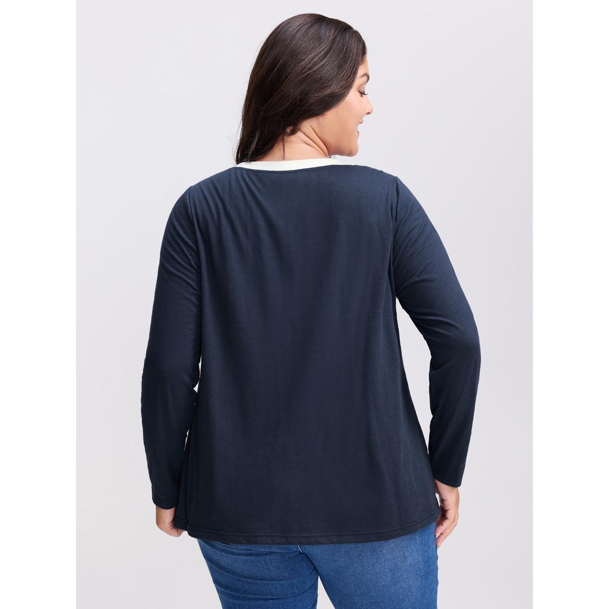 Plus Size Crew Neck Striped Button Detail T-shirt Midnight Women Casual Button Round Neck Everyday T-shirts BloomChic 26/4X
