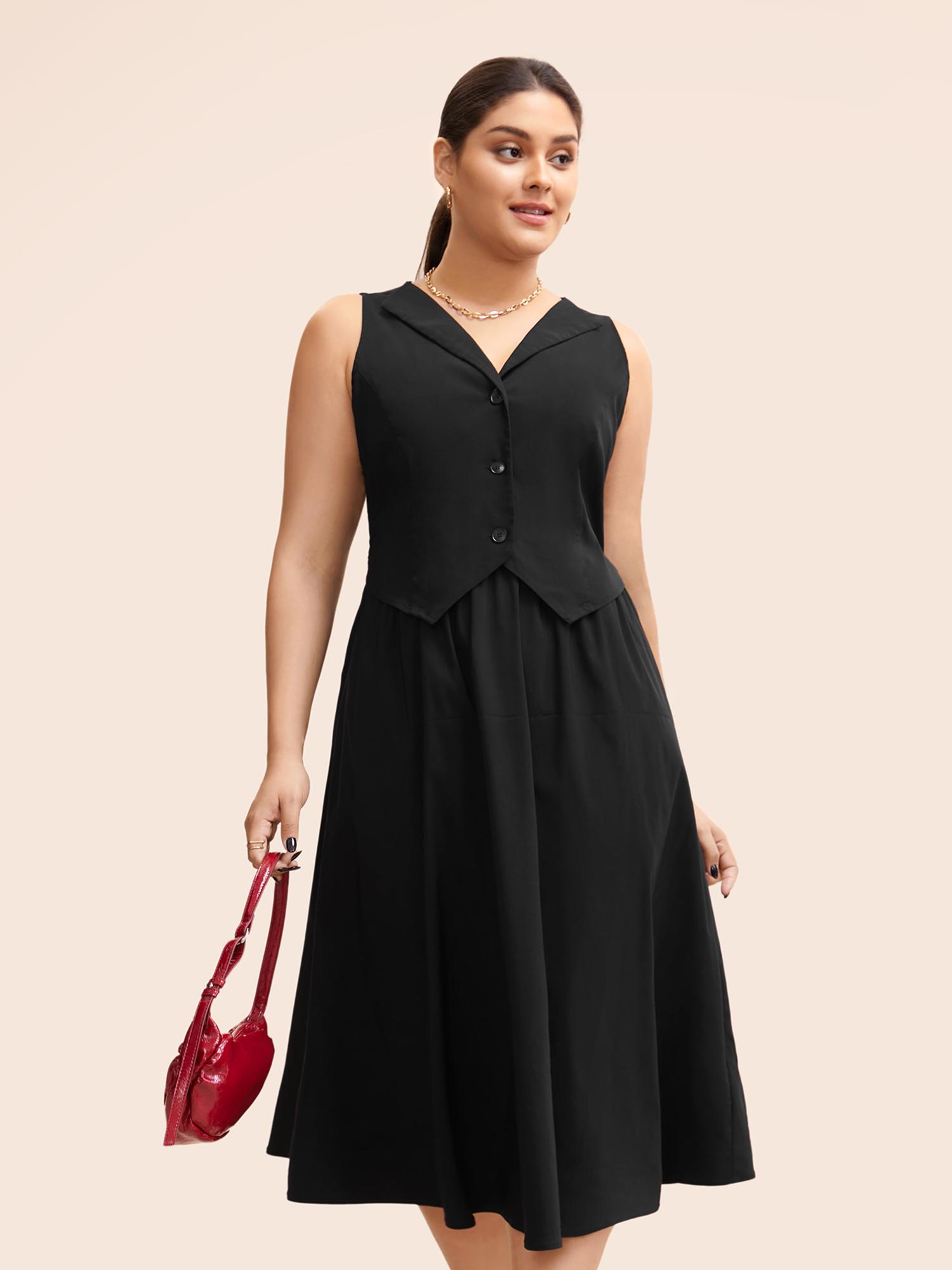 Plus Size Stretch Woven Vest Flare Midi Dress Black Women At the Office Button Suit Collar Sleeveless Curvy BloomChic 26/4X