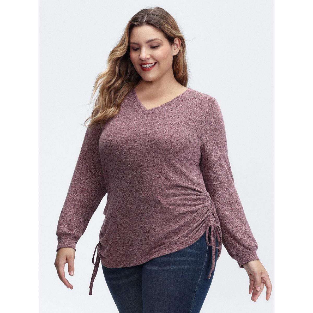 Plus Size Solid Drawstring Heather V Neck T-shirt Purple Women Casual Plain Plain V-neck Dailywear T-shirts BloomChic 18-20/2X