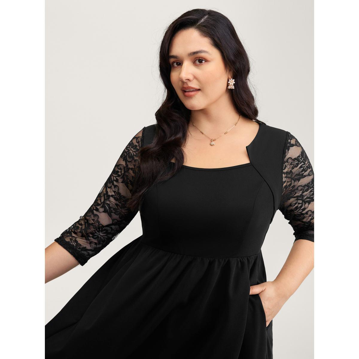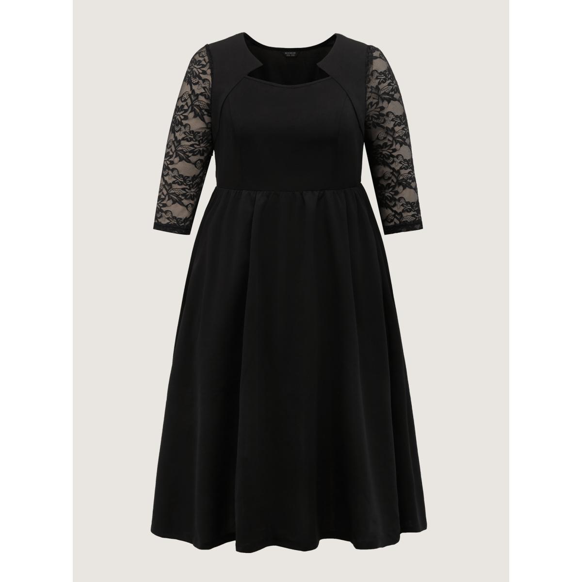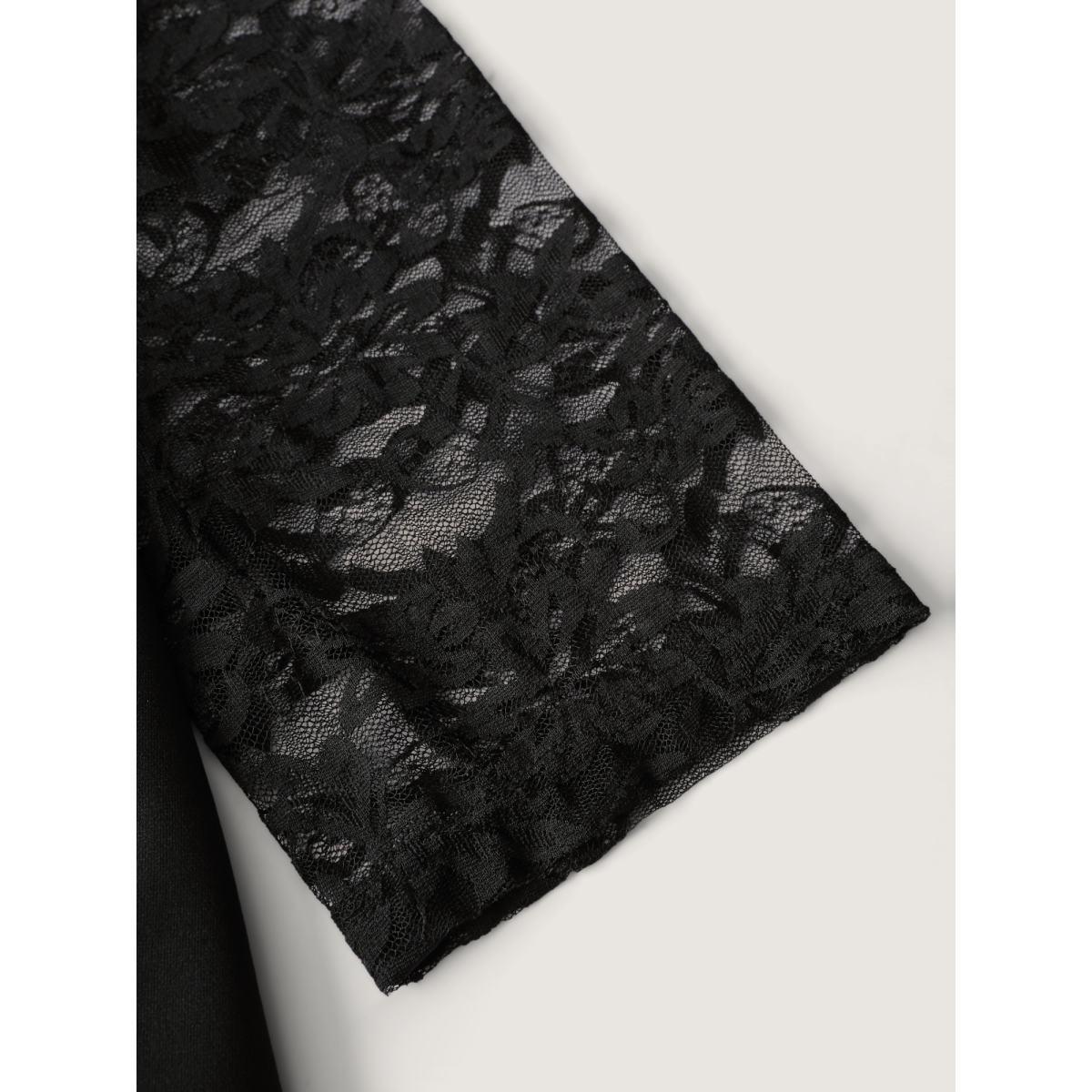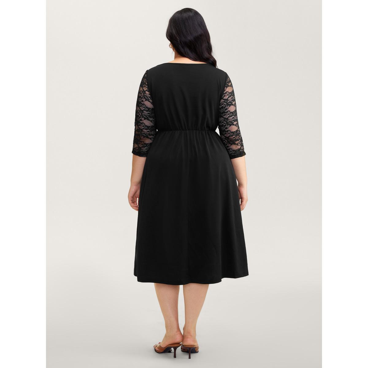 Plus Size Stretchy Sheer Sleeve Cinched-Waist Midi Dress Black Women Romantic See through Notched collar Elbow-length sleeve Curvy BloomChic 12/L