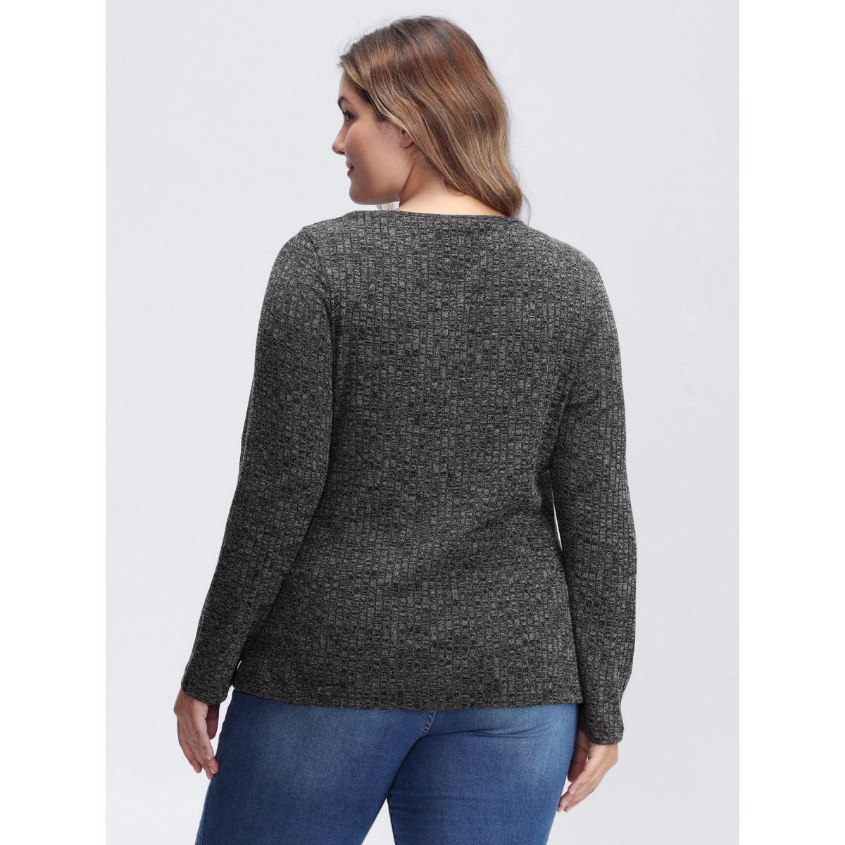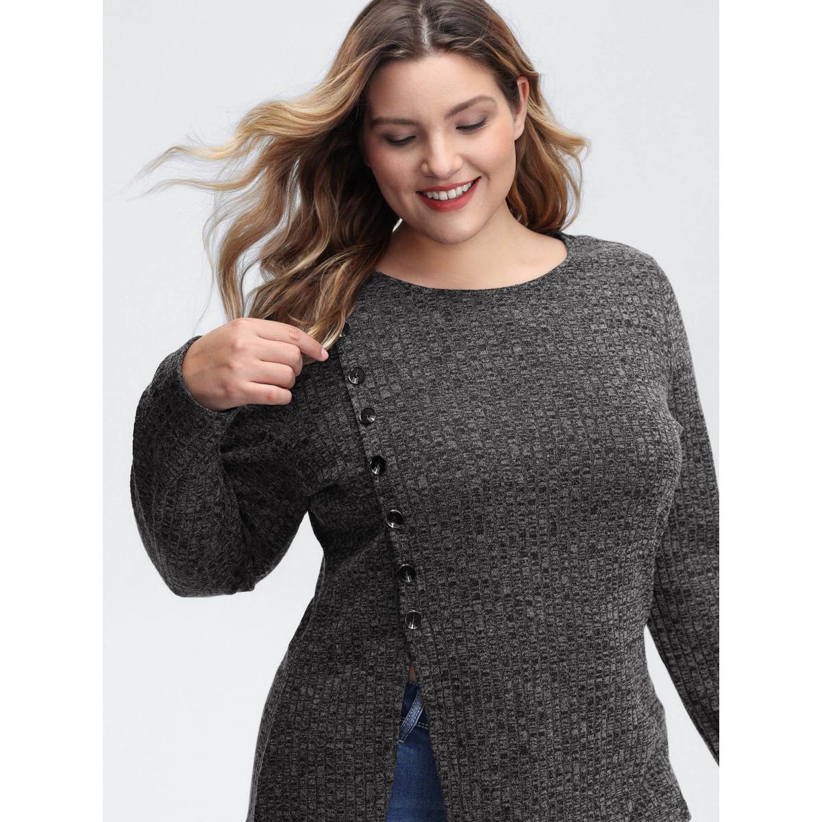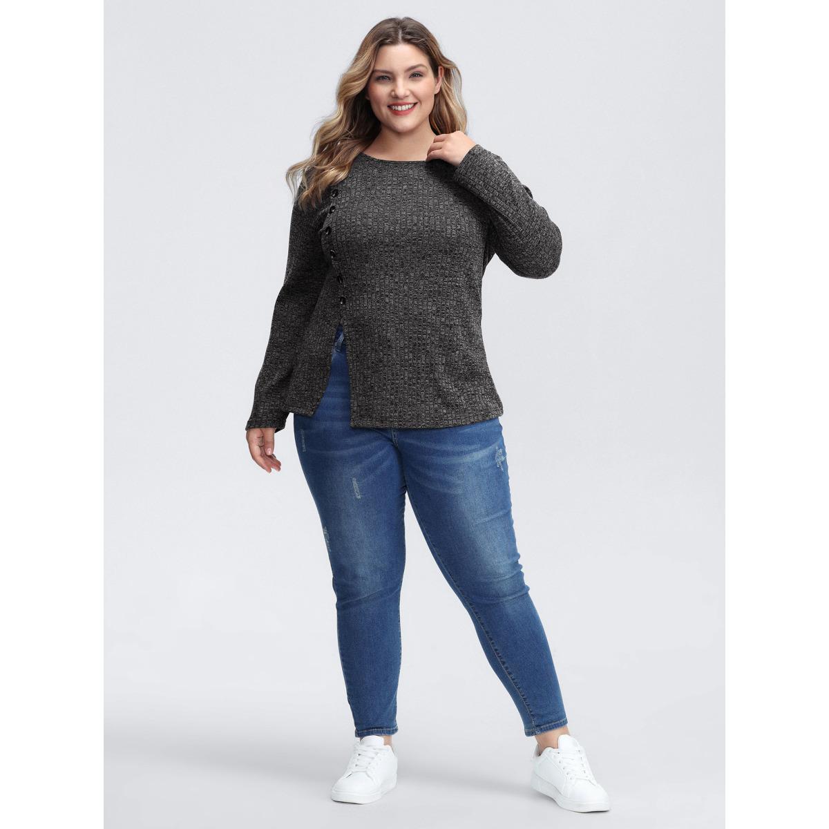 Plus Size Stretchy Side Button Detail Slit T-Shirt DimGray Women Leisure Texture Round Neck Bodycon Casual T-shirts BloomChic 22-24/3X