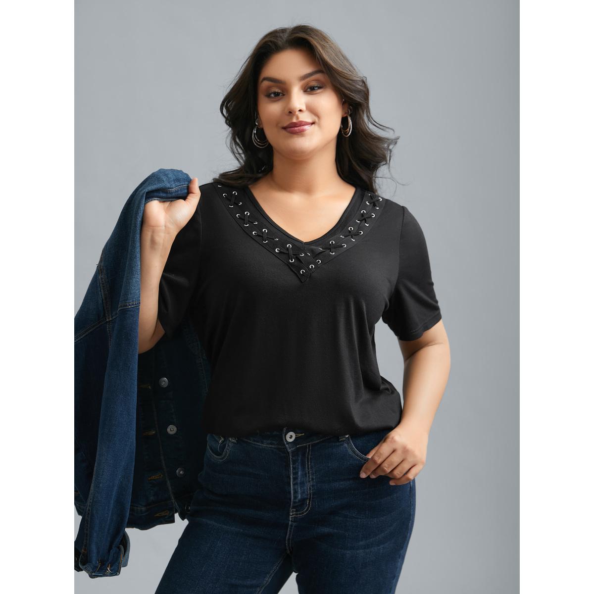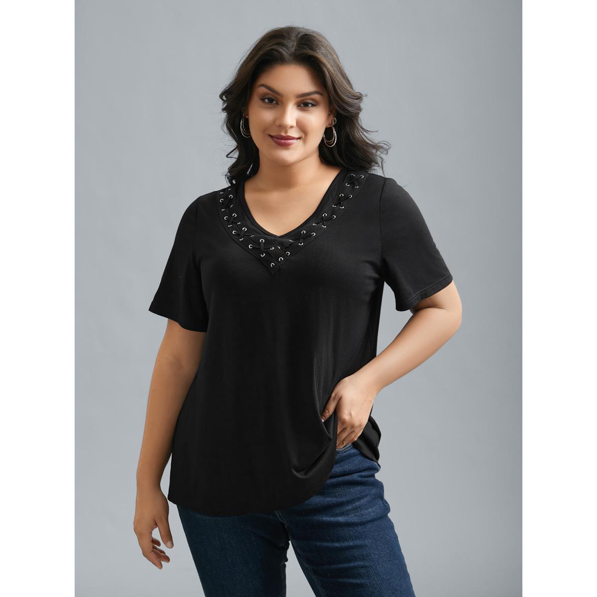 Plus Size Solid Cross Straps Eyelet T-shirt Black Women Casual Eyelet V-neck Everyday T-shirts BloomChic 28/5X