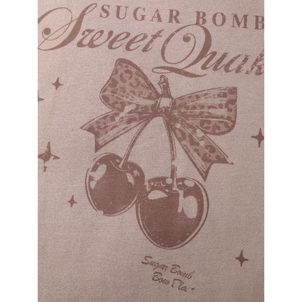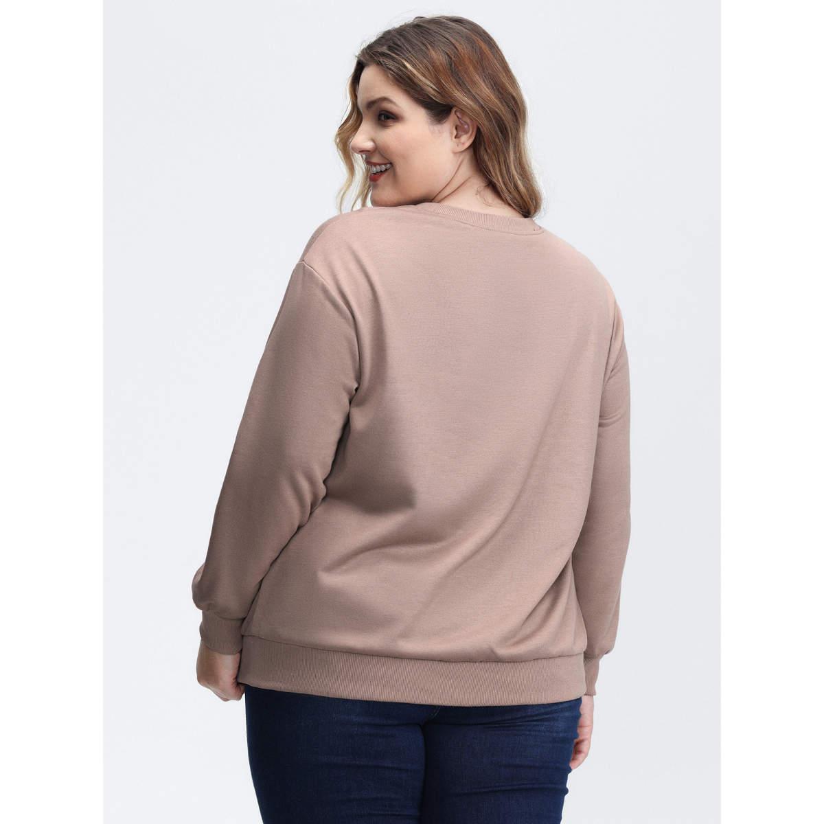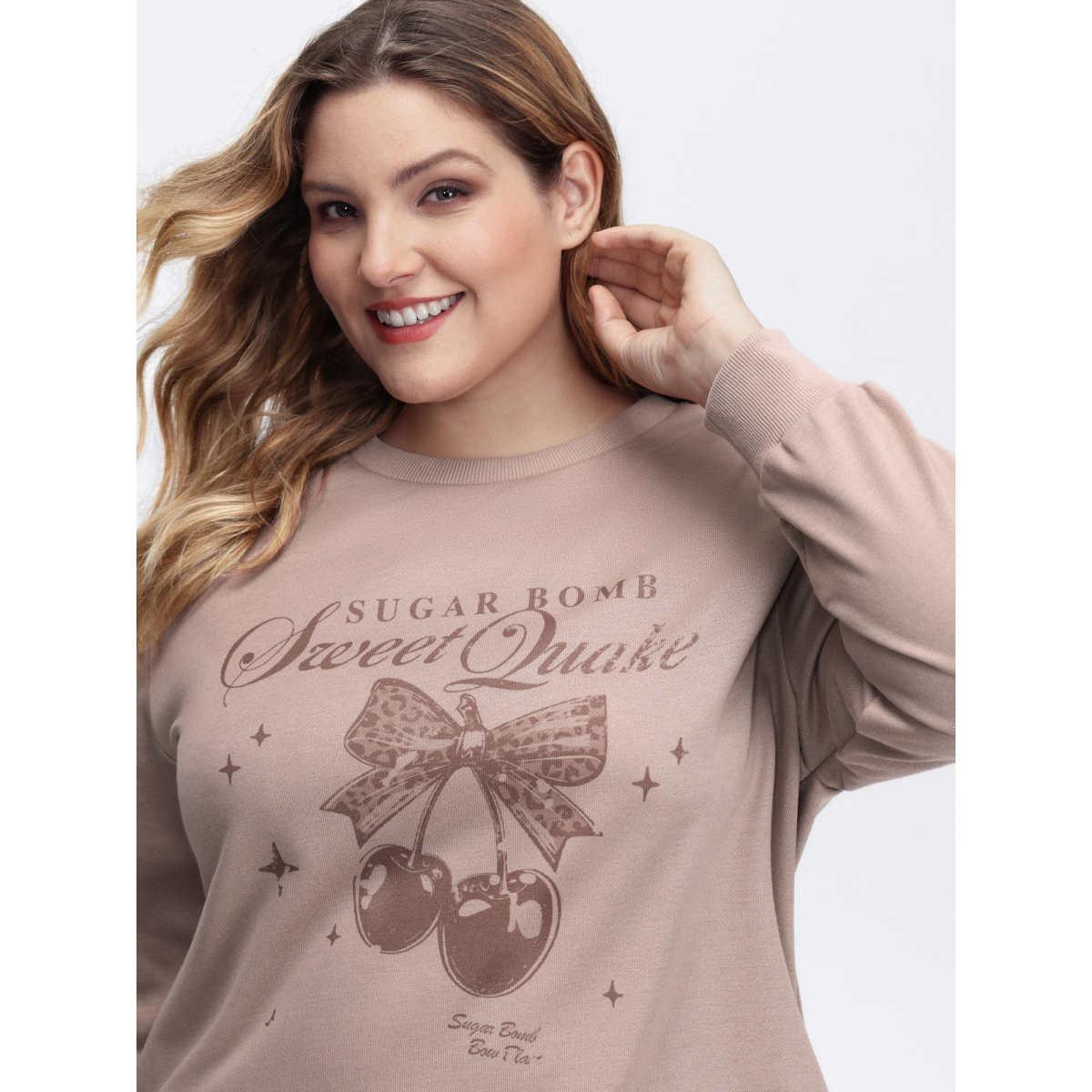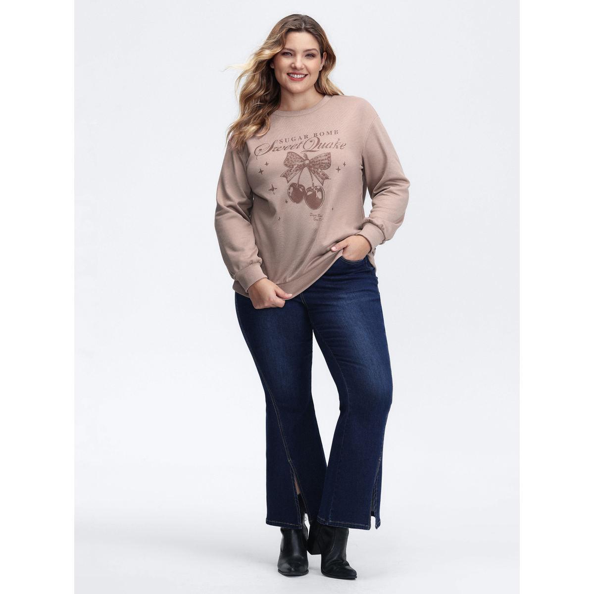 Plus Size Stretchy Vintage Cherry Print Loose Fit Sweatshirt Women LightBrown Leisure Round Neck Casual Sweatshirts BloomChic 10/M