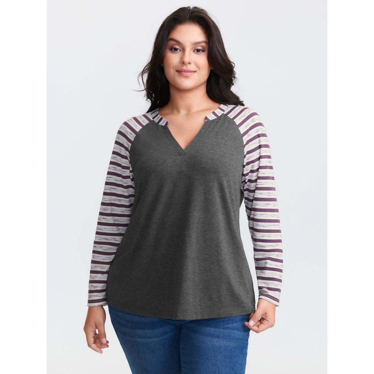 Plus Size Stripe Raglan Sleeve Round Neck T-Shirt DimGray Women Leisure Contrast Flat collar with V-notch Casual T-shirts BloomChic 30/6X