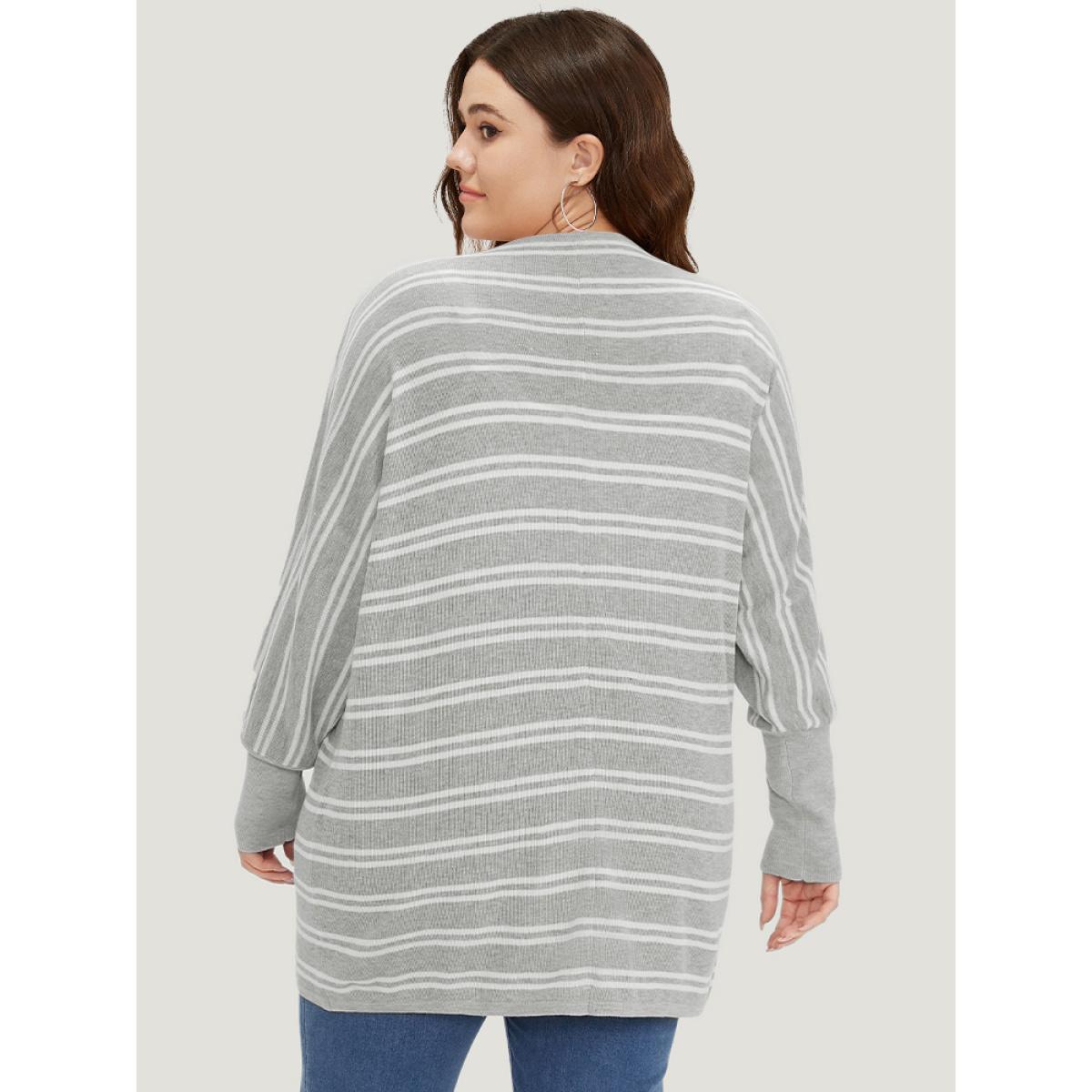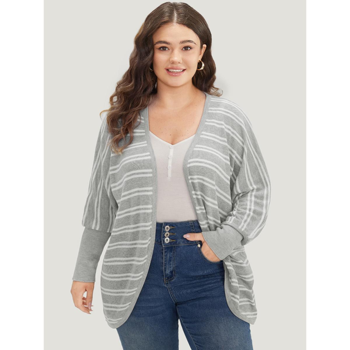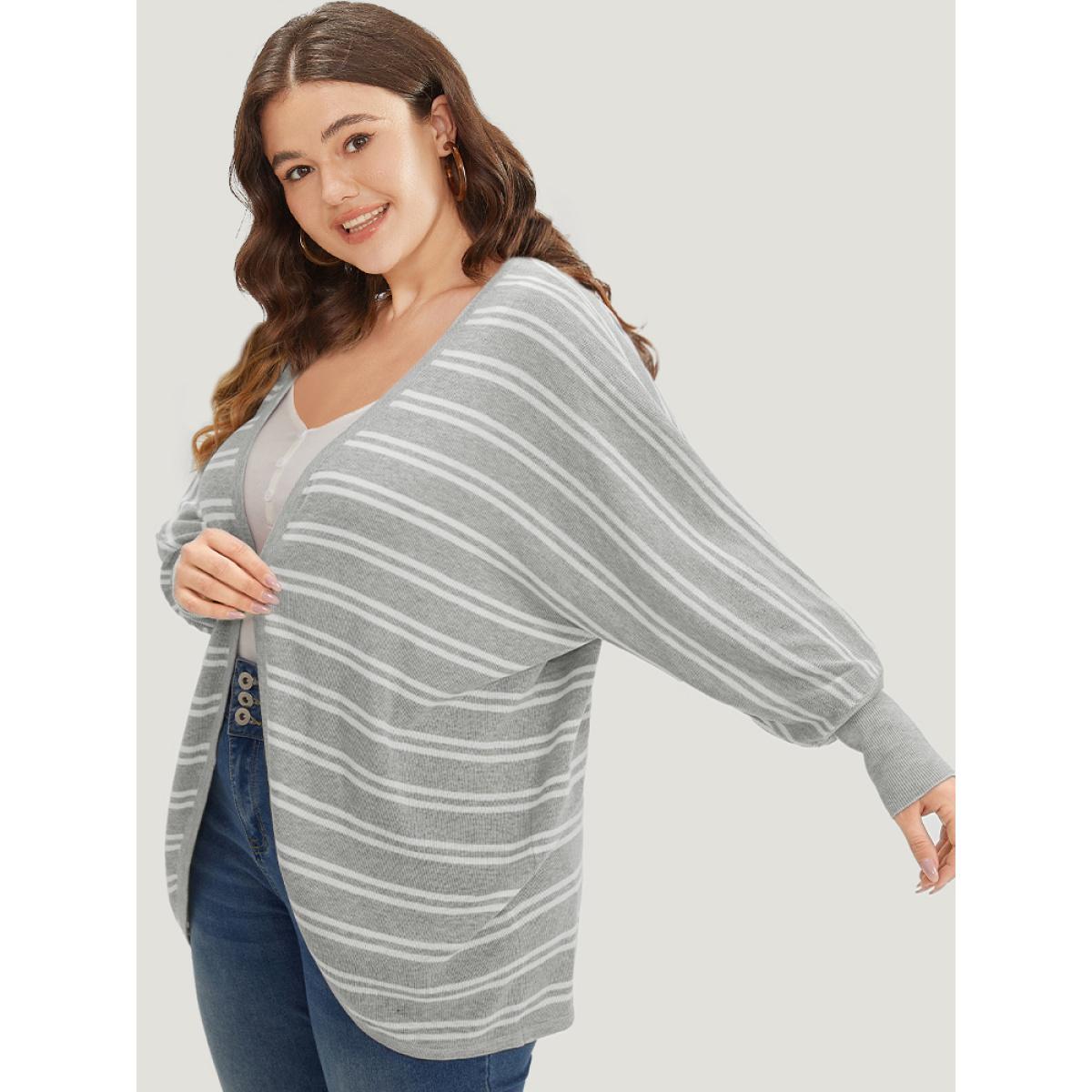 Plus Size Striped Elastic Cuffs Arc Hem Cardigan Silver Women Casual Loose Long Sleeve Everyday Cardigans BloomChic 28/5X