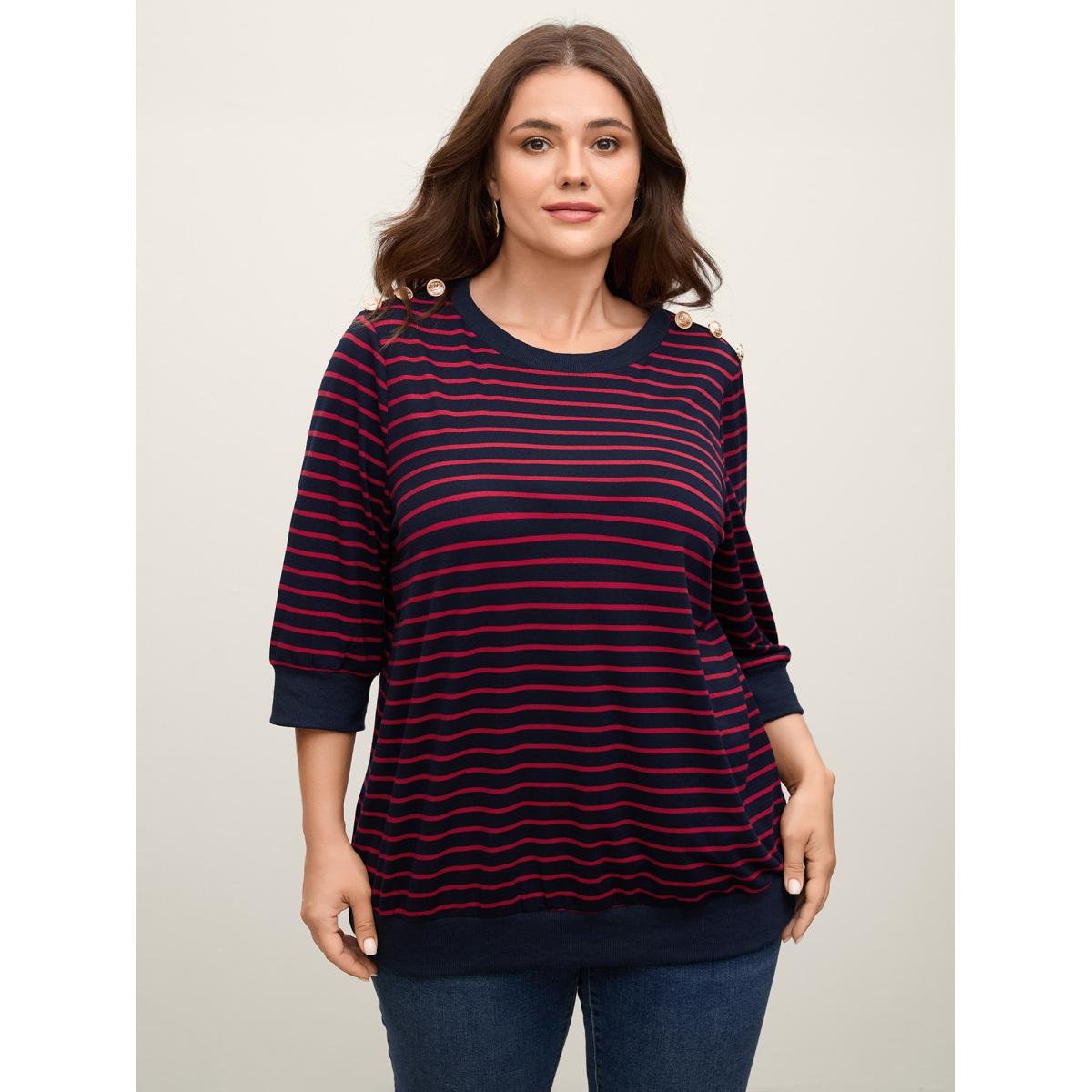 Plus Size Striped Three-Quarter Sleeve T-Shirt Indigo Women Contrast Round Neck Office T-shirts BloomChic 12/L
