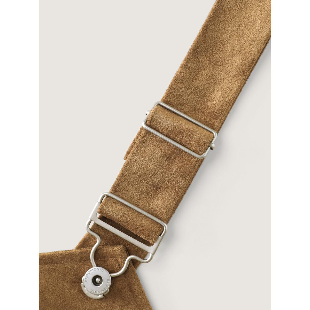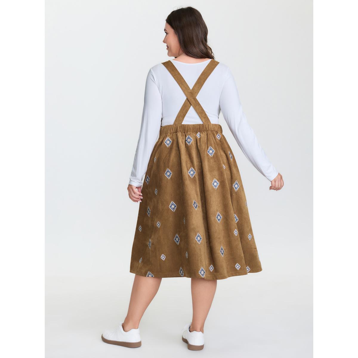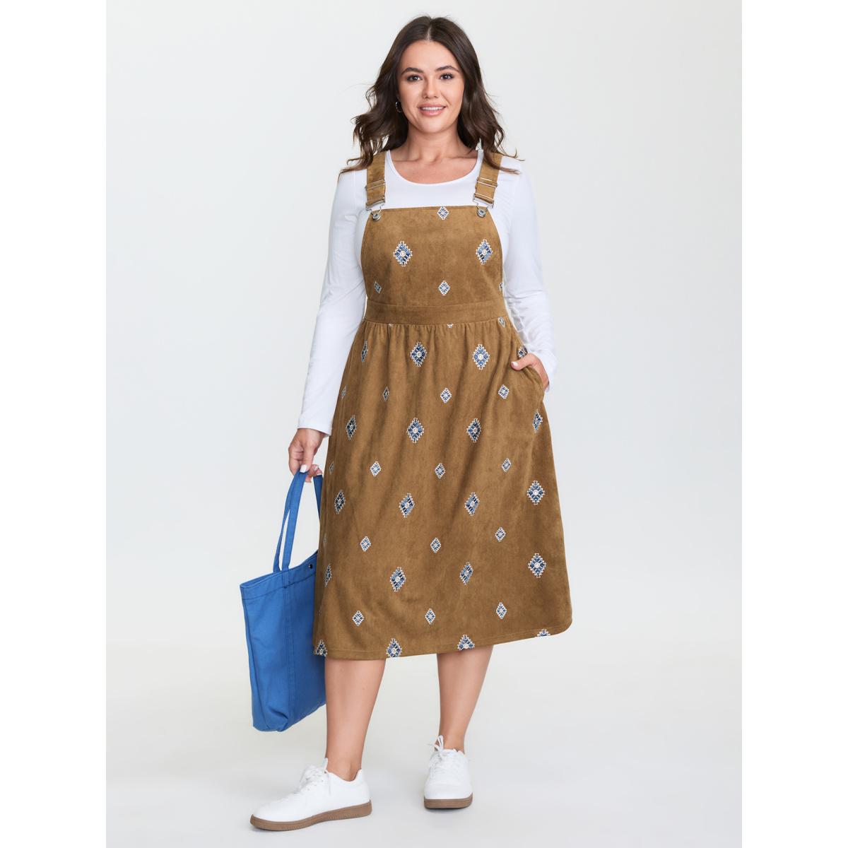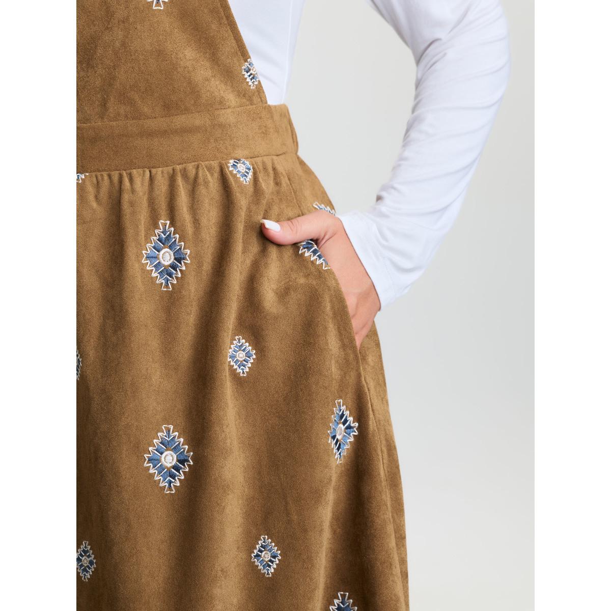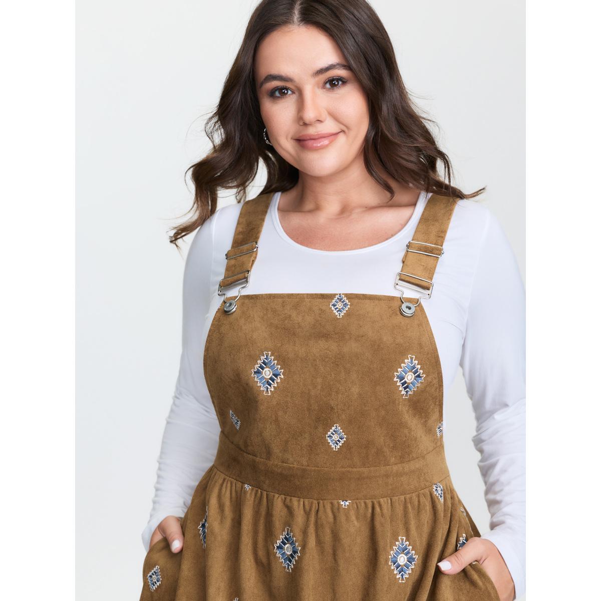 Plus Size Suede Embroidered Pockets Midi Overall Dress Yellowishbrown Women Leisure Gathered Square Neck Sleeveless Curvy BloomChic 12/L