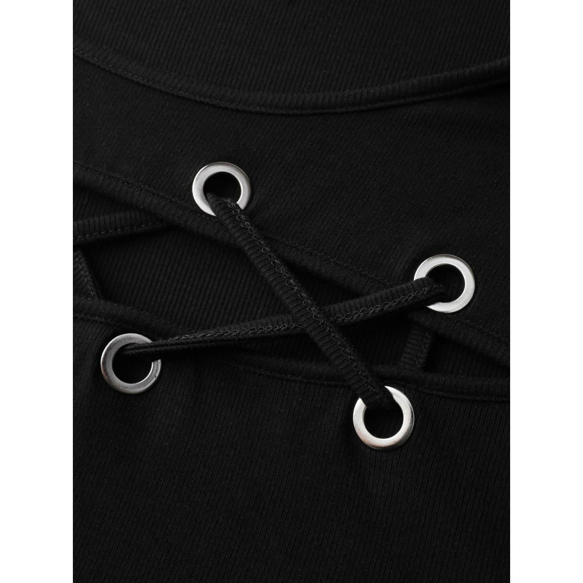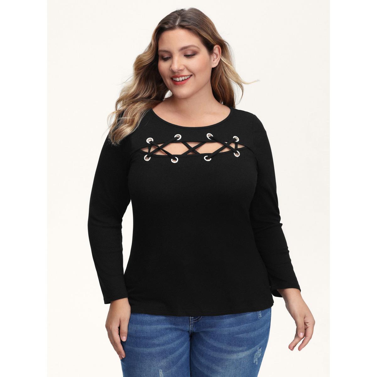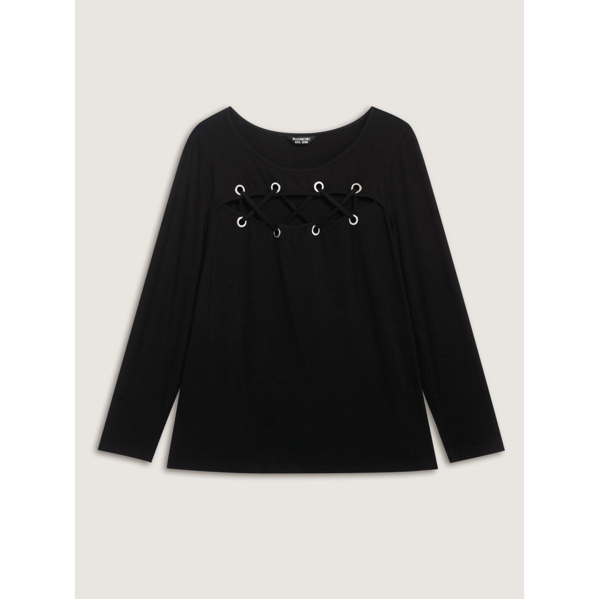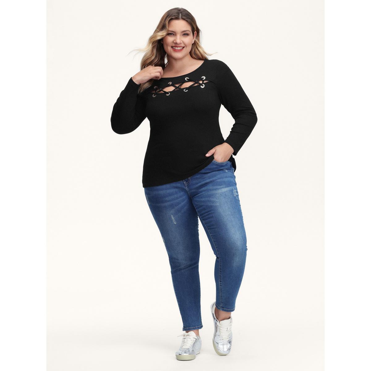 Plus Size Supersoft Cross-Tie Cut-Out Fitted T-Shirt Black Women Leisure Eyelet Round Neck Bodycon Casual T-shirts BloomChic 18-20/2X