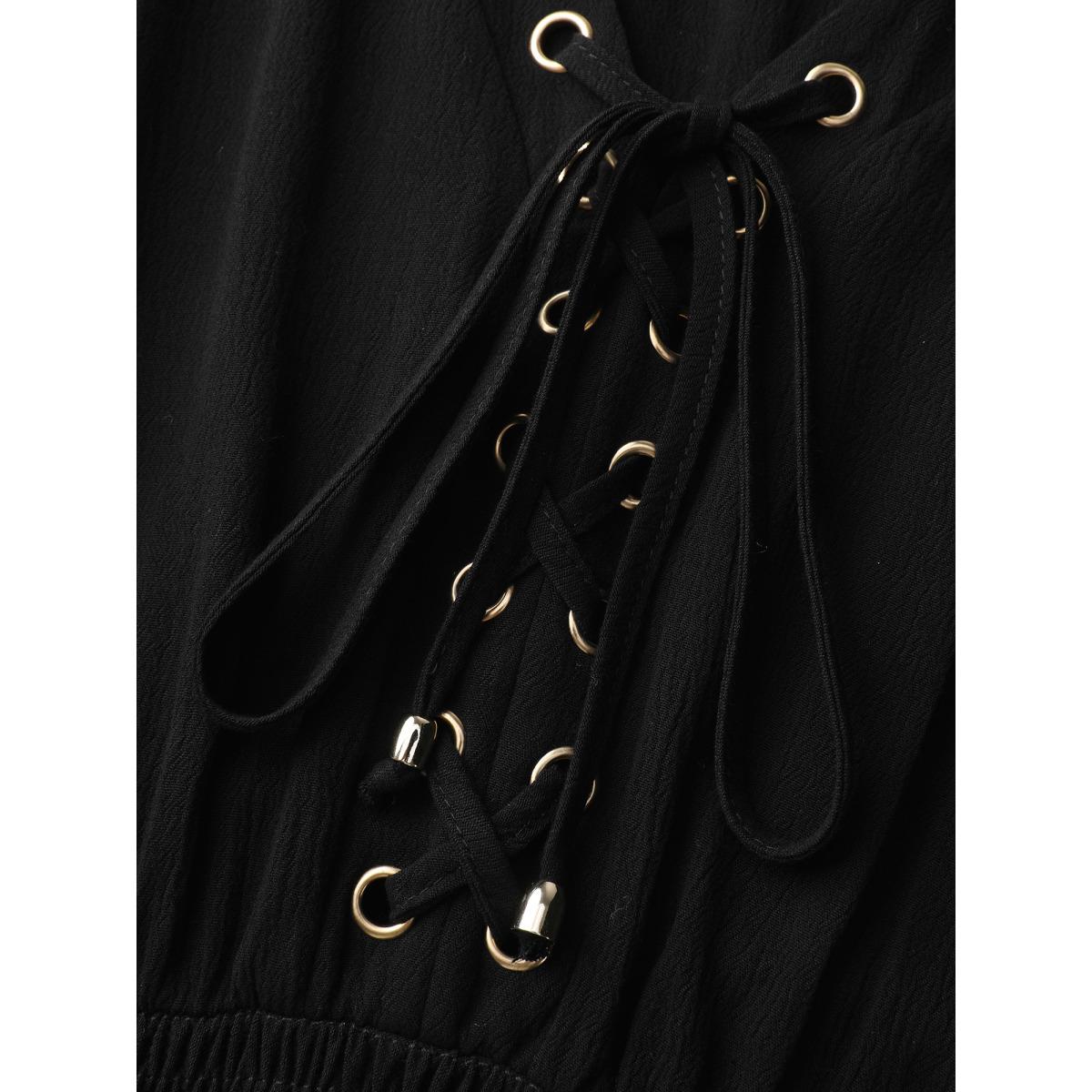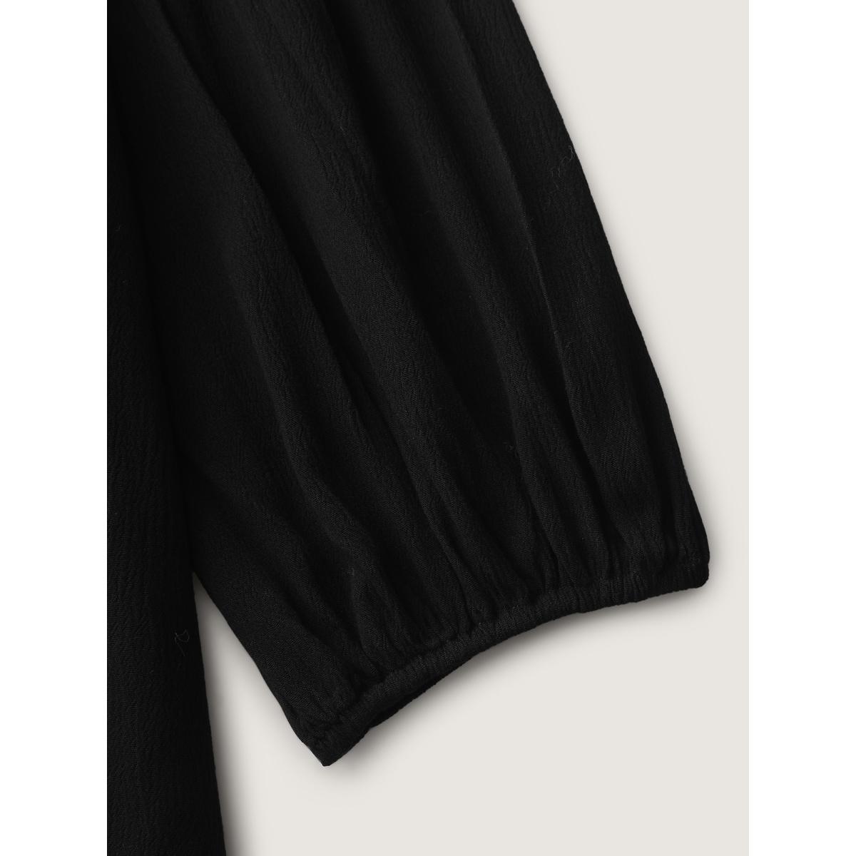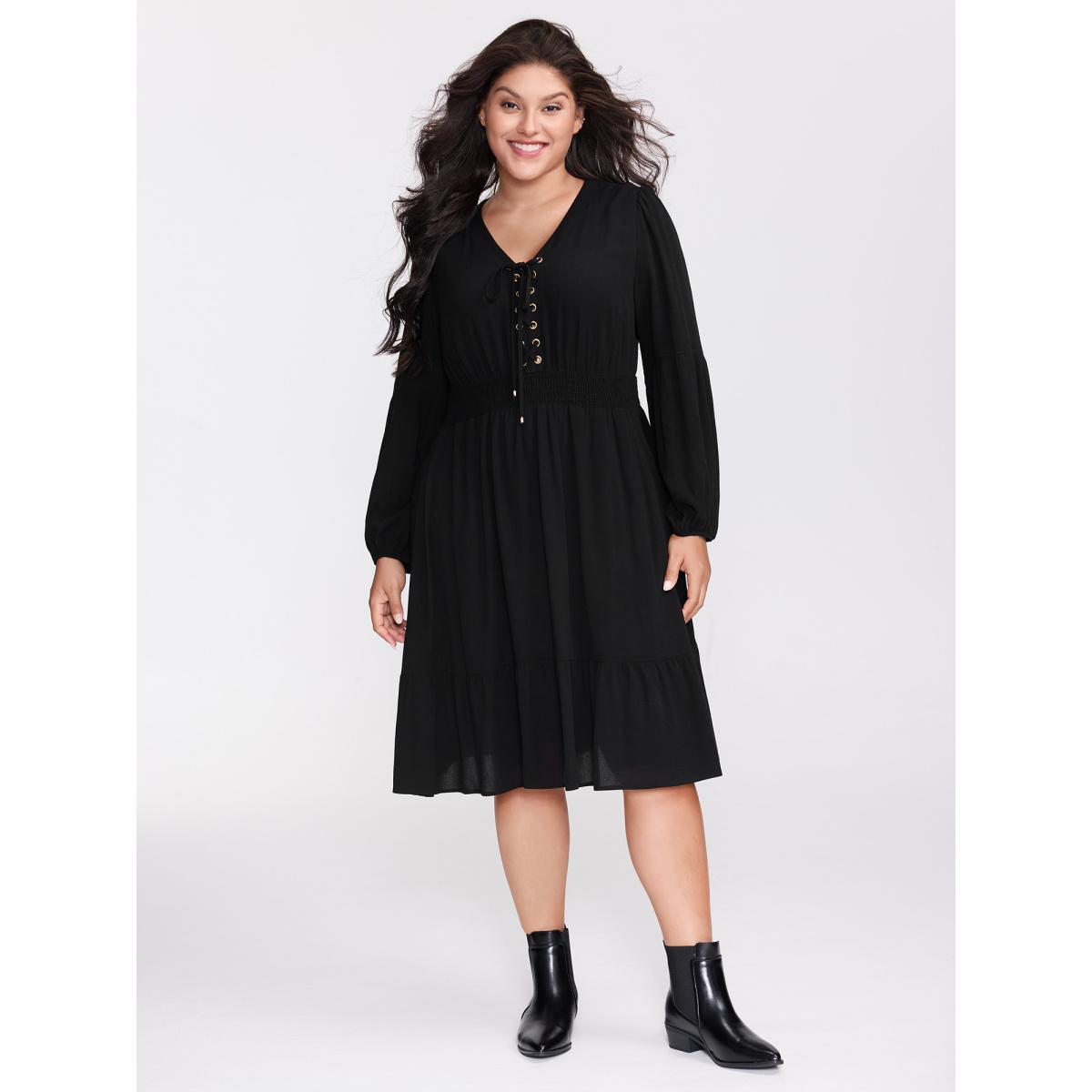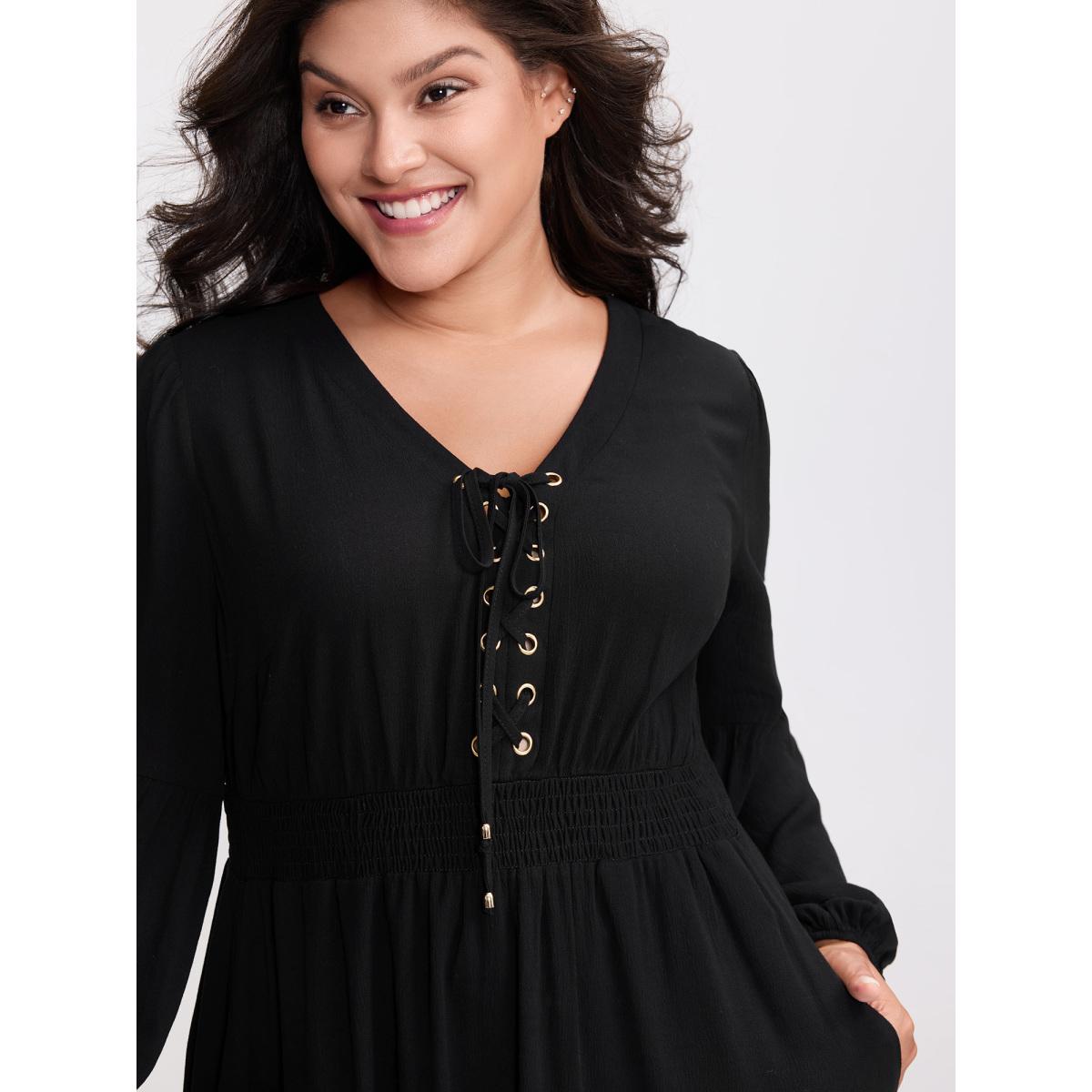 Plus Size Plain Lace Up Shirred Pocket Round Neck Dress Black Women Casual Plain Round Neck Long Sleeve Curvy Midi Dress BloomChic 12/L