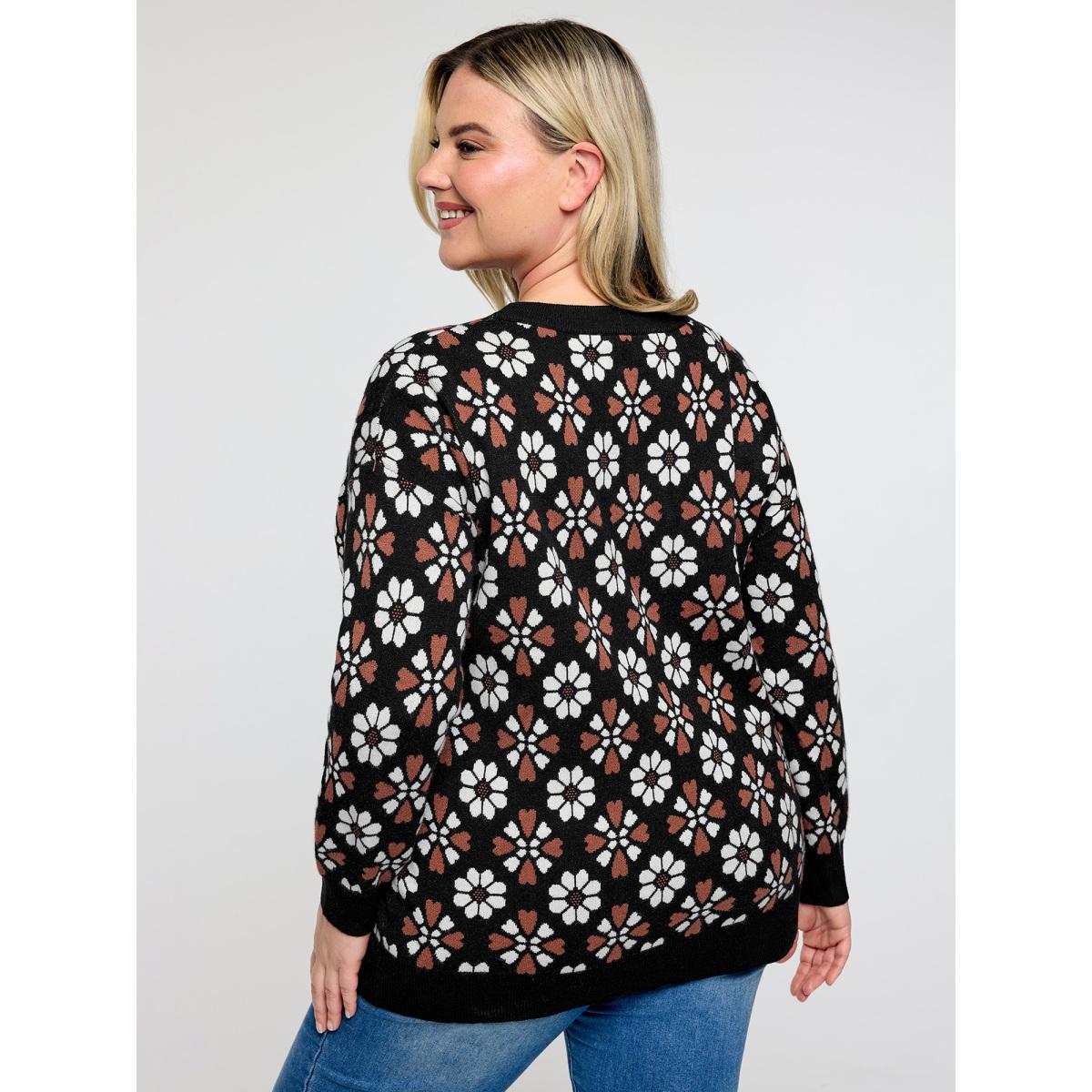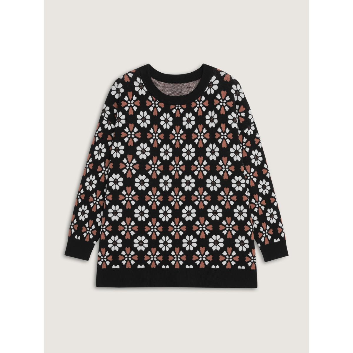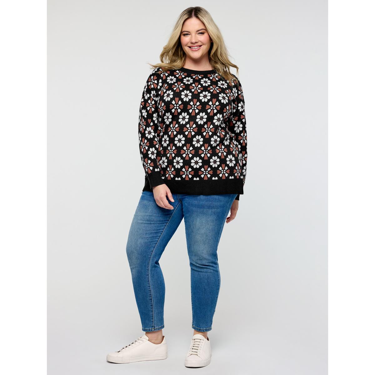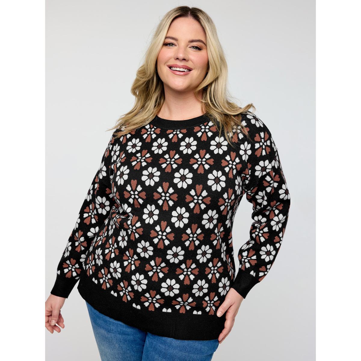 Plus Size Supersoft Floral Jacquard Contrast Pullover Black Women Leisure Loose Long Sleeve Round Neck Casual Pullovers BloomChic 30/6X