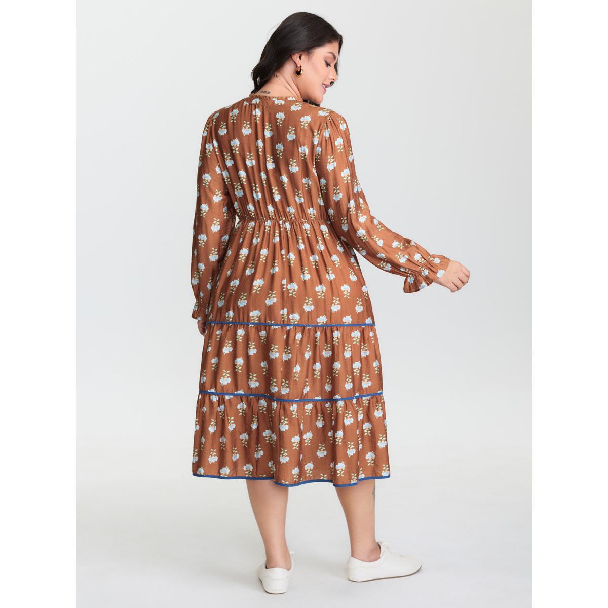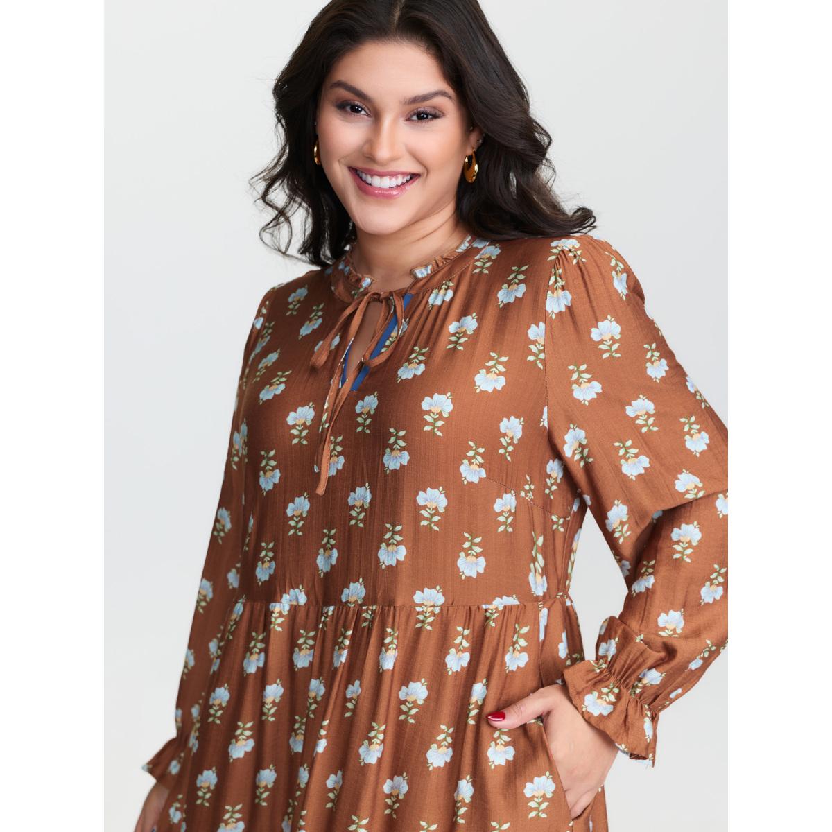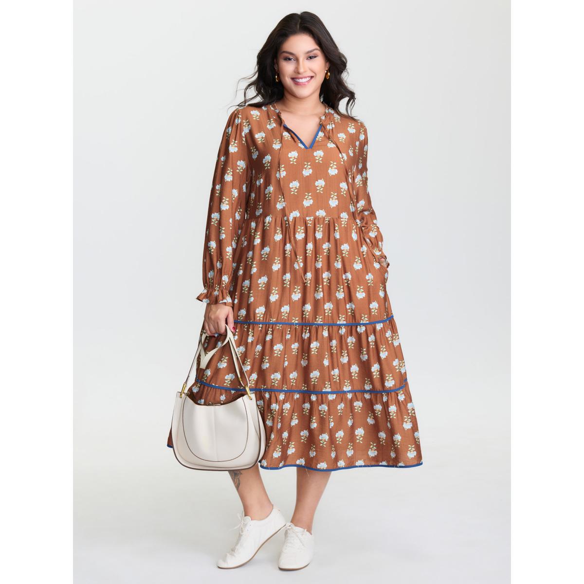 Plus Size Supersoft Floral Print Drawstring Neckline Midi Dress Multicolor Women Playful Tie knot Flat collar with V-notch Extra Long Sleeve Curvy BloomChic 18-20/2X