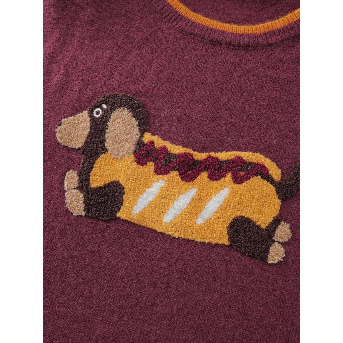 Plus Size Supersoft Hotdog Embroidered Color Contrast Pullover Deepred Women Playful Loose Long Sleeve Round Neck Casual Pullovers BloomChic 18-20/2X