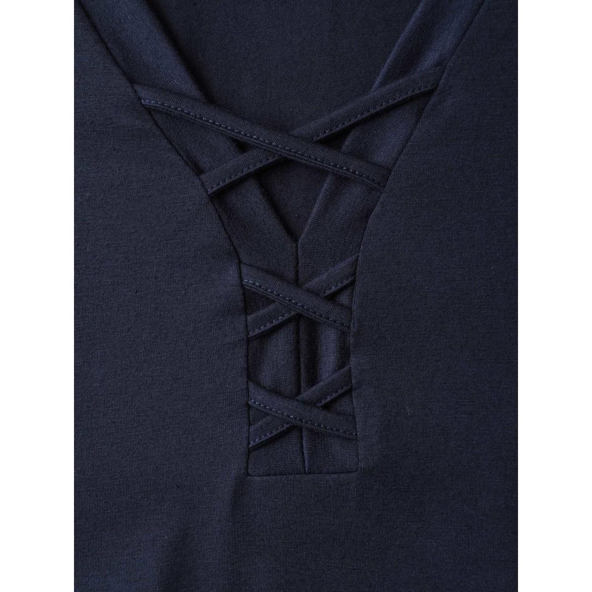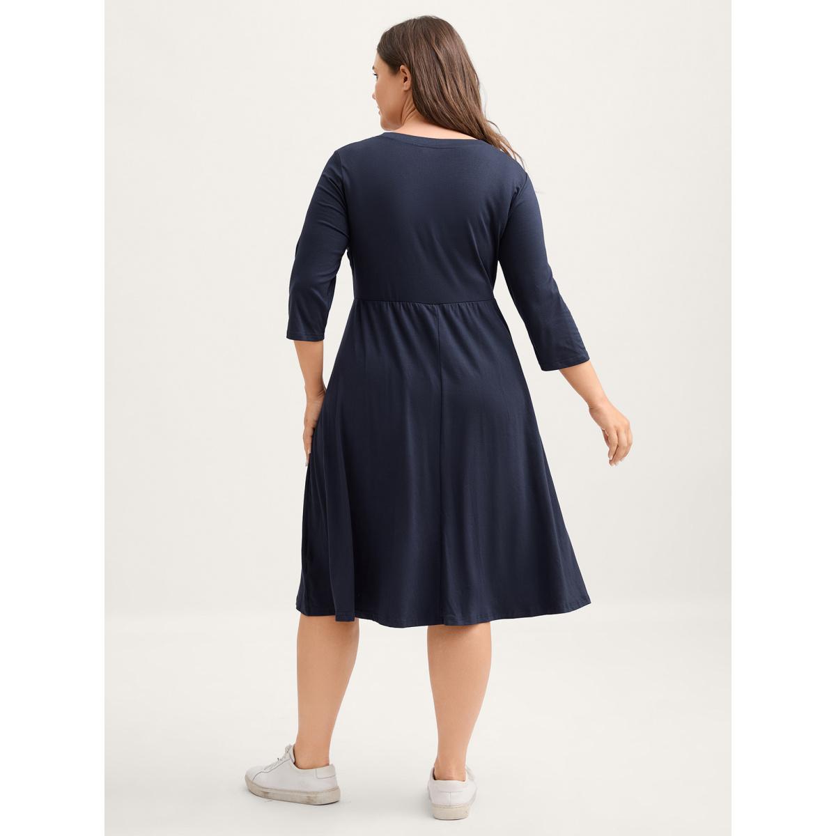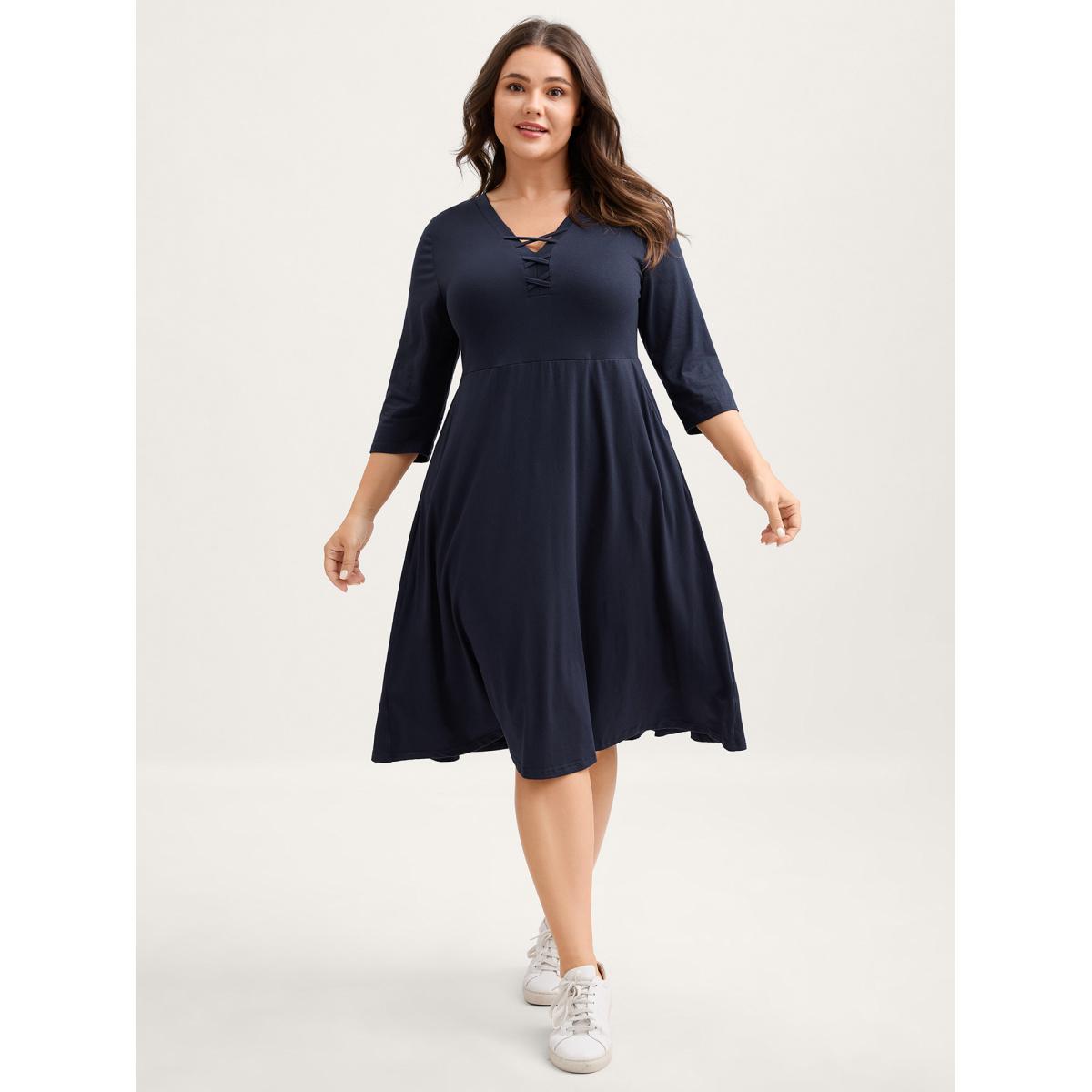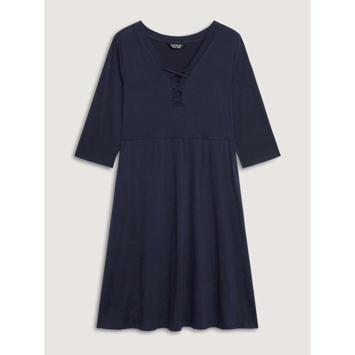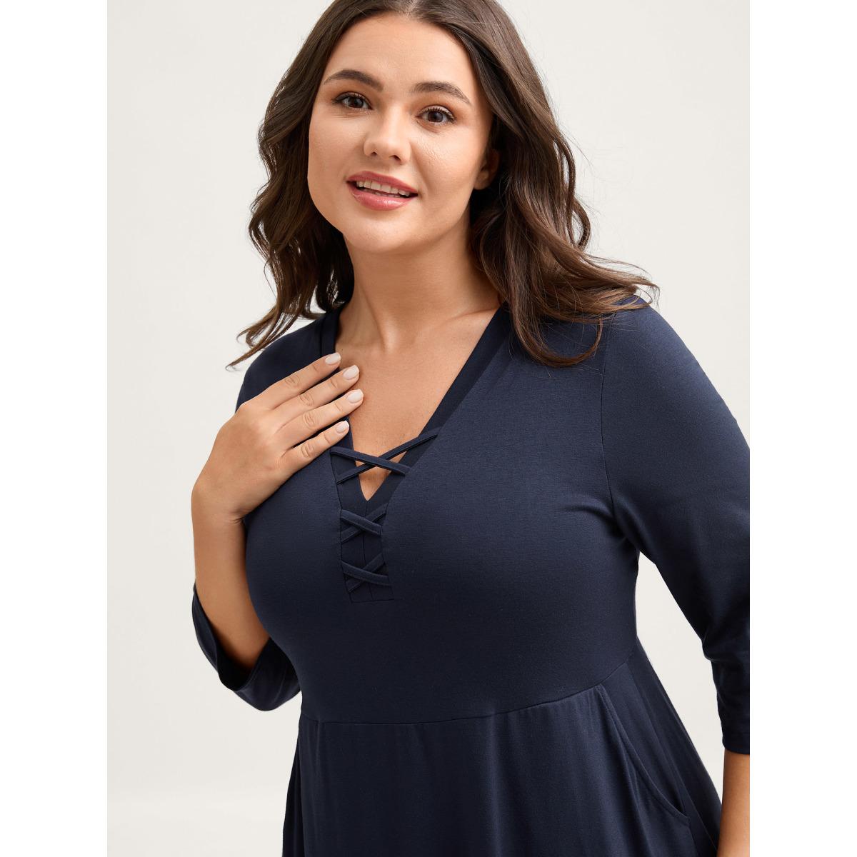 Plus Size Supersoft Neck Tie-Up Pockets Midi Dress Indigo Women Leisure Cross straps V-neck Elbow-length sleeve Curvy BloomChic 14-16/1X