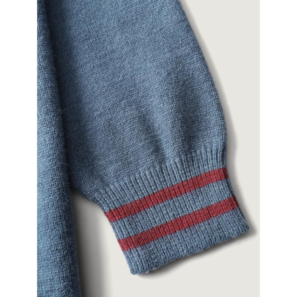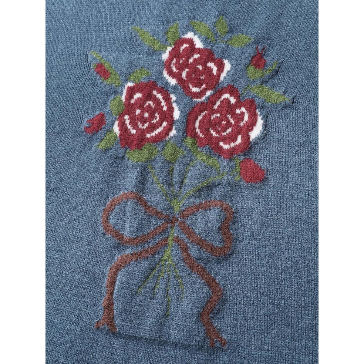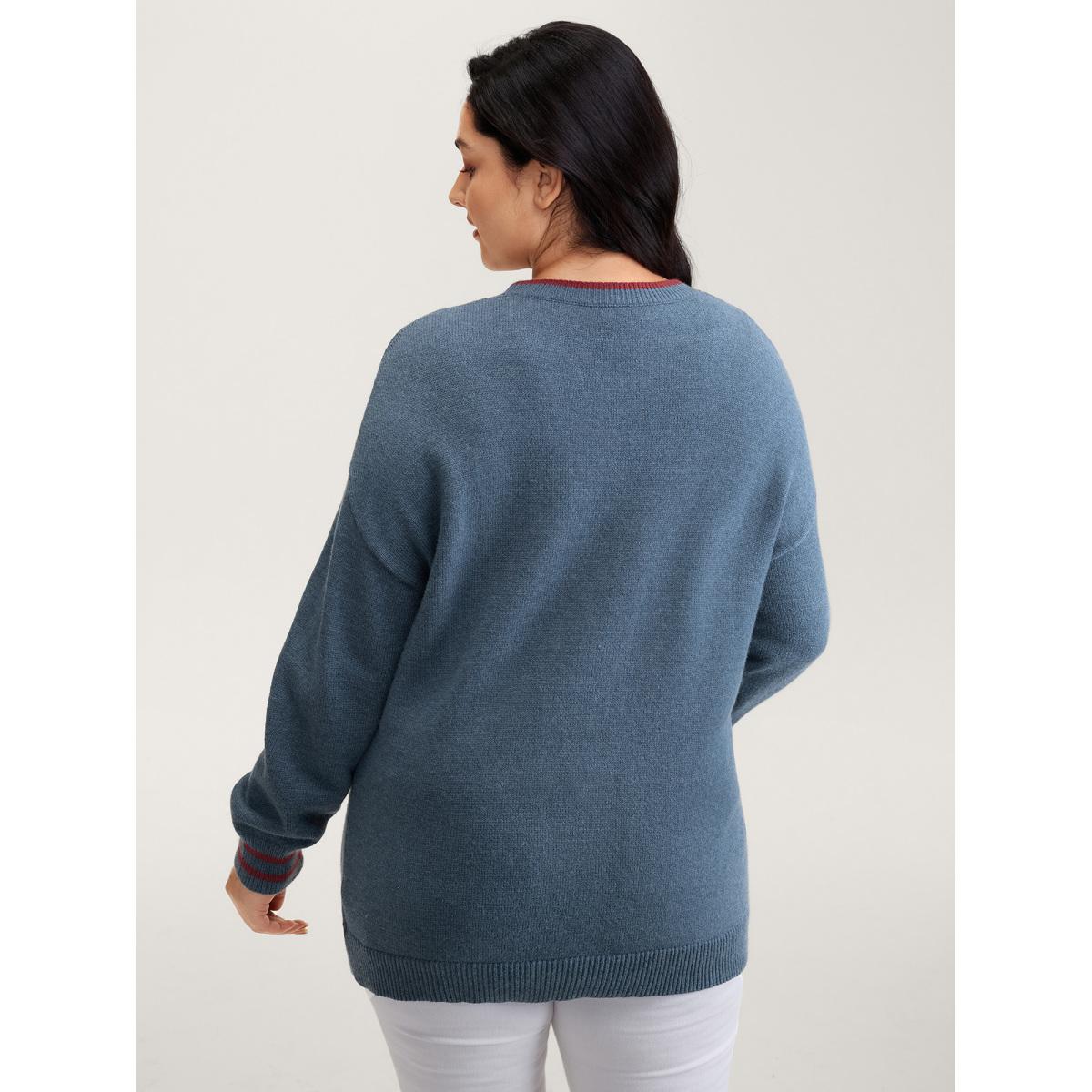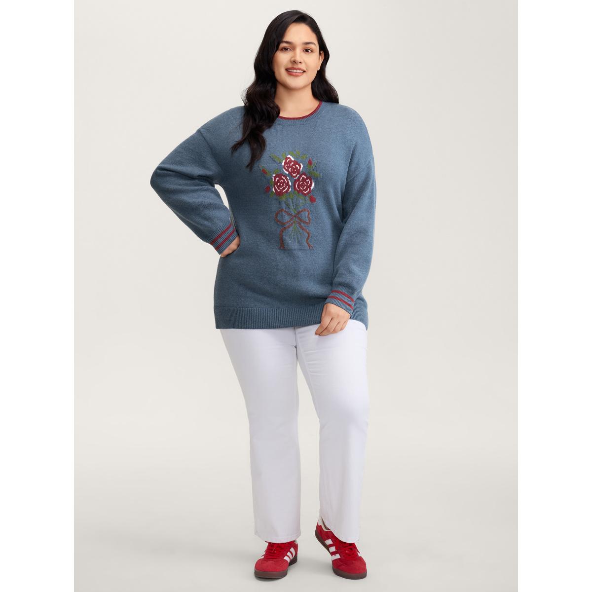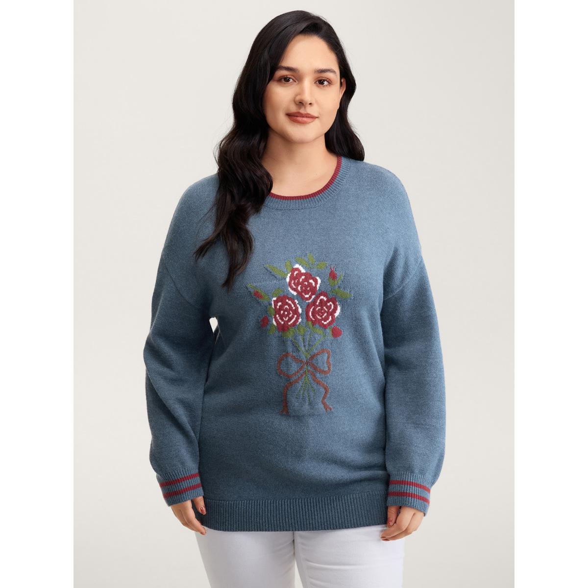 Plus Size Supersoft Rosy Motif Contrast Round Neck Pullover Mediumblue Women Leisure Loose Long Sleeve Round Neck Casual Pullovers BloomChic 14-16/1X