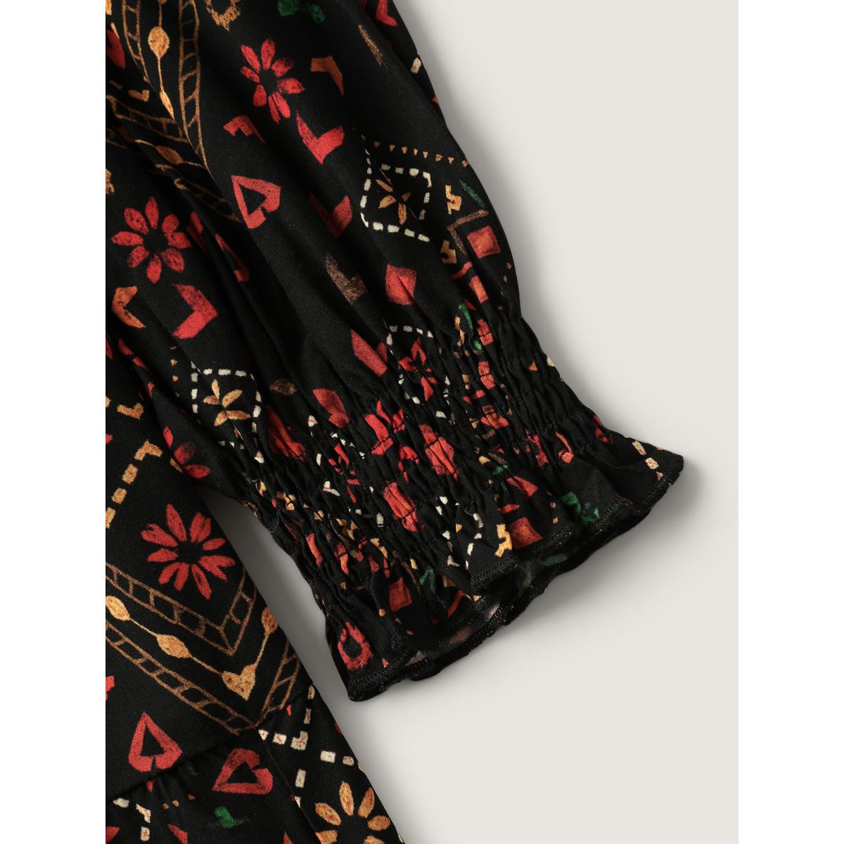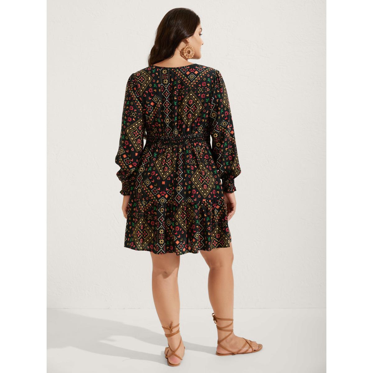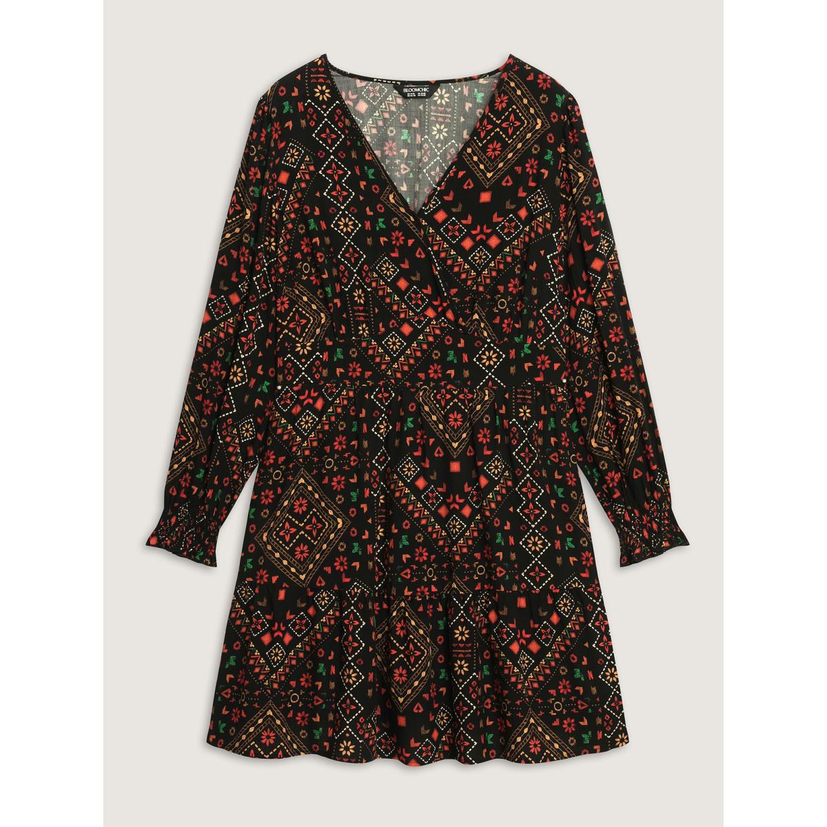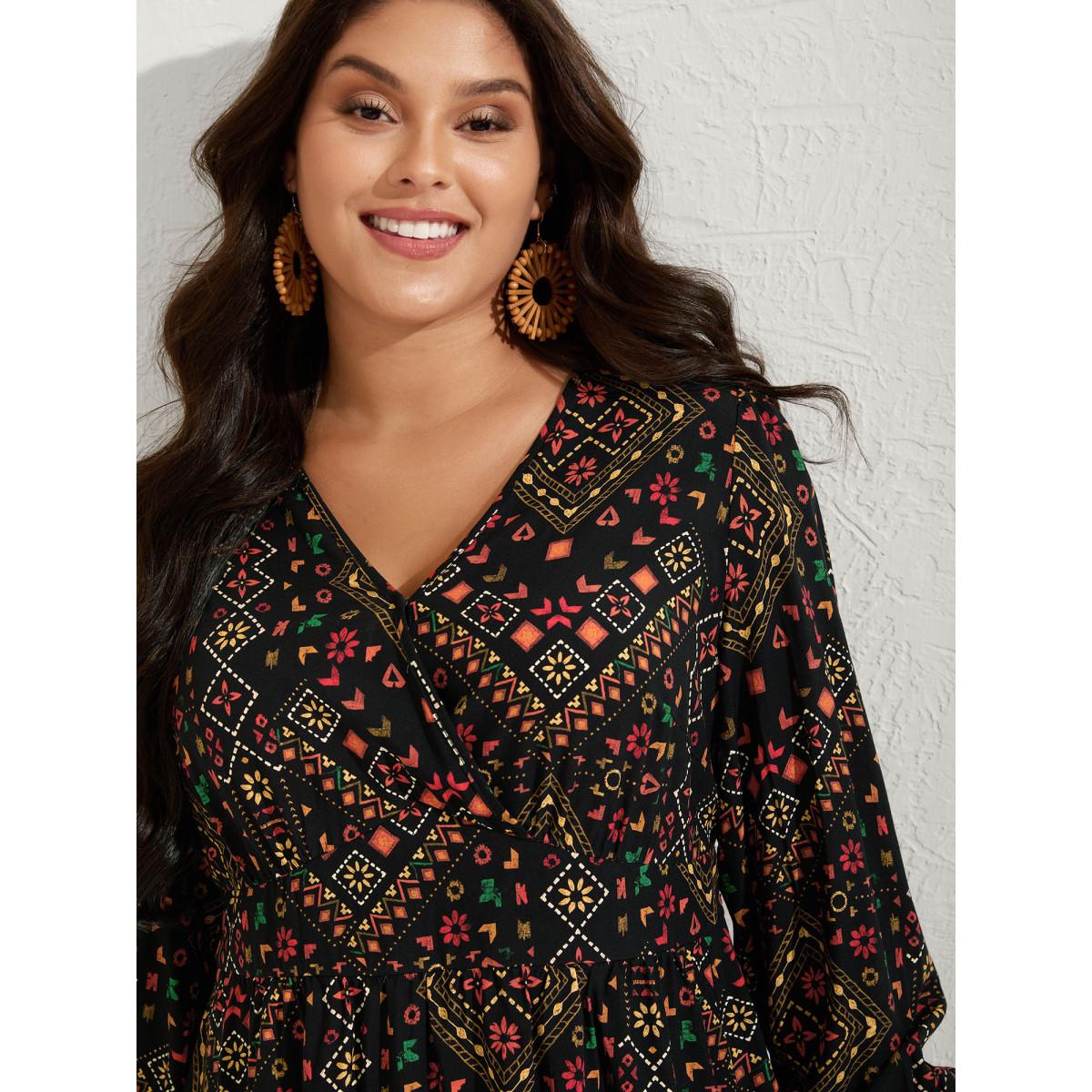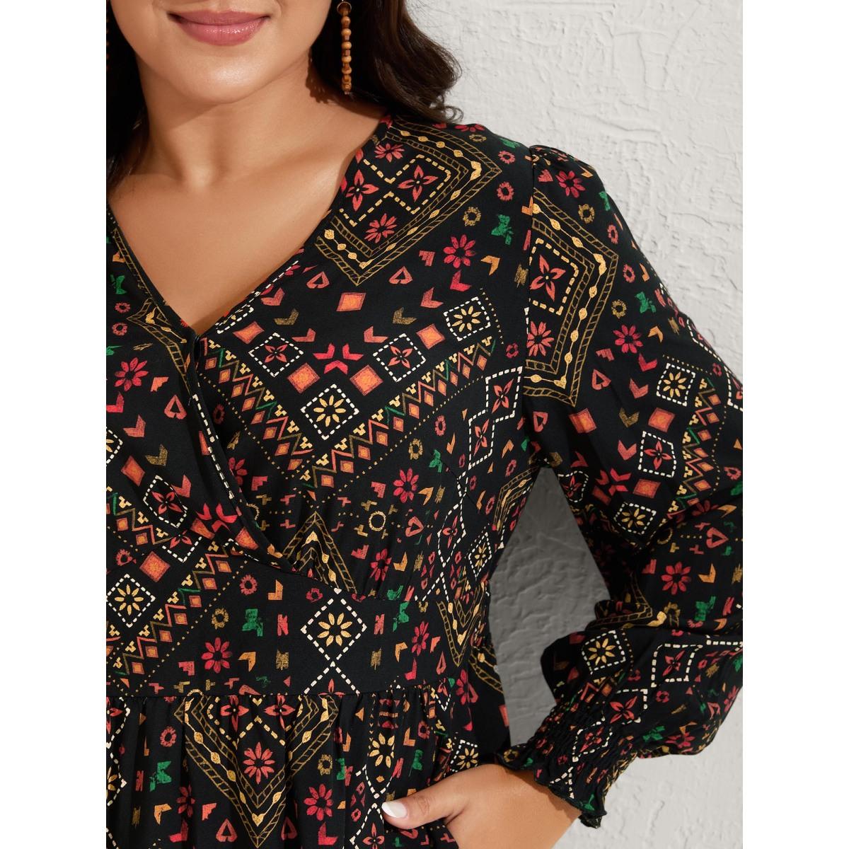 Plus Size Supersoft Shirred Boho Collage Midi Dress Multicolor Women Boho Overlapping Overlap Collar Extra Long Sleeve Curvy BloomChic 28/5X