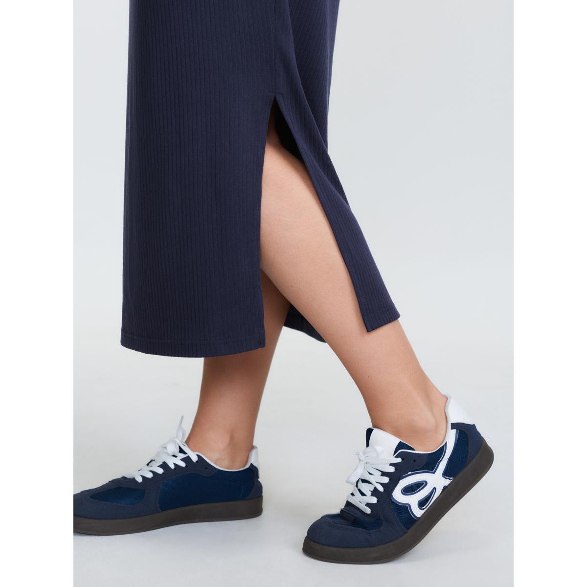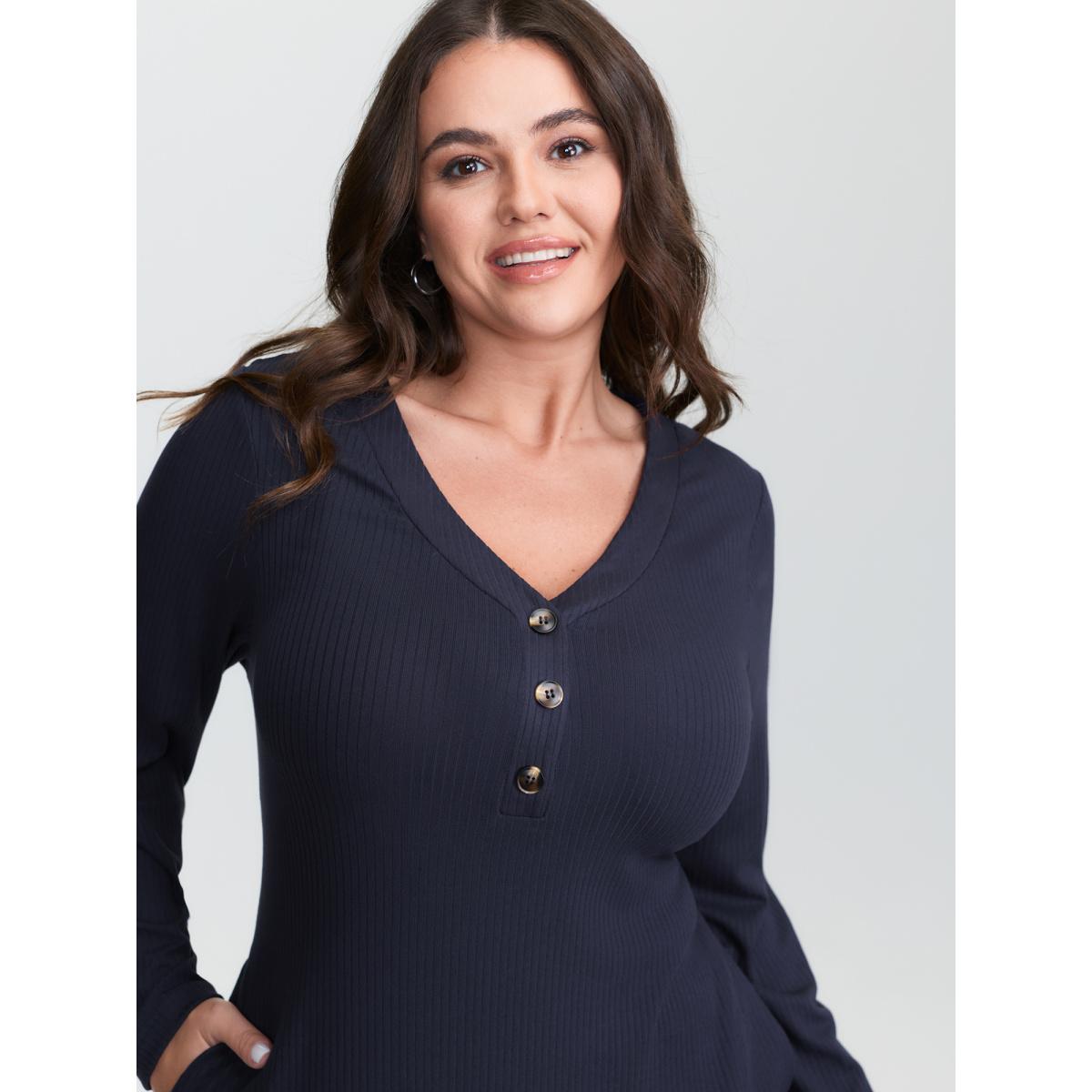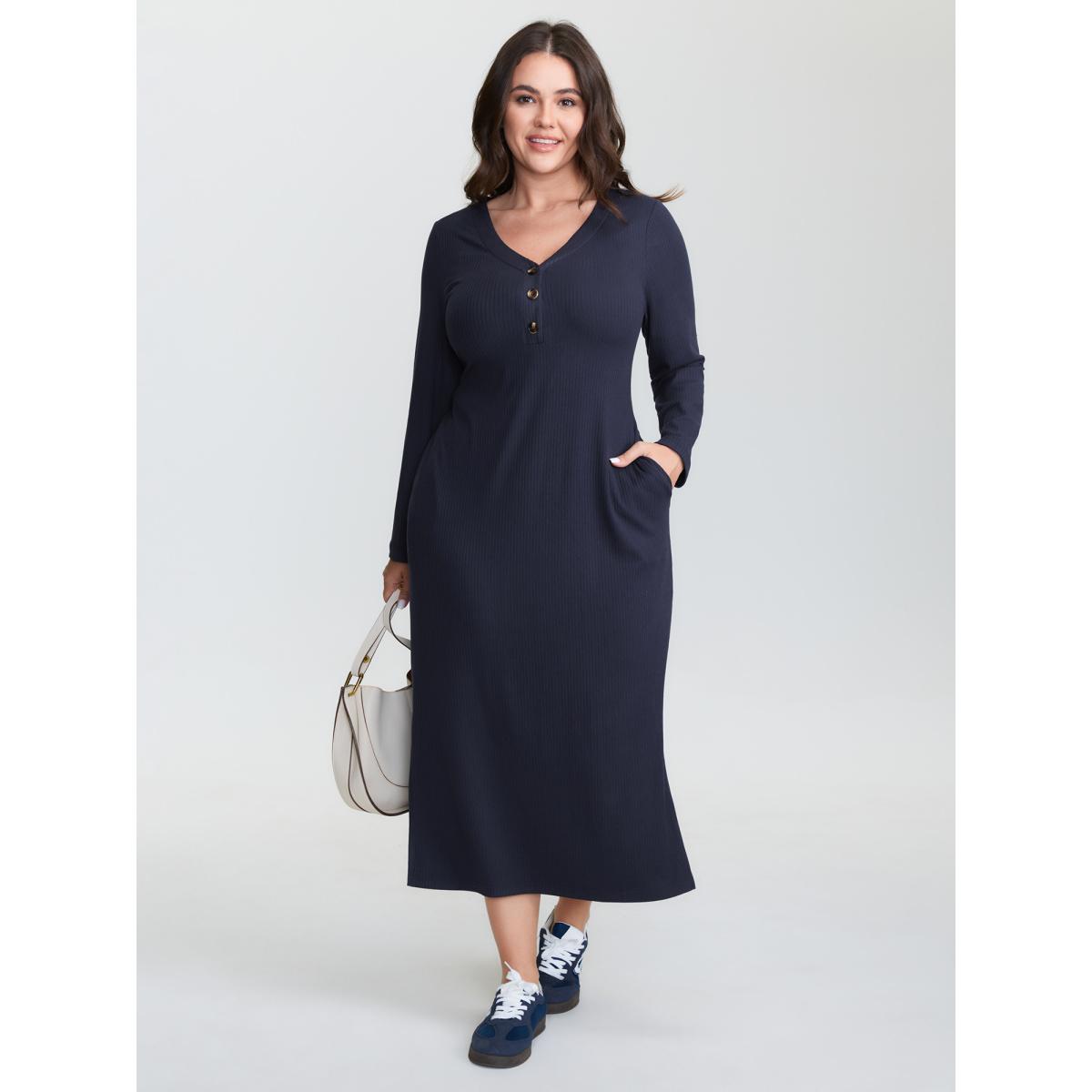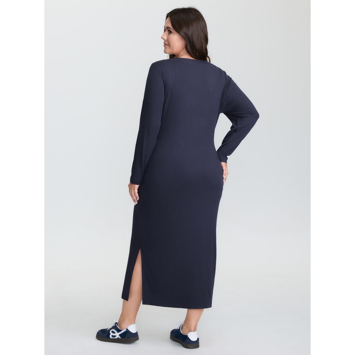 Plus Size Supersoft Textured Fitted Side Hem Midi Dress Midnight Women Leisure Texture V-neck Extra Long Sleeve Curvy BloomChic 22-24/3X